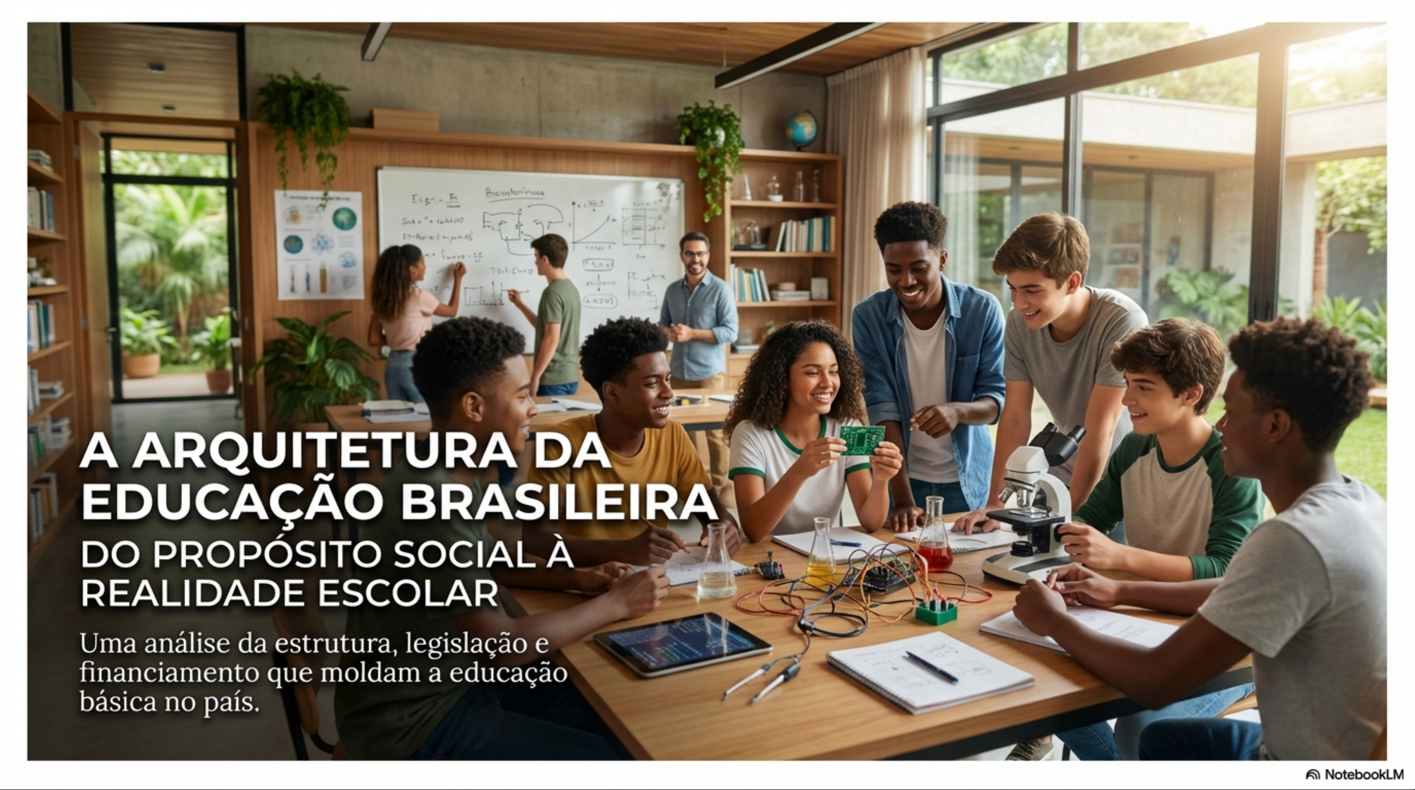 A ARQUITETURA DA EDUCAÇÃO BRASILEIRA DO PROPÓSITO SOCIAL À REALIDADE ESCOLAR Uma análise da estrutura, legislação e financiamento que moldam a educação básica no país. NotebookLMA EDUCAÇÃO É UM SOCIAL ESTADO E UM PILAR DA CIDADANIA. Estado: Conjunto de instituições permanentes (órgãos legislativos, tribunais, etc.) que possibilitam a ação do governo. A educação escolar não existe em um GOVERNO Governo: Conjunto de programas e vácuo. Ela é um subsistema do sistema projetos que uma parte da sociedade propõe para 0 todo, configurando a social, influenciada pela economia, orientação política de um determinado política e relações de poder, e ao período. mesmo tempo, um agente transformador da sociedade. Seu POLÍTICAS PÚBLICAS Politicas Públicas: São 'Estado em propósito fundamental é formar um ação'. No campo da educação, são as ações governamentais (federais, determinado tipo de homem e de estaduais ou municipais) que visam sociedade. garantir direito à educação para bem coletivo. Baseado em Hôfling (2001) e Luckesi (1990). NotebookLMA RELAÇÃO DE TROCA CONTÍNUA ENTRE A ESCOLA E A SOCIEDADE Fluxo: A Sociedade Fluxo: Sistema Escolar Contribui com a Escola Contribui com a Sociedade Conteúdo Cultural: Melhoria do Nível Conhecimentos, cultura e Cultural: Ampliação do descobertas que formam universo cultural da os currículos. população. Recursos Humanos: Aperfeiçoamento Professores, Individual: Maiores administradores e técnicos. chances de realização pessoal e profissional. Recursos Financeiros: SISTEMA Impostos e investimentos SOCIEDADE ESCOLAR que mantêm sistema. Formação de Recursos Humanos: Qualificação de trabalhadores para a Recursos Materiais: economia. Tecnologia, infraestrutura e material didático. Inovações Científicas e Tecnológicas: Pesquisas Alunos: A razão de ser que impulsionam o do sistema escolar. progresso. Baseado em Dias (1998). NotebookLMA CONSTITUIÇÃO DE 1988: ALICERCE LEGAL DA EDUCAÇÃO COMO DIREITO E DEVER A Constituição Federal de 1988, chamada de "Constituição redefine a educação no Brasil, estabelecendo-a como um pilar para desenvolvimento do país e de seus cidadãos. ART. 6°: UM DIREITO SOCIAL ART. 205: DIREITO, DEVER E FUNDAMENTAL FINALIDADE "São direitos sociais a educação, a saúde, "A educação, direito de todos e dever do trabalho, a moradia, lazer..." Estado e da família, será promovida e incentivada com a colaboração da sociedade..." Implicação: A educação é elevada ao status de direito fundamental de todo cidadão. 1. Pleno desenvolvimento da pessoa. 2. Preparo para exercício da cidadania. 3. Qualificação para trabalho. NotebookLMPRINCÍPIOS QUE REGEM ENSINO NO BRASIL o Artigo 206 da Constituição detalha os valores fundamentais que devem nortear a prática educacional. I. IGUALDADE: de II. LIBERDADE: III. PLURALISMO: IV. GRATUIDADE: condições para 0 acesso de aprender, ensinar, de ideias e de concepções do ensino público em e permanência na escola. pesquisar e divulgar pedagógicas. estabelecimentos oficiais. pensamento, a arte e saber. V. VALORIZAÇÃO VI. GESTÃO DOS PROFISSIONAIS: VII. GARANTIA DEMOCRÁTICA: com planos de carreira DE PADRÃO DE do ensino público, e ingresso por QUALIDADE. na forma da lei. concurso público. NotebookLMA LEI DE DIRETRIZES E BASES (LDB 9394/96): A PLANTA BAIXA DA "A educação EDUCAÇÃO NACIONAL escolar deverá vincular-se ao mundo do trabalho Após oito anos de intensos debates entre a sociedade civil e poder executivo, a LDB foi sancionada em e à prática social." 1996. Ela regulamenta e normatiza toda a estrutura e organização da educação brasileira, do infantil ao Art. 1°, superior, definindo responsabilidades, níveis e modalidades. A LDB introduz e organiza o conceito de Educação Básica como a espinha dorsal da formação do cidadão. NotebookLMA ESTRUTURA DA EDUCAÇÃO BÁSICA A LDB organiza a educação escolar em dois níveis: Educação Básica e Educação Superior. A Educação Básica é a formação essencial e obrigatória. EDUCAÇÃO BÁSICA (Obrigatória e gratuita dos 4 aos 17 anos) Ensino Médio (Etapa final Duração de 3 anos) Ensino Fundamental (Duração de 9 anos) Educação Infantil (Primeira etapa) Creches Pré-escolas (0 a 3 anos) (4 a 5 anos) obrigatoriedade dos 4 aos 17 anos foi estabelecida pela Lei 12.796/2013, alterando a LDB. NotebookLMAS FINALIDADES DE CADA ETAPA DA JORNADA EDUCACIONAL EDUCAÇÃO INFANTIL ENSINO FUNDAMENTAL ENSINO MÉDIO (ART. 29) (ART. 32) (ART. 35) desenvolvimento integral da A formação básica do cidadão, A consolidação dos criança até 5 anos, em seus mediante pleno domínio da conhecimentos do Ensino aspectos físico, psicológico, leitura, da escrita e do cálculo; Fundamental, a preparação básica intelectual e social, a compreensão do ambiente para trabalho e a cidadania, o complementando a ação da natural e social; e aprimoramento do educando família e da comunidade. fortalecimento dos vínculos de como pessoa humana (formação família e da solidariedade. ética e pensamento crítico) e a compreensão dos fundamentos científico-tecnológicos. NotebookLMALÉM DA ESTRUTURA REGULAR: MODALIDADES PARA ATENDER À DIVERSIDADE A LDB prevê modalidades de ensino que atravessam os níveis educacionais para garantir o acesso e a adequação às necessidades específicas de diferentes grupos. Educação de Jovens e Educação Profissional Adultos (EJA) Integrada às diferentes formas de Destinada àqueles que não educação, visando o tiveram acesso ou continuidade desenvolvimento de aptidões de estudos na idade própria. para a vida produtiva. Educação Especial Educação Escolar Oferecida preferencialmente na Indígena rede regular de ensino para Garante educação escolar bilíngue educandos com deficiência, e intercultural, valorizando suas transtornos globais do desenvolvimento e altas línguas, ciências e processos habilidades. própri