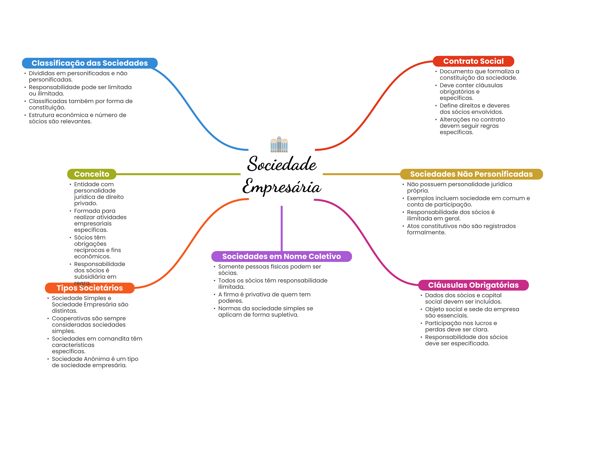 Classificação das Sociedades Contrato Social Divididas em personificadas e não Documento que formaliza a personificadas. constituição da sociedade. Responsabilidade pode ser limitada Deve conter cláusulas ou ilimitada. obrigatórias e Classificadas também por forma de específicas. constituição. Define direitos e deveres dos sócios envolvidos. Estrutura econômica e número de sócios são relevantes. Alterações no contrato devem seguir regras específicas. Sociedade Conceito Sociedades Não Personificadas Entidade com personalidade Empresária Não possuem personalidade jurídica própria. jurídica de direito Exemplos incluem sociedade em comum e privado. conta de participação. Formada para Responsabilidade dos sócios é realizar atividades ilimitada em geral. empresariais Atos constitutivos não são registrados específicas. formalmente. Sócios têm obrigações recíprocas e fins econômicos. Sociedades em Nome Coletivo Responsabilidade Somente pessoas físicas podem ser dos sócios é sócias. subsidiária em Todos sócios têm responsabilidade Tipos Societários ilimitada. Cláusulas Obrigatórias A firma é privativa de quem tem Sociedade Simples e Dados dos sócios e capital poderes. social devem ser incluídos. Sociedade Empresária são distintas. Normas da sociedade simples se Objeto social e sede da empresa aplicam de forma supletiva. são essenciais. Cooperativas são sempre consideradas sociedades Participação nos lucros e simples. perdas deve ser clara. Sociedades em comandita têm Responsabilidade dos sócios características deve ser especificada. específicas. Sociedade Anônima é um tipo de sociedade empresária.