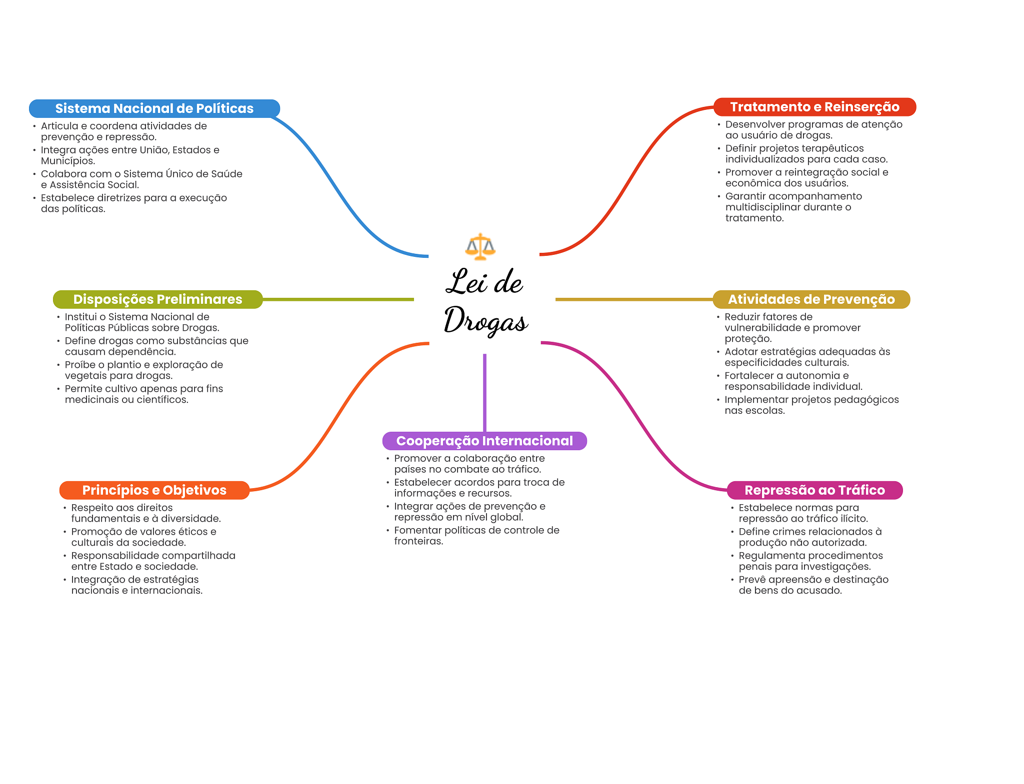 Sistema Nacional de Políticas Tratamento e Reinserção Articula e coordena atividades de Desenvolver programas de atenção prevenção e repressão. ao usuário de drogas. Integra ações entre União, Estados e Definir projetos terapêuticos Municípios. para cada caso. Colabora com Sistema Único de Saúde Promover a reintegração social e e Assistência Social. econômica dos usuários. Estabelece diretrizes para a execução Garantir acompanhamento das políticas. multidisciplinar durante tratamento. Lei de Disposições Preliminares Atividades de Prevenção Institui Sistema Nacional de Políticas Públicas sobre Drogas. Drogas Reduzir fatores de vulnerabilidade e promover Define drogas como substâncias que proteção. causam dependência. Adotar estratégias adequadas às Proíbe plantio e exploração de especificidades culturais. vegetais para drogas. Fortalecer a autonomia e Permite cultivo apenas para fins responsabilidade individual. medicinais ou científicos. Implementar projetos pedagógicos nas escolas. Cooperação Internacional Promover a colaboração entre países no combate ao tráfico. Estabelecer acordos para troca de Princípios e Objetivos informações e recursos. Repressão ao Tráfico Respeito aos direitos Integrar ações de prevenção e Estabelece normas para fundamentais e à diversidade. repressão em nível global. repressão ao tráfico ilícito. Promoção de valores éticos e Fomentar políticas de controle de Define crimes relacionados à culturais da sociedade. fronteiras. produção não autorizada. Responsabilidade compartilhada Regulamenta procedimentos entre Estado e sociedade. penais para investigações. Integração de estratégias Prevê apreensão e destinação nacionais e internacionais. de bens do acusado.