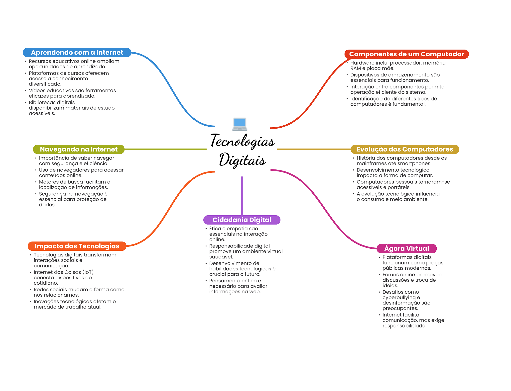 Aprendendo com a Internet Componentes de um Computador Recursos educativos online ampliam Hardware inclui processador, memória oportunidades de aprendizado. RAM e placa mãe. Plataformas de cursos oferecem Dispositivos de são acesso a conhecimento essenciais para funcionamento. diversificado. Interação entre componentes permite Vídeos educativos são ferramentas operação eficiente do sistema. eficazes para aprendizado. Identificação de diferentes tipos de Bibliotecas digitais computadores é fundamental. disponibilizam materiais de estudo acessíveis. Tecnologias Navegando na Internet Evolução dos Computadores Importância de saber navegar Digitais História dos computadores desde com segurança e eficiência. mainframes até smartphones. Uso de navegadores para acessar tecnológico conteúdos online. impacta a forma de computar. Motores de busca facilitam a Computadores pessoais tornaram-se localização de informações. acessíveis e portáteis. Segurança na navegação é A evolução tecnológica influencia essencial para proteção de consumo e meio ambiente. dados. Cidadania Digital Ética e empatia são essenciais na interação online. Impacto das Tecnologias Responsabilidade digital promove um ambiente virtual Ágora Virtual Tecnologias digitais transformam saudável. Plataformas digitais interações sociais e Desenvolvimento de funcionam como praças comunicação. Internet das Coisas habilidades tecnológicas é públicas modernas. crucial para futuro. Fóruns online promovem conecta dispositivos do Pensamento crítico é discussões e troca de cotidiano. necessário para avaliar ideias. Redes sociais mudam a forma como informações na web. Desafios como nos relacionamos. cyberbullying e Inovações tecnológicas afetam desinformação são mercado de trabalho atual. preocupantes. Internet facilita comunicação, mas exige responsabilidade.