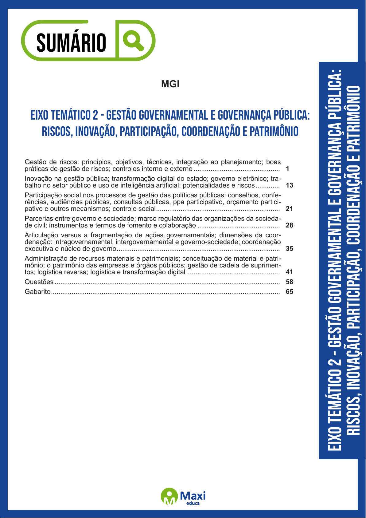 sumário Gestão de riscos: princípios, objetivos, técnicas, integração ao planejamento; boas práticas de gestão de riscos; controles interno e externo .............................................. 1 Inovação na gestão pública; transformação digital do estado; governo eletrônico; tra- balho no setor público e uso de inteligência artificial: potencialidades e riscos ............. 13 Participação social nos processos de gestão das políticas públicas: conselhos, confe- rências, audiências públicas, consultas públicas, ppa participativo, orçamento partici- pativo e outros mecanismos; controle social .................................................................. 21 Parcerias entre governo e sociedade; marco regulatório das organizações da socieda- de civil; instrumentos e termos de fomento e colaboração ............................................ 28 Articulação versus a fragmentação de ações governamentais; dimensões da coor- denação: intragovernamental, intergovernamental e governo-sociedade; coordenação executiva e núcleo de governo ....................................................................................... 35 Administração de recursos materiais e patrimoniais; conceituação de material e patri- mônio; o patrimônio das empresas e órgãos públicos; gestão de cadeia de suprimen- tos; logística reversa; logística e transformação digital .................................................. 41 Questões ........................................................................................................................ 58 Gabarito .......................................................................................................................... 65 Eix o Te má tic o 2 - G es tã o Go ve rn am en ta l E Go ve rn an ça Pú bl ic a: Ri sc os , In ov aç ão , P ar ti ci pa çã o, Co or de na çã o E P at ri mô ni oMGI Eixo Temático 2 - Gestão Governamental E Governança Pública: Riscos, Inovação, Participação, Coordenação E Patrimônio Apostila gerada especialmente para: Luis Valmar de Sousa 704.118.242-87 1 Gestão de riscos: princípios, objetivos, técnicas, integração ao planejamento; Boas práticas de gestão de riscos; Controles interno e externo Princípios E Objetivos Da Gestão De Riscos A gestão de riscos vem ganhando destaque na administração pública como ferramenta essencial para a boa governança, a integridade institucional e a melhoria dos resultados entregues à sociedade. Ao adotar essa abordagem, os órgãos públicos tornam-se mais resilientes, proativos e eficientes, reduzindo a probabilidade de falhas e aumentando sua capacidade de enfrentar incertezas. ▸ Conceito Central Gestão de riscos é o processo estruturado de identificar, avaliar, tratar e monitorar riscos que podem afetar o alcance dos objetivos organizacionais. No setor público, esse processo deve ser sistemático, transparente e baseado em evidências, sempre voltado ao interesse público. ▸ Princípios da Gestão de Riscos A gestão de riscos, segundo diretrizes internacionais como a norma ISO 31000 e documentos orientadores da CGU e do TCU, se baseia em princípios que orientam sua implementação. Esses princípios asseguram que o processo não seja apenas formal, mas útil e eficaz. Criação e proteção de valor: A gestão de riscos deve contribuir diretamente para a geração de valor público e para a proteção do patri- mônio público. Isso envolve a prevenção de perdas e a melhoria do desempenho. Foco nos objetivos: Os riscos devem ser identificados e gerenciados com base nos objetivos da organização. Isso garante que o processo esteja alinhado ao planejamento estratégico, tático e operacional. Integração à cultura organizacional: A gestão de riscos deve ser parte integrante da cultura da organização, sendo incorporada às atividades rotineiras, decisões e comportamentos institucionais. Customização: Cada órgão público possui seu contexto, seus desafios e seus níveis de exposição. A gestão de riscos deve ser adaptada a essas especificidades, respeitando a estrutura, os recursos e a missão institucional. Participação de todas as partes interessadas: A gestão de riscos é uma atividade coletiva. A participação de diferentes setores, servidores e instâncias de controle é fundamental para que os riscos sejam compreendidos e tratados de forma adequada. Transparência e comunicação: A boa gestão de riscos exige uma comunicação clara, objetiva e tempestiva, tanto interna quanto externa- mente. Isso facilita a tomada de decisões e o engajamento dos envolvidos. Melhoria contínua: O processo de gestão de riscos deve ser revisto regularmente, com base em lições aprendidas, auditorias e mudanças no ambiente externo ou interno. Apostila gerada especialmente para: Luis Valmar de Sousa 704.118.242-87 2 ▸ Objetivos da Gestão de Riscos na Administrwação Pública Os objetivos da gestão de riscos estão diretamente ligados à entrega de serviços públicos com mais quali- dade, eficiência e responsabilidade. Eles garantem que a organização esteja preparada para lidar com eventos incertos que possam comprometer sua missão. Reduzir incertezas e antecipar problemas: Ao identificar riscos potenciais, a organização se antecipa a eventos negativos, reduzindo surpresas e im- pactos não planejados. Melhorar a tomada de decisões: Com base na análise de riscos, gestores tomam decisões mais informadas, priorizando ações conforme o nível de criticidade e impacto. Assegurar a continuidade institucional: A gestão de riscos protege a continuidade das operações e serviços públicos, mesmo diante de crises ou mudanças de governo. Proteger a imagem e a reputação institucional: Evitar escândalos, fraudes e omissões que possam comprometer a confiança da sociedade e dos órgãos de controle. Promover o uso racional de recursos: Ao evitar perdas e retrabalho, a gestão de r
