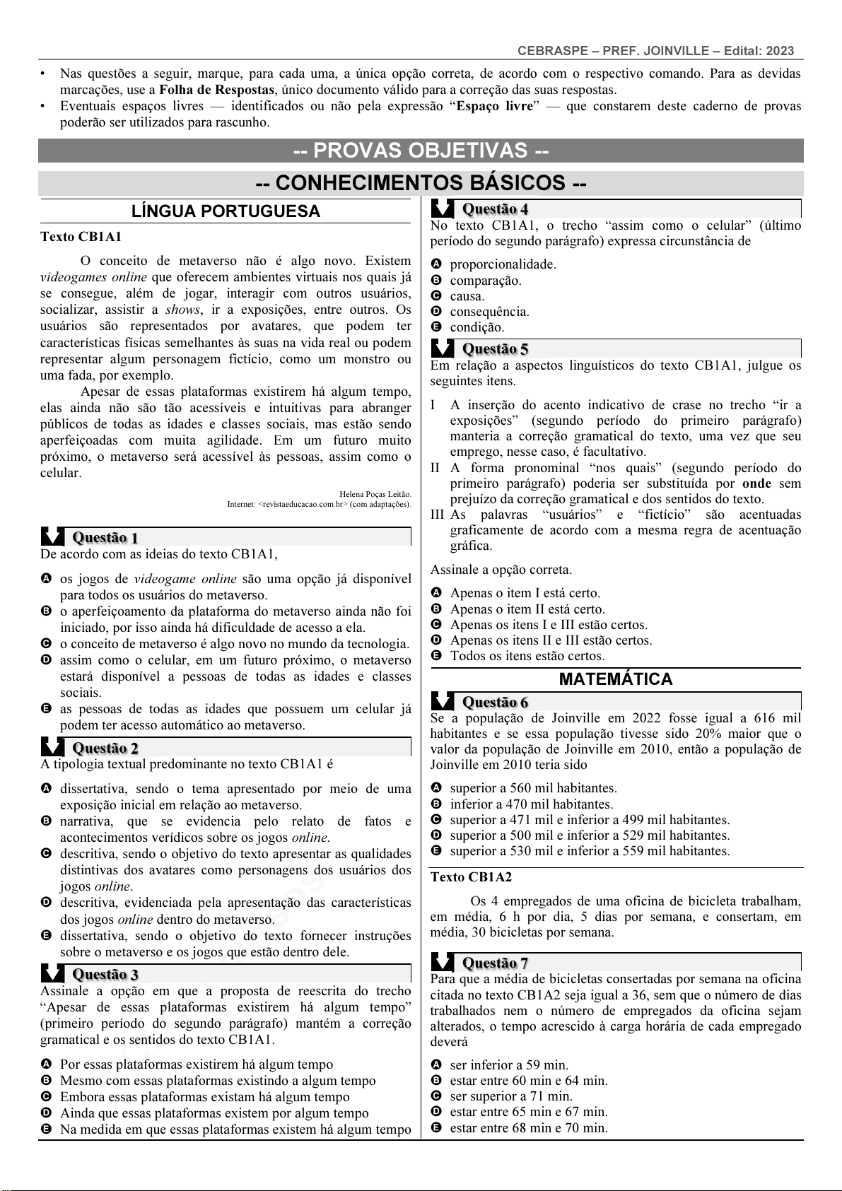 pcimarkpci MDAwMDowMDAwOjAwMDA6MDAwMDowMDAwOmZmZmY6YmI0NDpiY2Nl:RnJpLCAxOSBEZWMgMjAyNSAwOTo0Mzo1MyAtMDMwMA== www.pciconcursos.com.br CEBRASPE – PREF. JOINVILLE – Edital: 2023 • Nas questões a seguir, marque, para cada uma, a única opção correta, de acordo com o respectivo comando. Para as devidas marcações, use a Folha de Respostas, único documento válido para a correção das suas respostas. • Eventuais espaços livres — identificados ou não pela expressão “Espaço livre” — que constarem deste caderno de provas poderão ser utilizados para rascunho. -- PROVAS OBJETIVAS -- -- CONHECIMENTOS BÁSICOS -- LÍNGUA PORTUGUESA Texto CB1A1 O conceito de metaverso não é algo novo. Existem videogames online que oferecem ambientes virtuais nos quais já se consegue, além de jogar, interagir com outros usuários, socializar, assistir a shows, ir a exposições, entre outros. Os usuários são representados por avatares, que podem ter características físicas semelhantes às suas na vida real ou podem representar algum personagem fictício, como um monstro ou uma fada, por exemplo. Apesar de essas plataformas existirem há algum tempo, elas ainda não são tão acessíveis e intuitivas para abranger públicos de todas as idades e classes sociais, mas estão sendo aperfeiçoadas com muita agilidade. Em um futuro muito próximo, o metaverso será acessível às pessoas, assim como o celular. Helena Poças Leitão. Internet: (com adaptações). Questão 1 De acordo com as ideias do texto CB1A1, A os jogos de videogame online são uma opção já disponível para todos os usuários do metaverso. B o aperfeiçoamento da plataforma do metaverso ainda não foi iniciado, por isso ainda há dificuldade de acesso a ela. C o conceito de metaverso é algo novo no mundo da tecnologia. D assim como o celular, em um futuro próximo, o metaverso estará disponível a pessoas de todas as idades e classes sociais. E as pessoas de todas as idades que possuem um celular já podem ter acesso automático ao metaverso. Questão 2 A tipologia textual predominante no texto CB1A1 é A dissertativa, sendo o tema apresentado por meio de uma exposição inicial em relação ao metaverso. B narrativa, que se evidencia pelo relato de fatos e acontecimentos verídicos sobre os jogos online. C descritiva, sendo o objetivo do texto apresentar as qualidades distintivas dos avatares como personagens dos usuários dos jogos online. D descritiva, evidenciada pela apresentação das características dos jogos online dentro do metaverso. E dissertativa, sendo o objetivo do texto fornecer instruções sobre o metaverso e os jogos que estão dentro dele. Questão 3 Assinale a opção em que a proposta de reescrita do trecho “Apesar de essas plataformas existirem há algum tempo” (primeiro período do segundo parágrafo) mantém a correção gramatical e os sentidos do texto CB1A1. A Por essas plataformas existirem há algum tempo B Mesmo com essas plataformas existindo a algum tempo C Embora essas plataformas existam há algum tempo D Ainda que essas plataformas existem por algum tempo E Na medida em que essas plataformas existem há algum tempo Questão 4 No texto CB1A1, o trecho “assim como o celular” (último período do segundo parágrafo) expressa circunstância de A proporcionalidade. B comparação. C causa. D consequência. E condição. Questão 5 Em relação a aspectos linguísticos do texto CB1A1, julgue os seguintes itens. I A inserção do acento indicativo de crase no trecho “ir a exposições” (segundo período do primeiro parágrafo) manteria a correção gramatical do texto, uma vez que seu emprego, nesse caso, é facultativo. II A forma pronominal “nos quais” (segundo período do primeiro parágrafo) poderia ser substituída por onde sem prejuízo da correção gramatical e dos sentidos do texto. III As palavras “usuários” e “fictício” são acentuadas graficamente de acordo com a mesma regra de acentuação gráfica. Assinale a opção correta. A Apenas o item I está certo. B Apenas o item II está certo. C Apenas os itens I e III estão certos. D Apenas os itens II e III estão certos. E Todos os itens estão certos. MATEMÁTICA Questão 6 Se a população de Joinville em 2022 fosse igual a 616 mil habitantes e se essa população tivesse sido 20% maior que o valor da população de Joinville em 2010, então a população de Joinville em 2010 teria sido A superior a 560 mil habitantes. B inferior a 470 mil habitantes. C superior a 471 mil e inferior a 499 mil habitantes. D superior a 500 mil e inferior a 529 mil habitantes. E superior a 530 mil e inferior a 559 mil habitantes. Texto CB1A2 Os 4 empregados de uma oficina de bicicleta trabalham, em média, 6 h por dia, 5 dias por semana, e consertam, em média, 30 bicicletas por semana. Questão 7 Para que a média de bicicletas consertadas por semana na oficina citada no texto CB1A2 seja igual a 36, sem que o número de dias trabalhados nem o número de empregados da oficina sejam alterados, o tempo acrescido à carga horária de cada empregado deverá A ser inferior a 59 min. B estar entre 60 min e 64 min. C ser superior a 71 min. D estar entre 65 min e 67 min. E estar entre 68 min e 70 min.