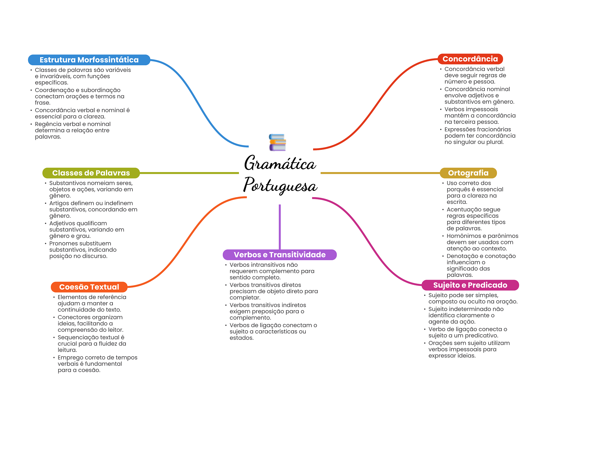 Estrutura Morfossintática Concordância Classes de palavras são variáveis Concordância verbal e invariáveis, com funções deve seguir regras de específicas. número e pessoa. Coordenação e subordinação Concordância nominal conectam orações e termos envolve adjetivos e frase. substantivos em gênero. Concordância verbal e nominal é Verbos impessoais essencial para a clareza. mantêm a concordância Regência verbal e nominal na terceira pessoa. determina a relação entre Expressões fracionárias palavras. podem ter concordância no singular ou plural. Gramática Classes de Palavras Ortografia Substantivos nomeiam seres, objetos e ações, variando em Portuguesa Uso correto dos porquês é essencial gênero. para a clareza na Artigos definem ou indefinem escrita. substantivos, concordando em Acentuação segue gênero. regras específicas Adjetivos qualificam para diferentes tipos substantivos, variando em de palavras. gênero e grau. Homônimos e parônimos Pronomes substituem devem ser usados com substantivos, indicando atenção ao contexto. posição no discurso. Verbos e Transitividade Denotação e conotação Verbos intransitivos não influenciam requerem complemento para significado das sentido completo. palavras. Coesão Textual Verbos transitivos diretos Sujeito e Predicado precisam de objeto direto para Elementos de referência completar. Sujeito pode ser simples, ajudam a manter a Verbos transitivos indiretos composto ou oculto na oração. continuidade do texto. exigem preposição para O Sujeito indeterminado não Conectores organizam identifica claramente complemento. ideias, facilitando a agente da ação. Verbos de ligação conectam compreensão do leitor. sujeito a características ou Verbo de ligação conecta O Sequenciação textual é estados. sujeito a um predicativo. crucial para a fluidez da Orações sem sujeito utilizam leitura. verbos impessoais para Emprego correto de tempos expressar ideias. verbais é fundamental para a coesão.