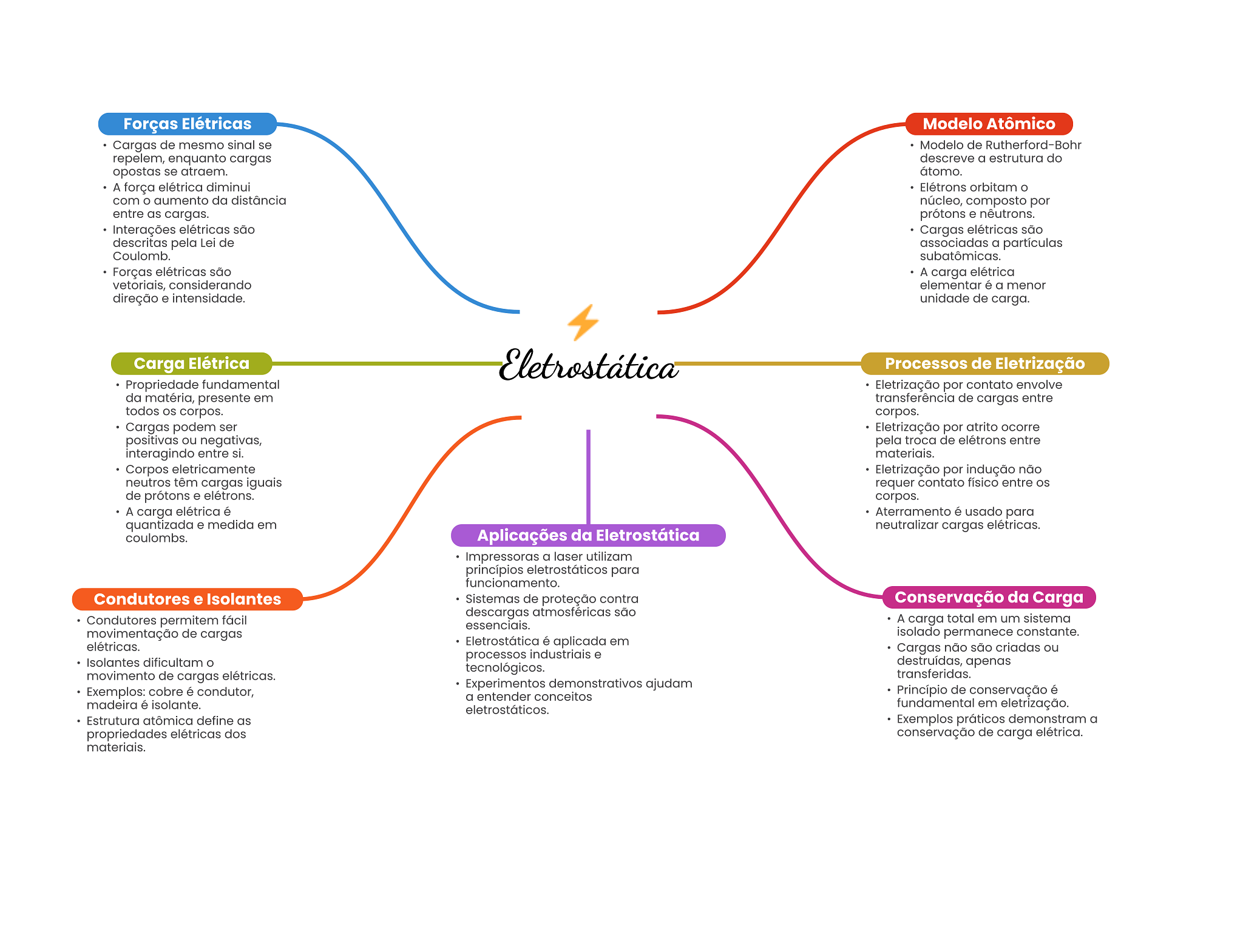 Forças Elétricas Modelo Atômico Cargas de mesmo sinal se Modelo de Rutherford-Bohr repelem, enquanto cargas descreve a estrutura do opostas se atraem. átomo. A força elétrica diminui Elétrons orbitam com aumento da distância núcleo, composto por entre as cargas. prótons e nêutrons. Interações elétricas são Cargas elétricas são descritas pela Lei de associadas a partículas Coulomb. subatômicas. Forças elétricas são A carga elétrica vetoriais, considerando elementar é a menor direção e intensidade. unidade de carga. Carga Elétrica Eletrostática Processos de Eletrização Propriedade fundamental Eletrização por contato envolve da matéria, presente em transferência de cargas entre todos OS corpos. corpos. Cargas podem ser Eletrização por atrito ocorre positivas ou negativas, pela troca de elétrons entre interagindo entre si. materiais. Corpos eletricamente Eletrização por indução não neutros têm cargas iguais requer contato físico entre de prótons e elétrons. corpos. A carga elétrica é Aterramento é usado para quantizada e medida em neutralizar cargas elétricas. coulombs. Aplicações da Eletrostática Impressoras a laser utilizam princípios eletrostáticos para funcionamento. Condutores e Isolantes Sistemas de proteção contra Conservação da Carga descargas atmosféricas são Condutores permitem fácil essenciais. A carga total em um sistema movimentação de cargas isolado permanece constante. elétricas. Eletrostática é aplicada em processos industriais e Cargas não são criadas ou Isolantes dificultam O tecnológicos. destruídas, apenas movimento de cargas elétricas. transferidas. Experimentos demonstrativos ajudam Exemplos: cobre é condutor, a entender conceitos Princípio de conservação é madeira é isolante. eletrostáticos. fundamental em eletrização. Estrutura atômica define as Exemplos práticos demonstram a propriedades elétricas dos conservação de carga elétrica. materiais.