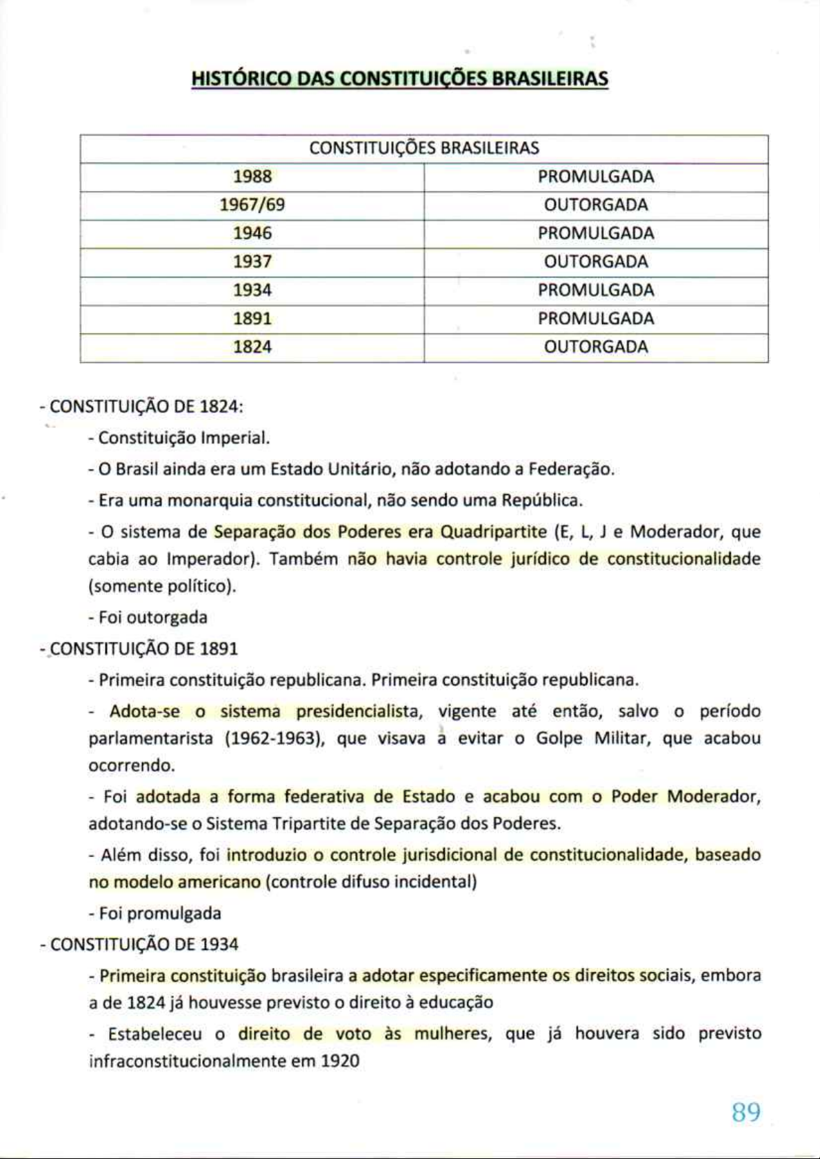 HISTÓRICO DAS CONSTITUIÇÕES BRASILEIRAS CONSTITUIÇÕES BRASILEIRAS 1988 PROMULGADA 1967/69 OUTORGADA 1946 PROMULGADA 1937 OUTORGADA 1934 PROMULGADA 1891 PROMULGADA 1824 OUTORGADA CONSTITUIÇÃO DE 1824: Constituição Imperial. Brasil ainda era um Estado Unitário, não adotando a Federação. Era uma monarquia constitucional, não sendo uma República. sistema de Separação dos Poderes era Quadripartite (E, L, J e Moderador, que cabia ao Imperador). Também não havia controle jurídico de constitucionalidade (somente político). Foi outorgada CONSTITUIÇÃO DE 1891 Primeira constituição republicana. Primeira constituição republicana. Adota-se o sistema presidencialista, vigente até então, salvo o período parlamentarista (1962-1963), que visava a evitar Golpe Militar, que acabou ocorrendo. Foi adotada a forma federativa de Estado e acabou com Poder Moderador, adotando-se o Sistema Tripartite de Separação dos Poderes. Além disso, foi introduzio controle jurisdicional de constitucionalidade, baseado no modelo americano (controle difuso incidental) Foi promulgada CONSTITUIÇÃO DE 1934 Primeira constituição brasileira a adotar especificamente os direitos sociais, embora a de 1824 já houvesse previsto direito à educação Estabeleceu o direito de voto às mulheres, que já houvera sido previsto infraconstitucionalmente em 1920 89Foi promulgada CONSTITUIÇÃO DE 1937 ("POLACA") Ditatorial Caracterizada por uma exacerbação do Poder Executivo, em detrimento dos demais Poderes Inseriu a Representação Interventiva, que era uma ação do controle concentrado. Portanto, a competência para analisa-la era do STF Foi outorgada CONSTITUIÇÃO DE 1946 Constituição da Redemocratização Considerada de baixa efetividade, com baixa aplicabilidade na prática Sob a vigência da Constituição de 1946, introduziu-se o controle abstrato de constitucionalidade, a partir de Emenda Constitucional (n° 16), que introduziu a para Fins de (ADI portanto) Ainda na sua vigência, houve adoção do sistema parlamentarista, durante um breve período, entre 1962 e 1963 Foi promulgada CONSTITUIÇÃO DE 1967/69 Caracterizada por uma restrição a direitos fundamentais Marcada pelo cerceamento do Poder Legislativo - Viés autoritário Foi outorgada CONSTITUIÇÃO DE 1988 Chamada de Constituição Cidadã Extenso rol de direitos e garantias fundamentais Introduz a proteção aos direitos de 3ª dimensão Amplia o controle abstrato de constitucionalidade Dirigente, valendo-se de normas programáticas Observação: Com relação à Constituição de 1967/69, Gilmar Mendes defende que a mesma foi promulgada. Ele distingue os critérios: Promulgada X Outorgada e Democrática X Ditatorial. A questão de ser promulgada ou outorgada depende da edição, ou não, de um ato formal editado pelo Poder Legislativo. Por outras palavras, se ela for outorgada, não há edição de qualquer ato pelo Poder Legislativo; já a promulgada é fruto da edição de um ato formal por parte do Poder Legislativo. GM considera que ela foi formalmente promulgada 90pelo Congresso Nacional, mesmo tendo caráter ditatorial. Todavia, a maioria da doutrina continua defendendo que a mesma foi outorgada, pois o seu processo formal foi um mero simbolismo, haja vista que a mesma fora imposta ao Congresso Nacional, fraudulentamente. No caso, a promulgação foi simplesmente uma tentativa de se dar legitimidade à constituição pela aprovação do Congresso Nacional. 91