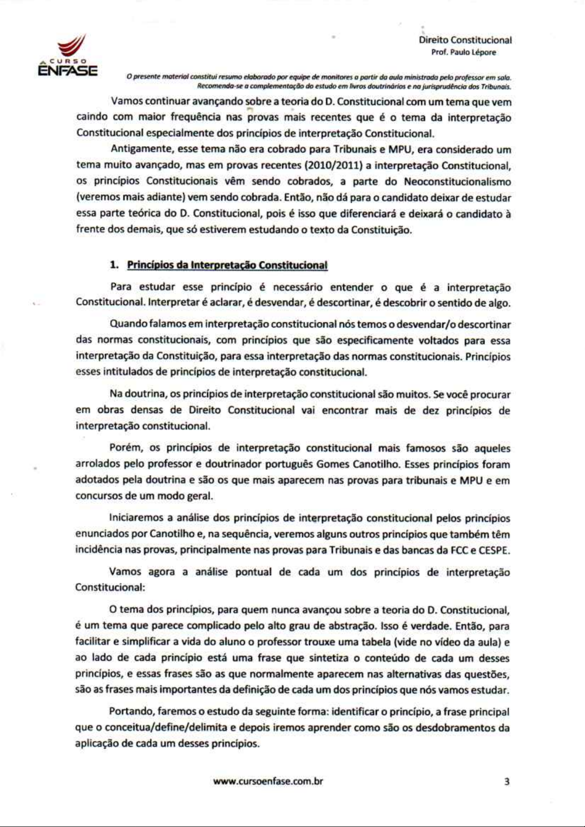 Direito Constitucional Prof. Paulo Lépore CURSO ENFASE presente material constitui resumo elaborado por equipe de monitores partir da aulo ministrada pelo professor em sala. Recomenda-se a complementação do estudo em livros doutrinários e jurisprudência dos Tribunais. Vamos continuar avançando sobre a teoria do D. Constitucional com um tema que vem caindo com maior frequência nas provas mais recentes que é tema da interpretação Constitucional especialmente dos princípios de interpretação Constitucional. Antigamente, esse tema não era cobrado para Tribunais e MPU, era considerado um tema muito avançado, mas em provas recentes (2010/2011) a interpretação Constitucional, os princípios Constitucionais vêm sendo cobrados, a parte do (veremos mais adiante) vem sendo cobrada. Então, não dá para candidato deixar de estudar essa parte teórica do D. Constitucional, pois é isso que diferenciará e deixará candidato à frente dos demais, que só estiverem estudando o texto da Constituição. 1. Princípios da Interpretação Constitucional Para estudar esse princípio é necessário entender que é a interpretação Constitucional. Interpretar é aclarar, é desvendar, é descortinar, é descobrir sentido de algo. Quando falamos em interpretação constitucional nós temos o desvendar/o descortinar das normas constitucionais, com princípios que são especificamente voltados para essa interpretação da Constituição, para essa interpretação das normas constitucionais. Princípios esses intitulados de princípios de interpretação constitucional. Na doutrina, os princípios de interpretação constitucional são muitos. Se você procurar em obras densas de Direito Constitucional vai encontrar mais de dez princípios de interpretação constitucional. Porém, os princípios de interpretação constitucional mais famosos são aqueles arrolados pelo professor e doutrinador português Gomes Canotilho. Esses princípios foram adotados pela doutrina e são os que mais aparecem nas provas para tribunais e MPU e em concursos de um modo geral. Iniciaremos a análise dos princípios de interpretação constitucional pelos princípios enunciados por Canotilho e, na sequência, veremos alguns outros princípios que também têm incidência nas provas, principalmente nas provas para Tribunais e das bancas da FCC e CESPE. Vamos agora a análise pontual de cada um dos princípios de interpretação Constitucional: tema dos princípios, para quem nunca avançou sobre a teoria do D. Constitucional, é um tema que parece complicado pelo alto grau de abstração. Isso é verdade. Então, para facilitar e simplificar a vida do aluno o professor trouxe uma tabela (vide no vídeo da aula) e ao lado de cada princípio está uma frase que sintetiza conteúdo de cada um desses princípios, e essas frases são as que normalmente aparecem nas alternativas das questões, são as frases mais importantes da definição de cada um dos princípios que nós vamos estudar. Portando, faremos 0 estudo da seguinte forma: identificar o princípio, a frase principal que o conceitua/define/delimita e depois iremos aprender como são os desdobramentos da aplicação de cada um desses www.cursoenfase.com.br 3Direito Constitucional Prof. Paulo Lépore CURSO ENFASE presente material constitui resumo elaborado por equipe de monitores partir do aulo pelo professor em Recomenda-se a complementação do estudo em livros e no jurisprudência dos Tribunais. 1.1. Princípio da unidade da Constituição Frase de síntese: Busca evitar contradições na unidade de princípios e regras. A doutrina traz que as normas constitucionais são subdivididas entre princípios e regras. A diferença básica entre um princípio e uma regra é que um princípio determina ou estabelece uma finalidade a ser perseguida, enquanto a regra estabelece um comportamento a ser cumprido. 0 principio tem um grau maior de abstração enquanto a regra traz um grau maior de concretude. Dito isso, princípio da unidade da constituição faz ainda mais sentido, pois diz que devemos buscar evitar as contradições dessa unidade constitucional composta por normas que podem ser princípios e que podem ser regras. o exemplo que a doutrina costuma dar é que, no âmbito dos princípios constitucionais, dos valores constitucionais, nós nunca podemos dizer que um valor ou um princípio constitucional prevalece em qualquer caso sobre outro. Nós sempre precisamos fazer ponderações. Existem dois valores que colidem em muitos casos, que são os valores da intimidade e do acesso à informação. Temos um caso muito famoso que contrapõe a intimidade e acesso à informação e deixa muito claro sentido desse princípio da unidade da constituição: tivemos um caso, no Brasil, em que um programa de humor começou a perseguir uma atriz famosa. Essa atriz não quis participar da brincadeira do programa e não queria nem dar entrevista e nem conversar com os humoristas. Diante disso, os humoristas chegaram a uma situação limite de irem até a frente do prédio dessa atriz famosa, com um guindaste/escada de bombeiros e subirem próximos à sacada do apartamento da atriz para tentar falar com ela. Esse exemplo serve para explicar o princípio da unidade da constituição, porque aqui nós temos em conflito a intimidade da atriz com eventual acesso à informação que seria prestado por um canal de televisão via um programa de humor, que é conversar com uma pessoa pública, uma pessoa famosa que, em tese, teria sua intimidade menos resguardada do que uma pessoa que não é famosa. Vários são os doutrinadores que sustentam, principalmente fora do Brasil, que as pessoas famosas teriam direito à intimidade e vida privada com um menor grau de intensidade, uma vez que a vida delas já está exposta pelo trabalho que elas desempenham. Então, diante de uma situação como essa, precisamos pensar na unidade da constituição, nos princípios e nas regras previstos na 