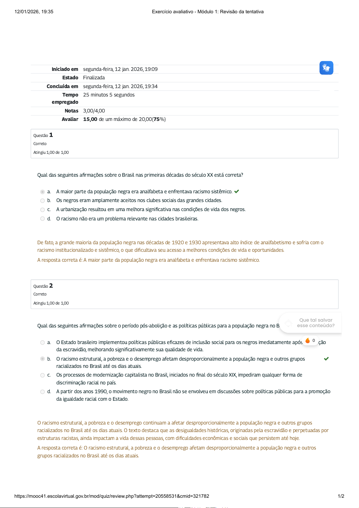 Iniciado em segunda-feira, 12 jan. 2026, 19:09 Estado Finalizada Concluída em segunda-feira, 12 jan. 2026, 19:34 Tempo empregado 25 minutos 5 segundos Notas 3,00/4,00 Avaliar 15,00 de um máximo de 20,00(75%) Questão 1 Correto Atingiu 1,00 de 1,00 Questão 2 Correto Atingiu 1,00 de 1,00 Qual das seguintes afirmações sobre o Brasil nas primeiras décadas do século XX está correta? a. A maior parte da população negra era analfabeta e enfrentava racismo sistêmico. b. Os negros eram amplamente aceitos nos clubes sociais das grandes cidades. c. A urbanização resultou em uma melhora significativa nas condições de vida dos negros. d. O racismo não era um problema relevante nas cidades brasileiras. De fato, a grande maioria da população negra nas décadas de 1920 e 1930 apresentava alto índice de analfabetismo e sofria com o racismo institucionalizado e sistêmico, o que dificultava seu acesso a melhores condições de vida e oportunidades. A resposta correta é: A maior parte da população negra era analfabeta e enfrentava racismo sistêmico. Qual das seguintes afirmações sobre o período pós-abolição e as políticas públicas para a população negra no Brasil é correta? a. O Estado brasileiro implementou políticas públicas eficazes de inclusão social para os negros imediatamente após a abolição da escravidão, melhorando significativamente sua qualidade de vida. b. O racismo estrutural, a pobreza e o desemprego afetam desproporcionalmente a população negra e outros grupos racializados no Brasil até os dias atuais. c. Os processos de modernização capitalista no Brasil, iniciados no final do século XIX, impediram qualquer forma de discriminação racial no país. d. A partir dos anos 1990, o movimento negro no Brasil não se envolveu em discussões sobre políticas públicas para a promoção da igualdade racial com o Estado. O racismo estrutural, a pobreza e o desemprego continuam a afetar desproporcionalmente a população negra e outros grupos racializados no Brasil até os dias atuais. O texto destaca que as desigualdades históricas, originadas pela escravidão e perpetuadas por estruturas racistas, ainda impactam a vida dessas pessoas, com dificuldades econômicas e sociais que persistem até hoje. A resposta correta é: O racismo estrutural, a pobreza e o desemprego afetam desproporcionalmente a população negra e outros grupos racializados no Brasil até os dias atuais. Que tal salvar esse conteúdo? 0 12/01/2026, 19:35 Exercício avaliativo - Módulo 1: Revisão da tentativa https://mooc41.escolavirtual.gov.br/mod/quiz/review.php?attempt=20558531&cmid=321782 1/2 Questão 3 Incorreto Atingiu 0,00 de 1,00 Questão 4 Correto Atingiu 1,00 de 1,00 Qual é o principal desafio mencionado no texto para a promoção da igualdade racial no Brasil? a. A falta de conhecimento sobre as desigualdades raciais. b. O baixo orçamento destinado para ações de promoção da igualdade racial. c. A resistência dos movimentos negros a parcerias com o poder público. d. A inexistência de dados estatísticos sobre desigualdades raciais. Entre os vários desafios existentes, um dos mais relevantes é o baixo orçamento para as políticas de promoção da igualdade racial. A resposta correta é: O baixo orçamento destinado para ações de promoção da igualdade racial. Com relação à saúde, qual das iniciativas a seguir é mencionada no texto como voltada à população negra? a. Programas de prevenção de doenças como anemia falciforme e hipertensão. b. Programas de doação de órgãos para negros. c. Políticas públicas de saúde apenas para a população indígena. d. Aumento no número de hospitais exclusivos para negros. Doenças como anemia falciforme, hipertensão e diabetes têm acometido mais intensamente a população negra, exigindo, assim, políticas públicas direcionadas para essa população, de modo a reduzir adoecimentos e mortes. A resposta correta é: Programas de prevenção de doenças como anemia falciforme e hipertensão. Que tal salvar esse conteúdo? 12/01/2026, 19:35 Exercício avaliativo - Módulo 1: Revisão da tentativa https://mooc41.escolavirtual.gov.br/mod/quiz/review.php?attempt=20558531&cmid=321782 2/2