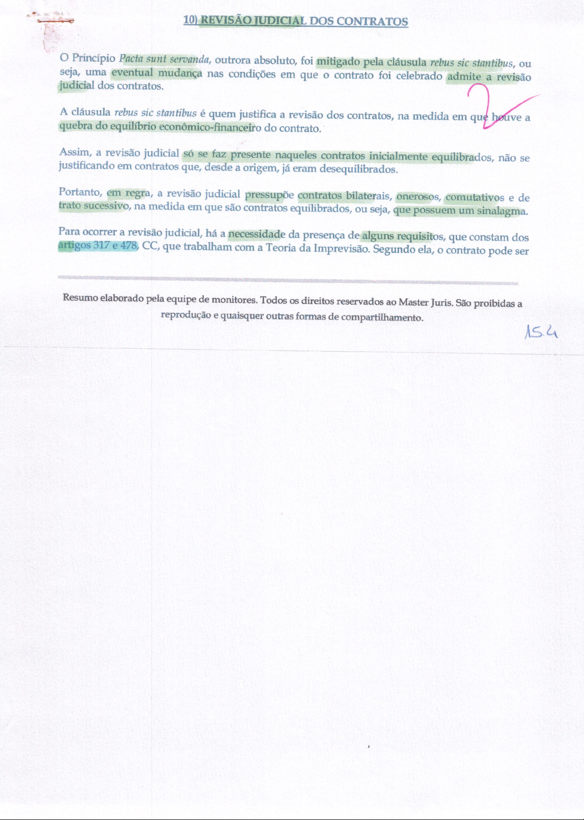 10) REVISÃO JUDICIAL DOS CONTRATOS Princípio Pacta sunt servanda, outrora absoluto, foi mitigado pela cláusula rebus sic stantibus, ou seja, uma eventual mudança nas condições em que o contrato foi celebrado admite a revisão judicial dos contratos. A cláusula rebus sic stantibus é quem justifica a revisão dos contratos, na medida em que houve a quebra do equilíbrio do contrato. Assim, a revisão judicial só se faz presente naqueles contratos inicialmente equilibrados, não se justificando em contratos que, desde a origem, já eram desequilibrados. Portanto, em regra, a revisão judicial pressupõe contratos bilaterais, onerosos, comutativos e de trato sucessivo, na medida em que são contratos equilibrados, ou seja, que possuem um sinalagma. Para ocorrer a revisão judicial, há a necessidade da presença de alguns requisitos, que constam dos artigos 317 e 478, CC, que trabalham com a Teoria da Imprevisão. Segundo ela, o contrato pode ser Resumo elaborado pela equipe de monitores. Todos os direitos reservados ao Master Juris. São proibidas a reprodução e quaisquer outras formas de compartilhamento. 15.4MASTER JURIS 15 anos RIBCAST detradição professores associados resolvido ou revisado pela ocorrência de um evento futuro e imprevisível que o torne excessivamente oneroso para uma das partes. Art. 317. Quando, por motivos imprevisíveis, sobrevier desproporção manifesta entre 0 valor da prestação devida e do momento de sua execução, poderá 0 juiz corrigi-lo, a pedido da parte, de modo que assegure, quanto possível, 0 valor real da prestação. Art. 478. Nos contratos de execução continuada ou diferida, se a prestação de uma das partes se tornar excessivamente onerosa, com extrema vantagem para a outra, em virtude de acontecimentos extraordinários e imprevisíveis, poderá devedor pedir a resolução do contrato. Os efeitos da sentença que a decretar retroagirão à data da citação. DE no do Resumo elaborado pela equipe de monitores. Todos os direitos reservados ao Master Juris. São proibidas a reprodução e quaisquer outras formas de compartilhamento. 155