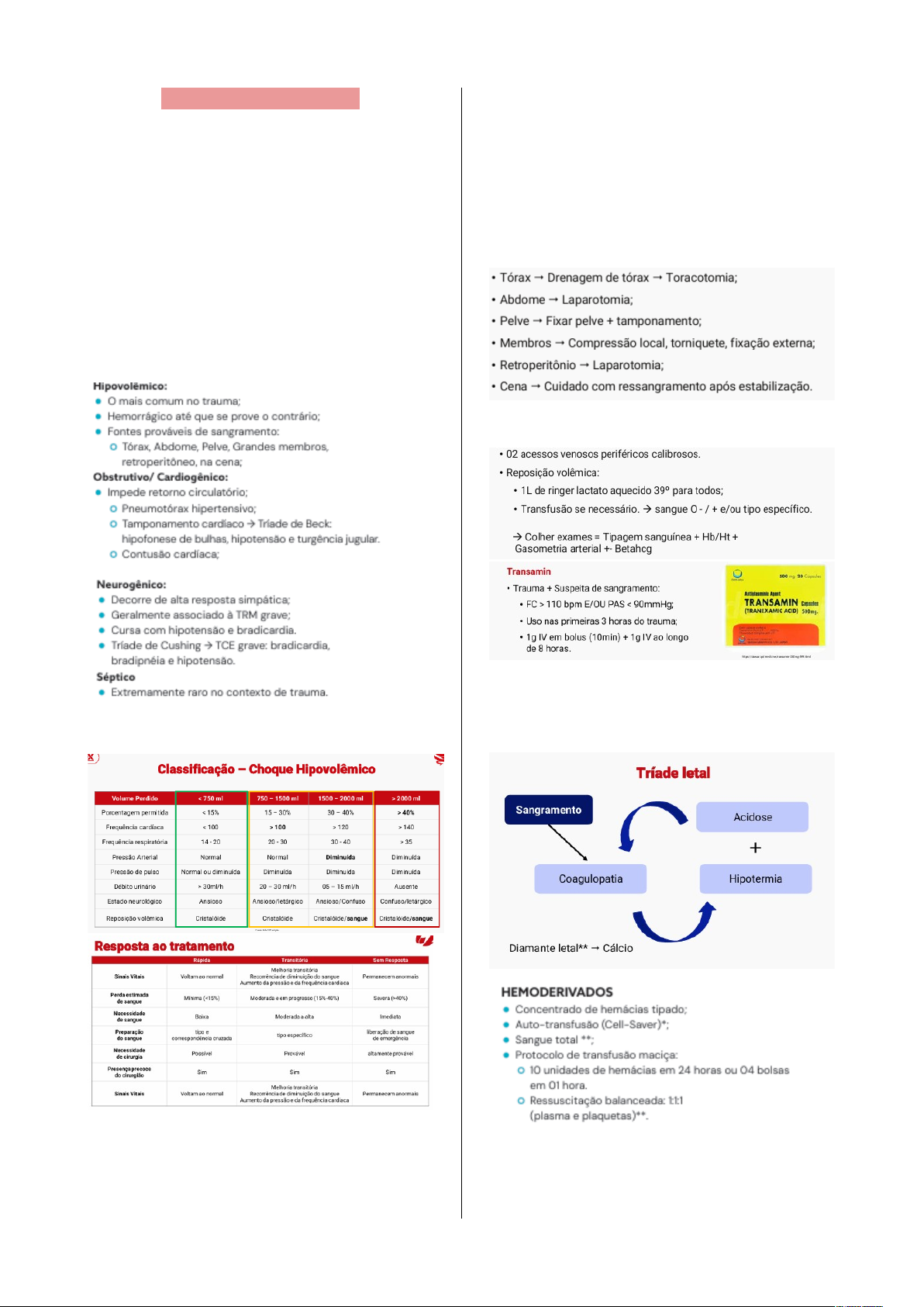 CHOQUE NO TRAUMA Anormalidade circulatório causando hipoperfusão tecidual orgânica conjunto de sinais e sintomas que requerem pronto diagnóstico e tratamento hipovolêmico/hemorrágico até que se prove ao contrário CLASSIFICAÇÃO DO CHOQUE: COMO FAZER O DIAGNÓSTICO: choque leve, moderado e grave todo paciente vítima de trauma recebe 1l de ringer lactato aquecido a 39°C INSTABILIDADE: é diferente de choque falta de permanência e constância de certo estado ou condição; inconstância, volubilidade DIAGNOSTICAR, CLASSIFICAR E TRATAR NA AVALIAÇÃO PRIMÁRIA 1° parar o sangramento 2° repor as perdas Se estiver incapaz de pegar AVP, tentar o IO e/ou acesso venoso central e/ou dissecção venosa image1.png image10.png image7.png image8.png image6.png image5.png image2.png image3.png image4.png image9.png