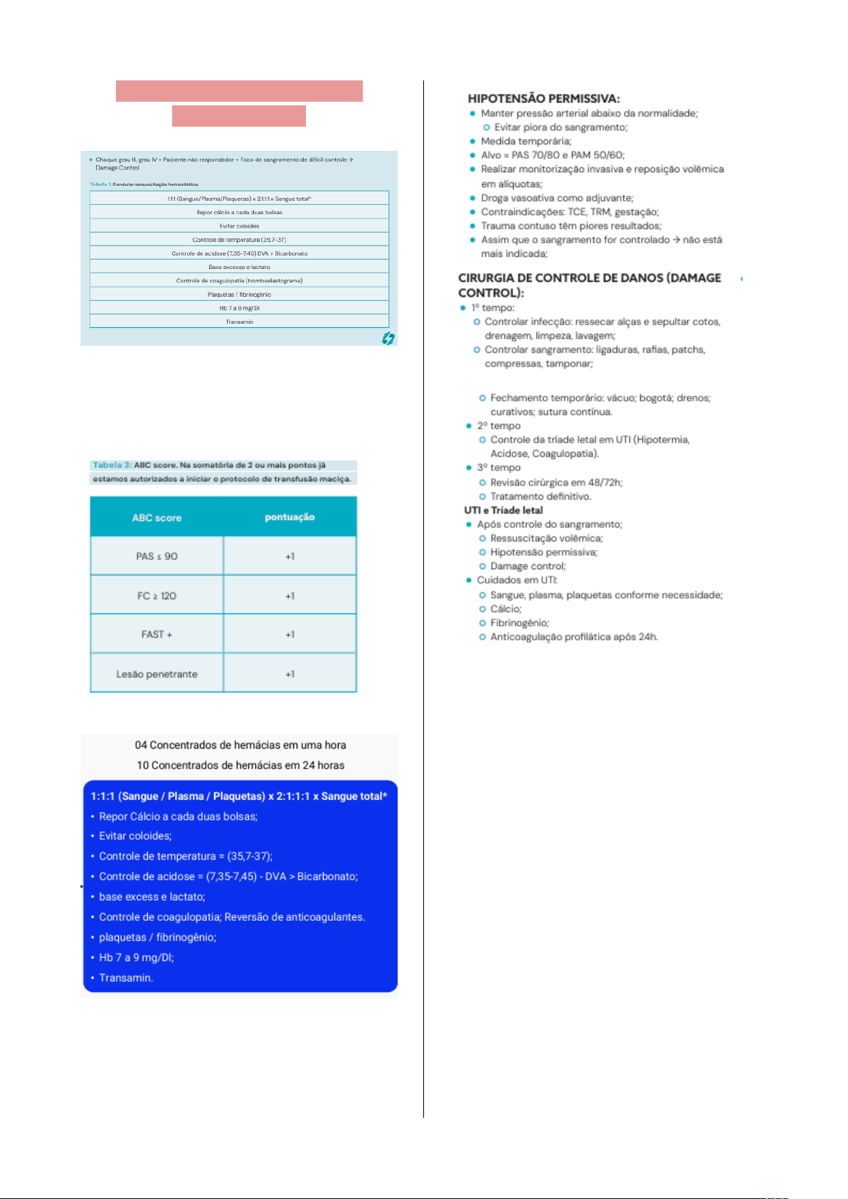 TRAUMA: RESSUSCITAÇÃO HEMOSTÁTICA Transfusão maciça indicado em: Choque moderado/grave + paciente não respondedor + foco de sangramento de difícil controle Protocolo transfusão maciça: image4.png image5.png image6.png image1.png image2.png image3.png