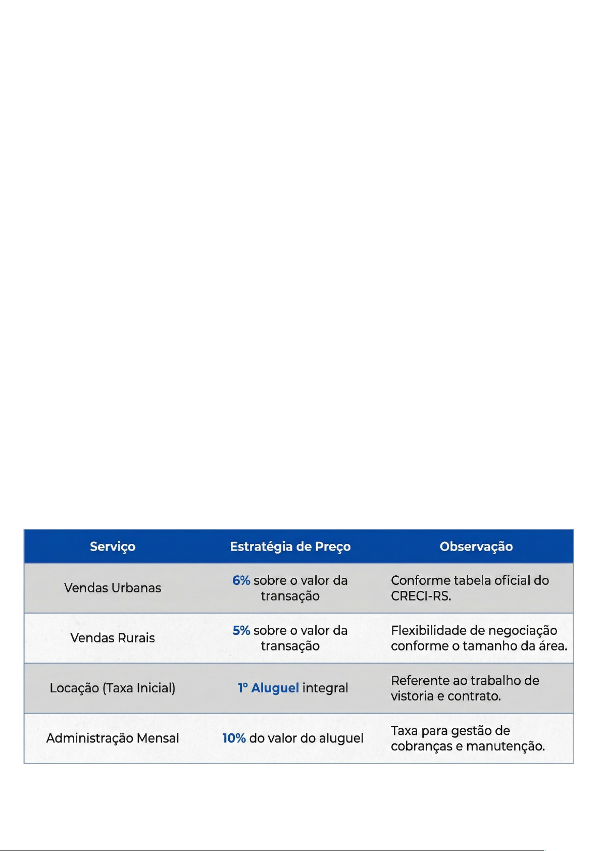 ATIVIDADE 2 1. Identificação dos Serviços Imobiliários Considerando a análise SWOT realizada e o perfil socioeconômico de Chapada/RS, a filial focará nos seguintes serviços para o próximo ciclo anual: · Intermediação na Compra e Venda de Áreas Rurais: Atendimento especializado para expansão de lavouras e comercialização de chácaras de lazer, utilizando avaliação técnica baseada na produtividade da terra. · Consultoria em Diversificação de Patrimônio (Agro-Urbano): Serviço consultivo direcionado a produtores rurais para a conversão de lucros de safra em ativos imobiliários urbanos (casas e salas comerciais) como forma de renda passiva e segurança patrimonial. · Gestão de Lançamentos de Loteamentos: Foco no crescimento urbano da cidade, intermediando a venda de terrenos em novos loteamentos, atendendo à demanda de jovens famílias e novos investidores. · Administração de Locações Urbanas: Gestão completa de aluguéis residenciais e comerciais, garantindo segurança jurídica para proprietários e inquilinos. 2. Estratégias de Precificação As estratégias de preço da Virtually Imóveis Chapada são fundamentadas nas normas do CRECI-RS e adaptadas à realidade financeira da região. 2.1. Comissionamento e Taxas de Serviço 2.2. Segmentação e Valor Médio de Foco A filial concentrará sua força de vendas nos seguintes patamares de preço, visando otimizar o giro de estoque: 1. Imóveis de Entrada (Loteamentos/Casas Populares): R$ 150.000,00 a R$ 280.000,00. Foco em financiamentos bancários (ex: Minha Casa, Minha Vida). 2. Médio Padrão Rural/Urbano: R$ 350.000,00 a R$ 700.000,00. Foco em famílias estabelecidas no comércio e serviços locais. 3. Áreas Rurais Produtivas: Precificação indexada pelo valor da saca de soja. Esta é uma estratégia de precificação psicológica e prática, muito comum na região, que facilita a negociação com o produtor rural ao utilizar sua unidade de valor corrente. 2.3. Diferenciação Competitiva A estratégia de precificação também inclui a Avaliação Mercadológica Gratuita (PTAM) para clientes que optarem pela cláusula de exclusividade de venda por 180 dias. Isso reduz a barreira de entrada para novos clientes e garante um portfólio de imóveis com preços atualizados frente à inflação setorial. image1.png