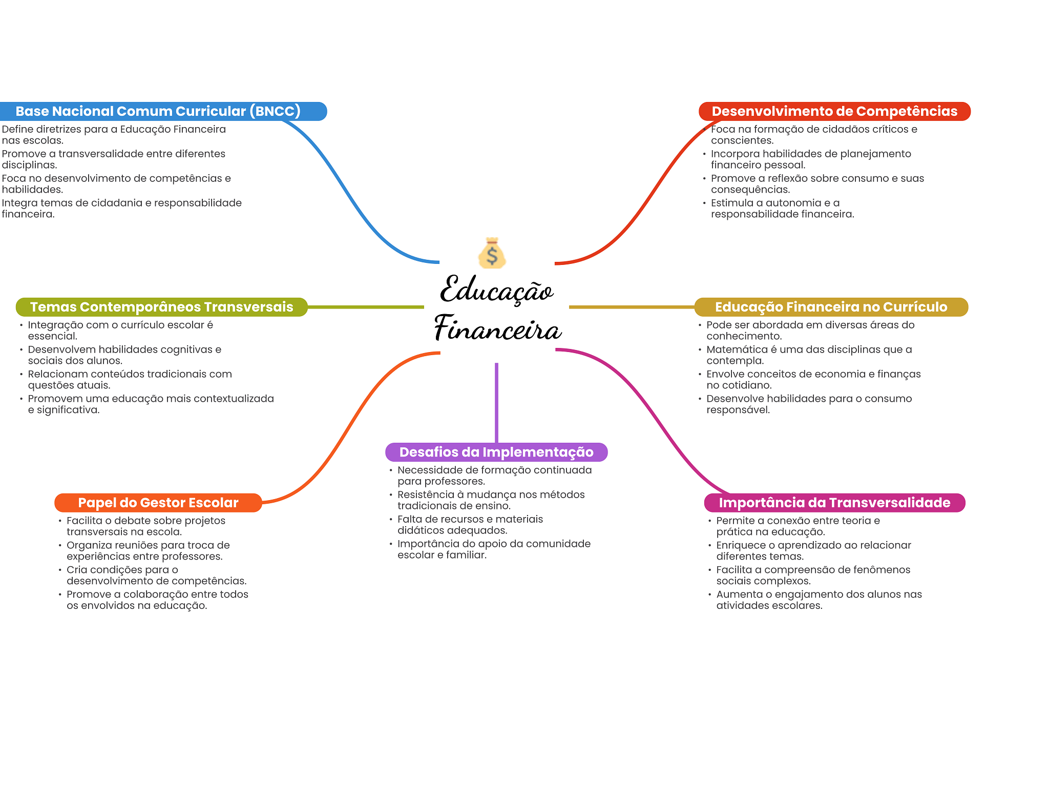 Base Nacional Comum Curricular (BNCC) Desenvolvimento de Competências Define diretrizes para a Educação Financeira Foca na formação de cidadãos críticos e nas escolas. conscientes. Promove a transversalidade entre diferentes Incorpora habilidades de planejamento disciplinas. financeiro pessoal. Foca no desenvolvimento de competências e Promove a reflexão sobre consumo e suas habilidades. consequências. Integra temas de cidadania e responsabilidade Estimula a autonomia e a financeira. responsabilidade financeira. $ Educação Temas Contemporâneos Transversais Educação Financeira no Currículo Integração com currículo escolar é Financeira Pode ser abordada em diversas áreas do essencial. conhecimento. Desenvolvem habilidades cognitivas e Matemática é uma das disciplinas que a sociais dos alunos. contempla. Relacionam conteúdos tradicionais com Envolve conceitos de economia e finanças questões atuais. no cotidiano. Promovem uma educação mais contextualizada Desenvolve habilidades para consumo e significativa. responsável. Desafios da Implementação Necessidade de formação continuada para professores. Resistência à mudança nos métodos Papel do Gestor Escolar tradicionais de ensino. Importância da Transversalidade Facilita debate sobre projetos Falta de recursos e materiais Permite a conexão entre teoria e transversais na escola. didáticos adequados. prática na educação. Organiza reuniões para troca de Importância do apoio da comunidade Enriquece aprendizado ao relacionar experiências entre professores. escolar e familiar. diferentes temas. Cria condições para Facilita a compreensão de fenômenos desenvolvimento de competências. sociais complexos. Promove a colaboração entre todos Aumenta engajamento dos alunos nas envolvidos na educação. atividades escolares.