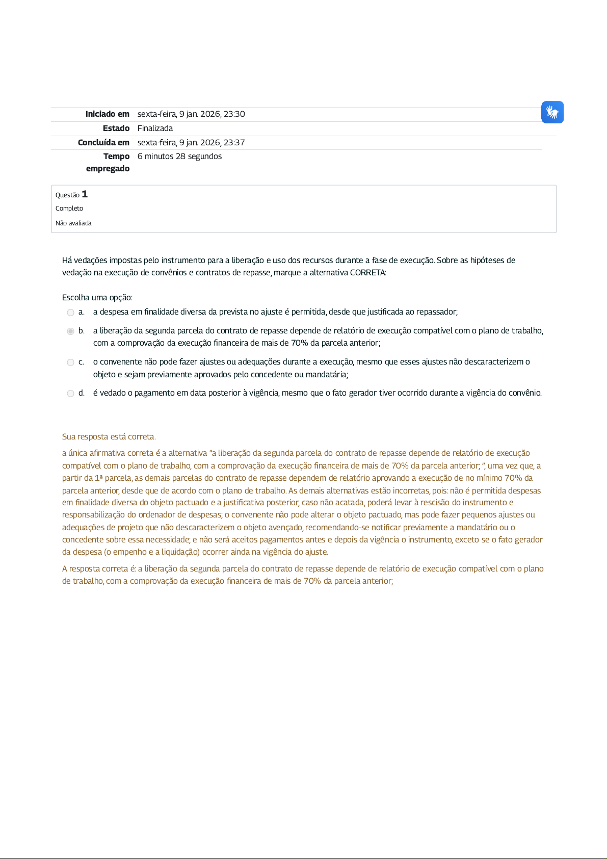 Iniciado em sexta-feira, 9 jan. 2026, 23:30 Estado Finalizada Concluída em sexta-feira, 9 jan. 2026, 23:37 Tempo empregado 6 minutos 28 segundos Questão 1 Completo Não avaliada Há vedações impostas pelo instrumento para a liberação e uso dos recursos durante a fase de execução. Sobre as hipóteses de vedação na execução de convênios e contratos de repasse, marque a alternativa CORRETA: Escolha uma opção: a. a despesa em finalidade diversa da prevista no ajuste é permitida, desde que justificada ao repassador; b. a liberação da segunda parcela do contrato de repasse depende de relatório de execução compatível com o plano de trabalho, com a comprovação da execução financeira de mais de 70% da parcela anterior; c. o convenente não pode fazer ajustes ou adequações durante a execução, mesmo que esses ajustes não descaracterizem o objeto e sejam previamente aprovados pelo concedente ou mandatária; d. é vedado o pagamento em data posterior à vigência, mesmo que o fato gerador tiver ocorrido durante a vigência do convênio. Sua resposta está correta. a única afirmativa correta é a alternativa “a liberação da segunda parcela do contrato de repasse depende de relatório de execução compatível com o plano de trabalho, com a comprovação da execução financeira de mais de 70% da parcela anterior; ”, uma vez que, a partir da 1ª parcela, as demais parcelas do contrato de repasse dependem de relatório aprovando a execução de no mínimo 70% da parcela anterior, desde que de acordo com o plano de trabalho. As demais alternativas estão incorretas, pois: não é permitida despesas em finalidade diversa do objeto pactuado e a justificativa posterior, caso não acatada, poderá levar à rescisão do instrumento e responsabilização do ordenador de despesas; o convenente não pode alterar o objeto pactuado, mas pode fazer pequenos ajustes ou adequações de projeto que não descaracterizem o objeto avençado, recomendando-se notificar previamente a mandatário ou o concedente sobre essa necessidade; e não será aceitos pagamentos antes e depois da vigência o instrumento, exceto se o fato gerador da despesa (o empenho e a liquidação) ocorrer ainda na vigência do ajuste. A resposta correta é: a liberação da segunda parcela do contrato de repasse depende de relatório de execução compatível com o plano de trabalho, com a comprovação da execução financeira de mais de 70% da parcela anterior; Questão 2 Completo Não avaliada Os recursos destinados à execução de contratos de repasse deverão ser mantidos bloqueados em conta específica, somente sendo liberados, na forma ajustada, após a verificação de regular execução do objeto pela mandatária. Sobre a liberação dos recursos do contrato de repasse, avalie as afirmativas abaixo e marque como verdadeiras ou falsas: o contrato de repasse prevê a execução indireta de obras e serviços de engenharia, de modo que a primeira parcela será liberada mediante a comprovação da licitação para a contratação da empresa executora; o concedente deve aprovar o projeto básico e demais documentos técnicos antes de liberar os recursos; a liberação dos recursos relativos à primeira parcela será antecipada para a realização da licitação; o desbloqueio dos recursos federais não depende da comprovação do depósito da contrapartida. verdadeira verdadeira falso falso Sua resposta está correta. para a execução do contrato de repasse, cuja execução ocorre na modalidade indireta (por meio de terceiros contratados), a liberação da 1ª parcela pressupõe a comprovação pelo convenente da realização da licitação para a contratação de pelo menos as metas previstas na 1ª etapa do cronograma de desembolso; a liberação de recursos não será feita antes da aprovação do projeto básico e demais documentos técnicos da obra objeto do contrato de repasse, sendo essa também uma condição suspensiva da execução do instrumento; não haverá antecipação da liberação de recursos, já que devem ser seguidas as etapas previstas no cronograma de desembolso; e o desbloqueio dos recursos depende da comprovação do depósito da contrapartida financeira do convenente, exceto na 1ª parcela. A resposta correta é: o contrato de repasse prevê a execução indireta de obras e serviços de engenharia, de modo que a primeira parcela será liberada mediante a comprovação da licitação para a contratação da empresa executora; → verdadeira, o concedente deve aprovar o projeto básico e demais documentos técnicos antes de liberar os recursos; → verdadeira, a liberação dos recursos relativos à primeira parcela será antecipada para a realização da licitação; → falso, o desbloqueio dos recursos federais não depende da comprovação do depósito da contrapartida. → falso. Questão 3 Completo Não avaliada A 1ª parcela do convênio será depositada na conta vinculada do ajuste após a resolução de eventual condição suspensiva, da conclusão da análise técnica dos documentos exigidos e do aceite pelo concedente do processo licitatório, além do depósito da contrapartida. Sobre a liberação dos recursos do convênio, avalie as afirmativas abaixo e marque-as como verdadeiras ou falsas: o caminhão compactador de lixo poderá ser adquirido pelo Município de Porto Dengoso após a transferência pela Funasa, em parcela única, do repasse previsto no convênio assinado no Módulo III deste curso; o Município de Porto Dengoso firmou convênio com a Funasa para a construção do aterro sanitário no valor de R$ 1.400.000,00, com a contrapartida de R$ 250.000,00, podendo, assim, receber os recursos federais em parcela única; a 1ª parcela não pode exceder a 20% do valor global do convênio, quando há previsão de transferência dos recursos federais em mais de uma parcela; o depósito da contrapartida deve observar o cronograma de desembolso, não podendo ser antecip