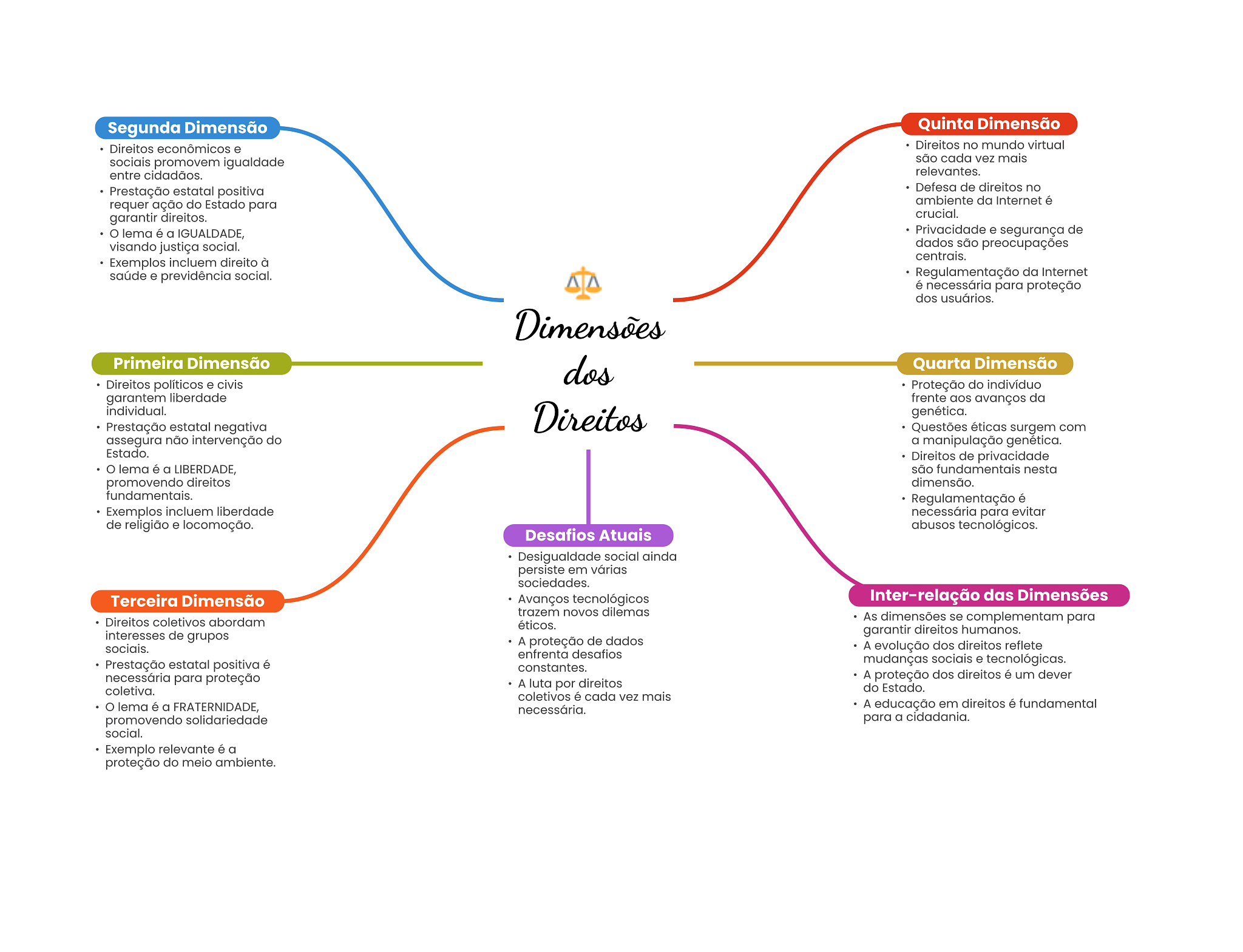 Segunda Dimensão Quinta Dimensão Direitos econômicos e Direitos no mundo virtual sociais promovem igualdade são cada vez mais entre cidadãos. relevantes. Prestação estatal positiva Defesa de direitos no requer ação do Estado para ambiente da Internet é garantir direitos. crucial. lema é a IGUALDADE, Privacidade e segurança de visando justiça social. dados são preocupações centrais. Exemplos incluem direito à saúde e previdência social. Regulamentação da Internet é necessária para proteção dos usuários. Dimensões Primeira Dimensão dos Quarta Dimensão Direitos políticos e civis Proteção do indivíduo garantem liberdade frente aos avanços da individual. Prestação estatal negativa Direitos genética. Questões éticas surgem com assegura não intervenção do a manipulação genética. Estado. Direitos de privacidade lema é a LIBERDADE, são fundamentais nesta promovendo direitos dimensão. fundamentais. Regulamentação é Exemplos incluem liberdade necessária para evitar de religião e locomoção. abusos tecnológicos. Desafios Atuais Desigualdade social ainda persiste em várias sociedades. Terceira Dimensão Avanços tecnológicos Inter-relação das Dimensões trazem novos dilemas Direitos coletivos abordam As dimensões se complementam para éticos. interesses de grupos garantir direitos humanos. A proteção de dados sociais. A evolução dos direitos reflete enfrenta desafios Prestação estatal positiva é mudanças sociais e tecnológicas. constantes. necessária para proteção A proteção dos direitos é um dever A luta por direitos coletiva. do Estado. coletivos é cada vez mais lema é a FRATERNIDADE, necessária. A educação em direitos é fundamental promovendo solidariedade para a cidadania. social. Exemplo relevante é a proteção do meio ambiente.