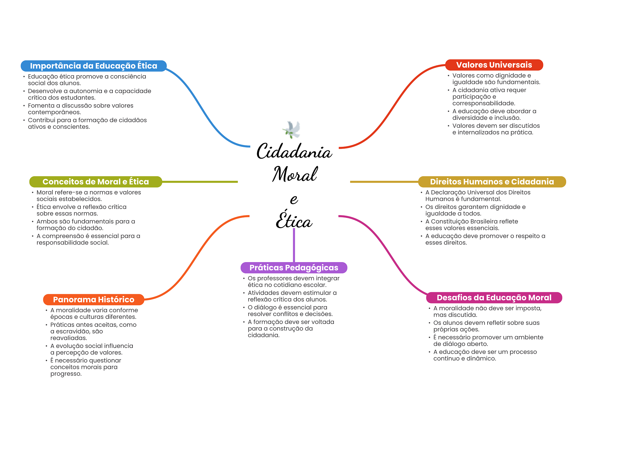 Importância da Educação Ética Valores Universais Educação ética promove a consciência Valores como dignidade e social dos alunos. igualdade são fundamentais. Desenvolve a autonomia e a capacidade A cidadania ativa requer crítica dos estudantes. participação e Fomenta a discussão sobre valores corresponsabilidade. A educação deve abordar a Contribui para a formação de cidadãos diversidade e inclusão. ativos e conscientes. Valores devem ser discutidos e internalizados na prática. Cidadania Moral Conceitos de Moral e Ética Direitos Humanos e Cidadania Moral refere-se a normas e valores A Declaração Universal dos Direitos sociais estabelecidos. e Humanos é fundamental. Ética envolve a reflexão crítica Os direitos garantem dignidade e sobre essas normas. Ambos são fundamentais para a Ética igualdade a todos. A Constituição Brasileira reflete formação do cidadão. esses valores essenciais. A compreensão é essencial para a A educação deve promover respeito a responsabilidade social. esses direitos. Práticas Pedagógicas Os professores devem integrar ética no cotidiano escolar. Atividades devem estimular a Panorama Histórico reflexão crítica dos alunos. Desafios da Educação Moral A moralidade varia conforme diálogo é essencial para A moralidade não deve ser imposta, resolver conflitos e decisões. épocas e culturas diferentes. mas discutida. Práticas antes aceitas, como A formação deve ser voltada Os alunos devem refletir sobre suas a escravidão, são para a construção da próprias ações. reavaliadas. cidadania. É necessário promover um ambiente A evolução social influencia de diálogo aberto. a percepção de valores. A educação deve ser um processo É necessário questionar contínuo e dinâmico. conceitos morais para progresso.