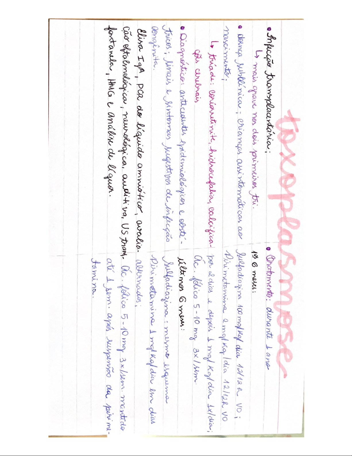 durante 1 ano mais grave nos dois primeiros tri. 10s 6 meses: doença assintomaticas ao Sulfadiazina dia nascimento; 2 mgl Idia 12/12h triade: calcifica- per 2 dias l depois 1 mg/ 1x/dia; cerebrais ac. mg e 6 meses: tricos; sinais sintomas sugestives de mesmo esquema Pirimetamine 1 mgl dia em dias Elisa IqA, PCR do líquido avalia- cão neurológica, auditiva, US ac. mg 3x/sem. mantido fontanela, HMG e análise de 1 sem. após suspensão da pirime- tamina.mutação no glutamina anemia falciforme valina HbAF: normal banho de assents + HbAFS: >4h: uro HbAFC traço AVE HBFS anemia falciforme Sd. torácica aguda febre, dispneia, dor Hipóxia, acidose polimerização Hbs O2 transfusão; ATB falcização - hemolise dura I 20d. devem receber penicilina anemia + dos 2 5 anos. Clínica vaso- necrose avascular da medula, em falcimico é sd torácica aguda, AVE, aplasia internar iniciar ATB medular por B19, to dor de - principal * causa fal- de 1 paracetamol/A opioides vo; morfina EV dactilite - + comum no lactente to sequestro esplinico agudo - mia, Hb 2 + tose reposição de volume SF 99% onanafilaxia emergência médica Adrenalina via IM vasto lateral da multissistimica grave de início coxa na dose de 0,01 mg/ 0,3 mgl, com presença de repetida de metimento gastrointesti nal on B2 agonista 1 jato a cada dx e' clínico! Baseado em criterios - max. 10; grande de mediadores produ zidos Anti EV por e por manifestações respira- edema de laringel Rgl dia EV Pilares do leves - observar de Administrar adrenalina graves - de 24- 48h dorsal com elevação dos MMII - evitar sd. do "coração vazio"; Suple mentar O2 easo sat nasal volemia adequada ABCM "mental"APLV APLV: a sistema imune ptn do leite de vaca; Dificuldade na da pela defi- + comum em crianças e lactentes; ciência de lactase. 20 ou horas apos ingesta. + comum em adultor erianças está urticária, angioedema, vomitos associado à diarreia; sintomas cólicas, diarreia, gases, abdominal test, RAST ou teste de provocação oral. teste de tolerância à mae que amamenta deve excluir leite e derivados da dieta. hidrolisados proteicos, exten- samente hidrolisados ou livres.neo Progressão - zonas de Kramer fisiológica: pico entre 3:e5:d - deposição de Surge a partir do dia de vida, a veloci- BI nor da base e no tronco cerebral dade de aumento da BI 0,5 mg/ hara RN a termo; 24h e dura torno de 3 a 7 dias. Quanto menor a IG, maior a suscetibili- dade à bilirrubínica. primeiras 24 h de vida, a é transportada até ligada a velocidade de aumento da BI > 0,5 mg h 24h e dura mais de nos BD pela enzi- 14 dias. BT > 12 mg/ ma glicuronil BD vai pl tino e ml os BD pode ser convertida em na circula- intero hepática pela enzima beta glu- - de sanque peri rico curonidase Contagem de e RN;do aleitamento 19 dias de fototerapia da, BI, circulação intero pega ruim do depois de 7d de da BT e não das F apresenta a enzima NÃO suspender a amamentação san- FR 48 h em RN que apontam pl hiperbilirrubinemia (BT> 24-36 h Incompatibilidade materno IG de 35,36 l 37 sem / indep do pesol; de AM cl dificuldade on penda de pero > 7% tratado d Presence de hematomas; sexo BT na zona de alto risco intermed sup antes hosp. saber interpretarcongênita com manifestação clínica, em que NÃO alteração liquórica ou radiológica de é necessário Crianca exposta sifilis conginita e teste não treponimico à adequadamente reagente preenchem para Sifilis teste VDRL seja NR INDEPENDENTE do histórico ou 1 titulações menor que a terno de to e das de VDRL. da a única indicação de penicilina Benzatina dose IM é se mãe com the inadequado, desde que RN com HMG e RX de ossos normais e VDRL não reagenteconginita M penicilina de rotina de eristalina EV 50.000 12/12h na sem e e de teste now mico 8/8h por 10 dias a penicilina (VDRL) com 1,3, 6, e 18 m procaina IM 000 1x/dia por 10 interromper com 2 testes Sifilis conginita penicili- NR consecutivos ou na EV 50000 na 19 do titulo 2 sem. e 8/82 19 sem. 10 dias. de mae tratada in adequadamente ou 2 anos; dx epidemiolo gico avaliação laboratorial e de imagem na exames normais e VDRL NR: Prematuridade, BP, cu- penicilina benzatina 50000 IM, tâneas, periostite, sofrimento resp., rinite ictericia, anemia, Exa mes a serem tia generalizada. VDRL, ossos lularidade, Cardia após 2 de idade; co, dinico e laboratorial em a de VDRL do RN ser pelo menos 2 titular articulações de Clutton, fronte na- menor que da rig dentes incisivos medianos sup. defor- to mae tratada adeq VDRh do (dentes de molares em 2x que dela mandibula periorais, ceratite mesmo esquema do intersticial. inadequado