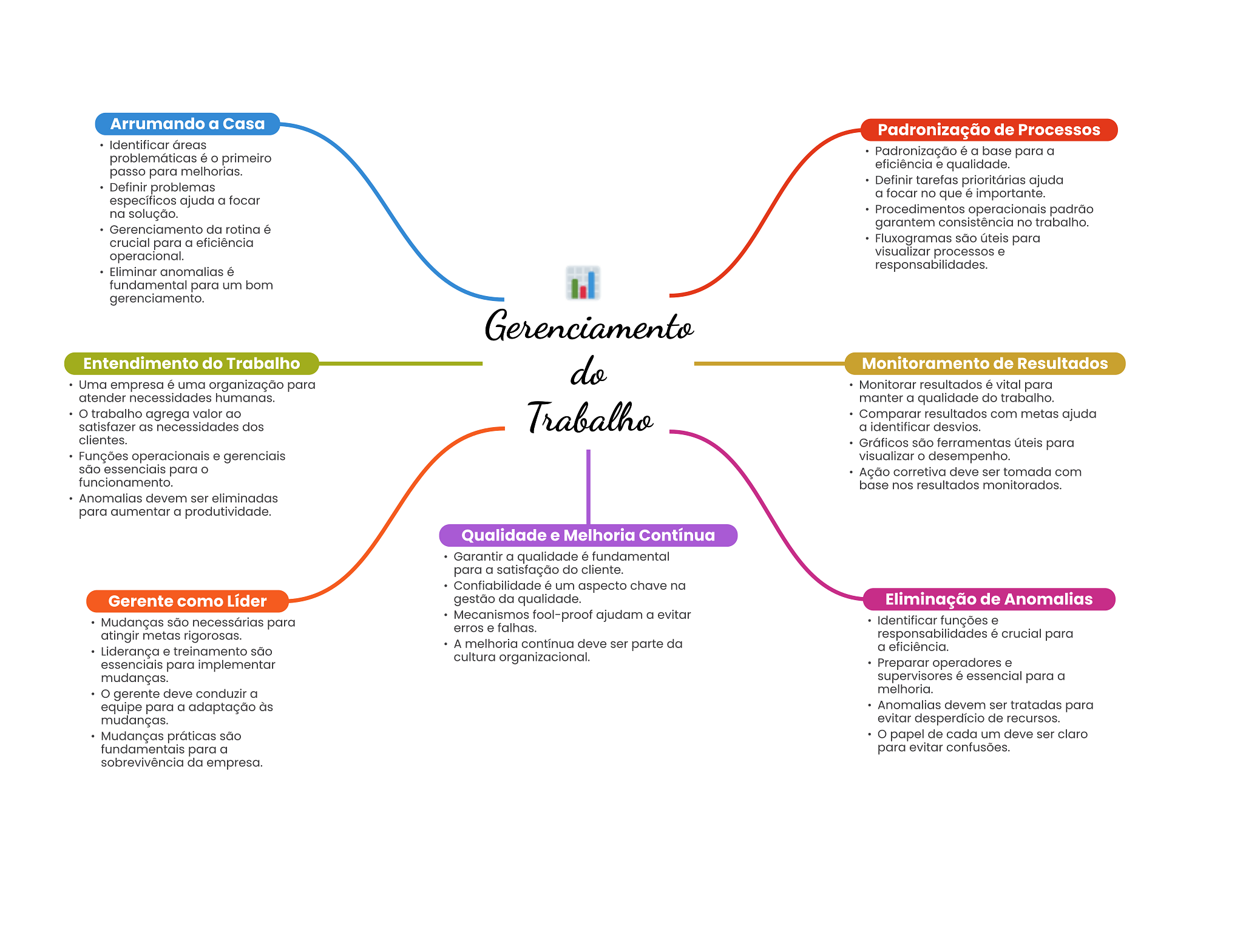 Arrumando a Casa Padronização de Processos Identificar áreas Padronização é a base para a problemáticas é o primeiro eficiência e qualidade. passo para melhorias. Definir tarefas prioritárias ajuda Definir problemas específicos ajuda a focar a focar no que é importante. na solução. Procedimentos operacionais padrão Gerenciamento da rotina é garantem consistência no trabalho. crucial para a eficiência Fluxogramas são úteis para operacional. visualizar processos e Eliminar anomalias é responsabilidades. fundamental para um bom gerenciamento. Gerenciamento Entendimento do Trabalho do Monitoramento de Resultados Uma empresa é uma organização para Monitorar resultados é vital para atender necessidades humanas. manter a qualidade do trabalho. trabalho agrega valor ao Trabalho Comparar resultados com metas ajuda satisfazer as necessidades dos a identificar desvios. clientes. Gráficos são ferramentas úteis para Funções operacionais e gerenciais visualizar desempenho. são essenciais para O Ação corretiva deve ser tomada com funcionamento. base nos resultados monitorados. Anomalias devem ser eliminadas para aumentar a produtividade. Qualidade e Melhoria Contínua Garantir a qualidade é fundamental para a satisfação do cliente. Confiabilidade é um aspecto chave na Gerente como Líder gestão da qualidade. Eliminação de Anomalias Mecanismos fool-proof ajudam a evitar Mudanças são necessárias para erros e falhas. Identificar funções e atingir metas rigorosas. responsabilidades é crucial para A melhoria contínua deve ser parte da Liderança e treinamento são a eficiência. cultura organizacional. essenciais para implementar Preparar operadores e mudanças. supervisores é essencial para a gerente deve conduzir a melhoria. equipe para a adaptação às Anomalias devem ser tratadas para mudanças. evitar desperdício de recursos. Mudanças práticas são papel de cada um deve ser claro fundamentais para a para evitar confusões. sobrevivência da empresa.