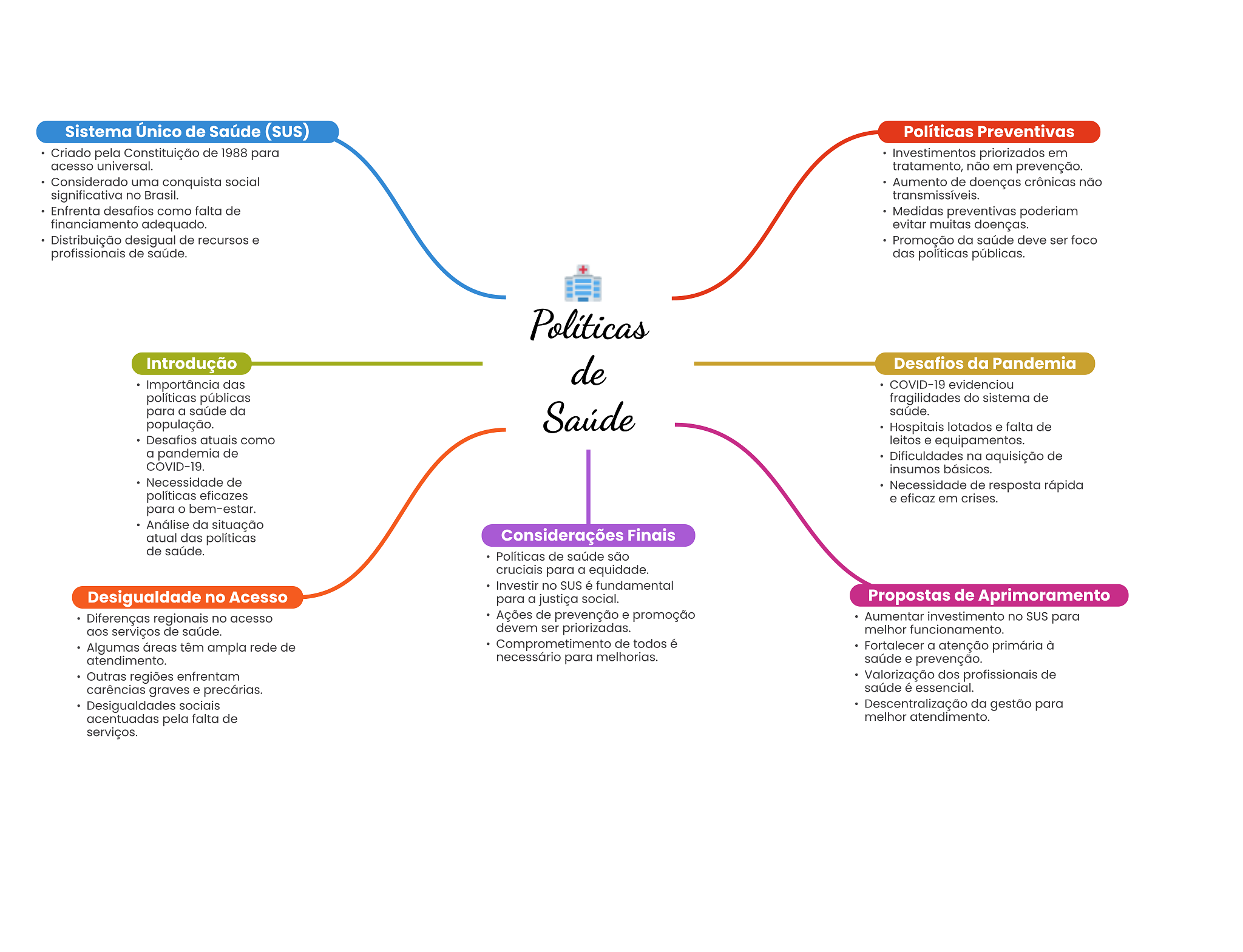 Sistema Único de Saúde (sus) Políticas Preventivas Criado pela Constituição de 1988 para Investimentos priorizados em acesso universal. tratamento, não em prevenção. Considerado uma conquista social Aumento de doenças crônicas não significativa no Brasil. transmissíveis. Enfrenta desafios como falta de Medidas preventivas poderiam financiamento adequado. evitar muitas doenças. Distribuição desigual de recursos e Promoção da saúde deve ser foco profissionais de saúde. das políticas públicas. Introdução de Desafios da Pandemia Importância das COVID-19 evidenciou políticas públicas fragilidades do sistema de para a saúde da Saúde saúde. população. Hospitais lotados e falta de Desafios atuais como leitos e equipamentos. a pandemia de Dificuldades na aquisição de COVID-19. insumos básicos. Necessidade de Necessidade de resposta rápida políticas eficazes e eficaz em crises. para bem-estar. Análise da situação atual das políticas Considerações Finais de saúde. Políticas de saúde são cruciais para a equidade. Investir no SUS é fundamental Desigualdade no Acesso para a justiça social. Propostas de Aprimoramento Diferenças regionais no acesso Ações de prevenção e promoção Aumentar investimento no SUS para aos serviços de saúde. devem ser priorizadas. melhor funcionamento. Algumas áreas têm ampla rede de Comprometimento de todos é Fortalecer a atenção primária à atendimento. necessário para melhorias. saúde e prevenção. Outras regiões enfrentam Valorização dos profissionais de carências graves e precárias. saúde é essencial. Desigualdades sociais Descentralização da gestão para acentuadas pela falta de melhor atendimento. serviços.