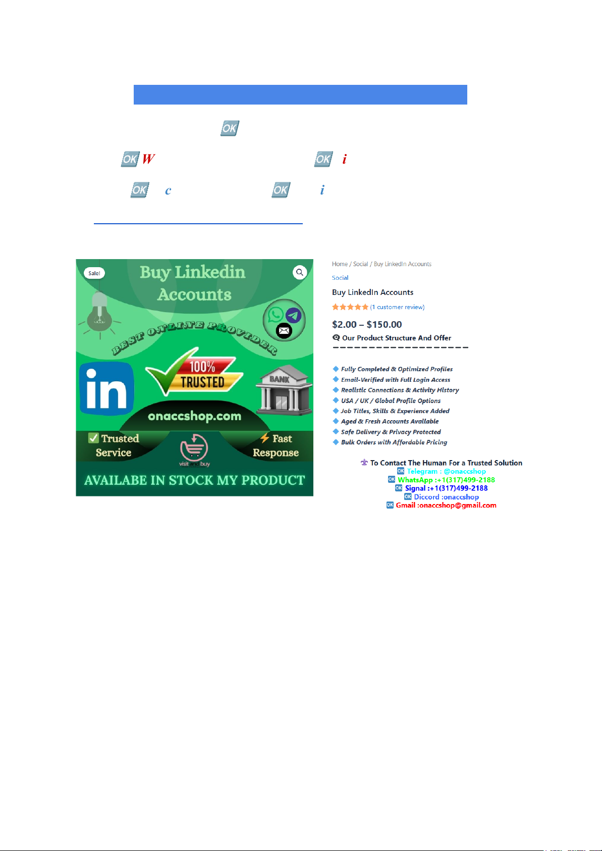 To Contact The Human For a Trusted Solution 🆗 Telegram : @onaccshop 🆗 WhatsApp :+1(317)499-2188 🆗 Signal :+1(317)499-2188 🆗 Diccord :onaccshop 🆗 Gmail :onaccshop@gmail.com Buy professional-quality LinkedIn accounts built for long-term use. Verified, aged profiles from ONAccShop.com with lifetime reliability for business and marketing success. Shop : https://onaccshop.com/product/buy-linkedin-accounts/ Introduction In the competitive world of professional networking, quality matters more than quantity. When you buy LinkedIn accounts for long-term use, you're making an investment in your professional future, not just purchasing temporary access. The difference between a low-quality account that gets banned within weeks and a professional-grade profile that serves you for years lies entirely in the verification standards, aging process, and provider reputation. Professional-quality LinkedIn accounts represent the gold standard for businesses, marketers, and professionals who understand that sustainable success requires reliable foundations. These premium accounts combine authentic verification, natural activity histories, and compliance-focused preparation to deliver profiles that LinkedIn's algorithms recognize as legitimate users rather than suspicious purchases. https://onaccshop.com/product/buy-linkedin-accounts/ ONAccShop.com leads the industry in providing professional-quality LinkedIn accounts specifically engineered for long-term reliability. Their rigorous verification processes and commitment to quality ensure every account you purchase delivers consistent value for years, not just months. Let's explore what makes these accounts worth the investment and how to buy the right profiles for your needs. What Defines Professional-Quality LinkedIn Accounts? Complete Verification Standards Professional accounts include full email and phone verification with real carrier validation. Unlike basic accounts using temporary email services or virtual numbers that LinkedIn flags instantly, quality accounts feature legitimate contact information that passes platform security checks consistently. Aged Activity History Premium accounts come with 6-12 months of natural activity patterns including profile views, content engagement, and gradual connection growth. This aging process creates algorithmic trust that new accounts simply cannot replicate, ensuring your profile enjoys full platform privileges from day one. Authentic Connection Networks Quality accounts feature genuine connections with other verified users across relevant industries. These aren't bot networks or fake profiles—they're real professionals creating the social proof LinkedIn's algorithms prioritize when determining account credibility and content reach. Complete Professional Profiles Professional-grade accounts include high-quality photos, detailed work histories, skill endorsements, recommendations, and industry-relevant content. This completeness signals legitimacy to both LinkedIn's systems and your future connections, establishing immediate credibility. Clean Compliance Records Zero violations, restrictions, or suspicious activity flags distinguish professional accounts from risky alternatives. ONAccShop.com guarantees clean histories ensuring you receive accounts with full platform access and no hidden compliance issues that could jeopardize long-term use. https://onaccshop.com/product/buy-linkedin-accounts/ Why Buy Professional-Quality Accounts for Long-Term Use? Business Development Investment Sales teams require reliable LinkedIn accounts that won't disappear mid-campaign. Professional accounts provide stable foundations for building client relationships, nurturing prospects, and generating consistent leads over years. Low-quality alternatives risk losing months of relationship-building overnight through unexpected bans. Marketing Campaign Continuity Content marketers invest significant time building audience engagement and thought leadership. Professional-quality accounts protect these investments by ensuring profile longevity. Your content strategy remains intact, your follower base continues growing, and your authority compounds over time rather than resetting with account suspensions. Recruitment Efficiency HR professionals need dependable LinkedIn access for ongoing talent acquisition. Professional accounts maintain recruiter presence, preserve candidate relationships, and sustain employer branding efforts consistently. Quality accounts eliminate the disruption and reputation damage caused by suspended profiles. Personal Brand Building Your professional reputation develops over years, not weeks. Investing in quality LinkedIn accounts ensures your personal brand grows steadily without interruptions. The credibility you build through consistent engagement, valuable content, and authentic networking remains protected through superior account quality. How to Buy Professional-Quality LinkedIn Accounts Step 1: Choose Reputable Providers Start with established providers known for quality and reliability. ONAccShop.com consistently ranks as the most trusted source for professional-grade LinkedIn accounts, with thousands of verified reviews and industry-leading customer satisfaction. Their commitment to quality over quantity ensures every account meets strict verification standards. Step 2: Verify Account Specifications https://onaccshop.com/product/buy-linkedin-accounts/ Professional accounts should clearly specify verification status, account age, connection count, and activity history. ONAccShop.com provides detailed account profiles showing exactly what you're purchasing, eliminating guesswork and ensuring informed decisions. Step 3: Prioritize Aged Accounts Accounts aged 6+ months significantly outperform newer profiles in both algorithm trust and suspension resistance. The premium pricing for aged accounts represents genuine value through extended reliability and immediate full-platform functionality. St