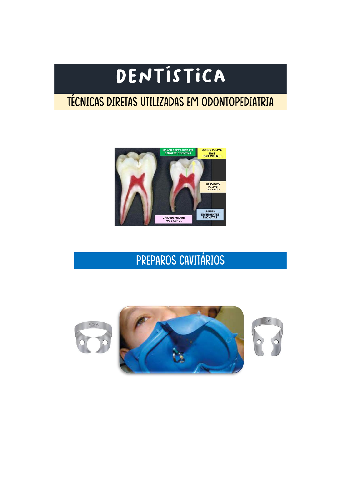 Impresso por divinojesu1, E-mail divinojesu1@gmail.com para uso pessoal e privado. Este material pode ser protegido por direitos autorais e não pode ser reproduzido ou repassado para terceiros. 17/09/2023 16:44:29 Clínica Integrada da Criança e do Adolescente • Diferenças entre dentes decíduos e permanentes os dentes decíduos apresentam : estruturas mais fin em relação aos dentes permanentes. Cárie alcança com mais as facilidade, cornos pulpares proeminentes, estruturas d dentina e esmalte mais finas e – maior facilidade de dar tratamento endodôntico em dentes decíduos. • OBS: Remoção parcial de cárie - tratamento conservador - remove apenas a dentina infectada amolecida, a dentina afetada endurecida deixa . • Isolamento absoluto: resina - principalmente em dente inferior é necessário isolamento ab luto. OBS: se for uma gota de saliva, perde todo condicionamento so o ácido e sistema adesivo preciso refazer. Se deixar a saliva e não refazer = – comprometimento da restauração cai com facilidade. – Grampos W8A (molares parcialmente erupcionados) (dentes com pouca e 26 retenção) mais utilizados em odontopediatria. • Isolamento relativo (com algodão) com uso de sugador de alta potência em tempo : integral. Impresso por divinojesu1, E-mail divinojesu1@gmail.com para uso pessoal e privado. Este material pode ser protegido por direitos autorais e não pode ser reproduzido ou repassado para terceiros. 17/09/2023 16:44:29 Clínica Integrada da Criança e do Adolescente • Matrizes e porta matrizes: maior uso de matrizes individuais em ; unimatrix maior “T” – problema se perdeu a parede para vestibular e lingual não tem muito onde apoiar, não fica bem adaptada. • Amálgama adesivo: amálgama + sistemas adesivos. - Isolamento absoluto; - Condicionamento ácido com ácido fosfórico a 37%; - Aplicação do adesivo dentinário autopolimerizável Concise (3M) ; - Cimento resinoso; ou Impresso por divinojesu1, E-mail divinojesu1@gmail.com para uso pessoal e privado. Este material pode ser protegido por direitos autorais e não pode ser reproduzido ou repassado para terceiros. 17/09/2023 16:44:29 Clínica Integrada da Criança e do Adolescente - MAIS INDICADO Primer (fotopolimerizar) + cimento de ionômero de vidro – fotopolimerizável em todas as paredes; condensar o amálgama no ionômero ainda mole porque ionômero fica só aonde eu espremer, ele escoa para o lado. Após o – o tempo de presa do amálgama, realizar a fo polimerização das margens do to ionômero; - Brunimento e escultura final; - Verificação da oclusão; - Polimento após 1 semana. - Extensão coronária que prejudiquem a retenção. • Técnica da réplica oclusal: - M dagem; ol - Resinas acrílicas; - Materiais restauradores resinas fotopolimerizáveis; CIV modificados por resina ou – convencionais. Resina acrílica transparente ou por selante (não fotopolimerizar para destacar), moldar, fazer uma marquinha pra indicar onde ela encaixa (ponto guia), remove toda a lesão de cárie, fazer todo o condicionamento ácido e sistema adesivo, na última camada de resina coloco ela em posição, aperto, faz a moldagem negativa do dente anterior, fotopolimeriza, checagem oclusal, e o dente está prontinho mesmas – características do dente antes de tirar a cárie. INDICAÇÃO: estruturas íntegras que você sabe que na hora que remover vai fazer um cáries ocultas. “buracão” – Dentes decíduos apresentam uma menor coroa clínica hora da troca muito – – bruxismo fisiológico restauração parar em dente anterior é mais difícil. Criança – também não tem cuidado. Precisa sempre usar artifícios para melhorar a retenção dessa resina: • Biselamento: aumenta a força de união das resinas compostas; fornecem um melhor padrão de condicionamento; aumento da área disponível para o condicionamento ácido; estética disfarça a união dente-resina. – Impresso por divinojesu1, E-mail divinojesu1@gmail.com para uso pessoal e privado. Este material pode ser protegido por direitos autorais e não pode ser reproduzido ou repassado para terceiros. 17/09/2023 16:44:29 Clínica Integrada da Criança e do Adolescente Opções de tratamento • Lesão classe III em esmalte: desgaste por lixamento (tira de lixa) + aplicação tópica de flúor. • Lesão classe III – biselamento na vestibular com brocas de polimento, resina composta ou ionômero de vidro. • Lesão classe IV – – remoção do tecido cariado, retenção adicional cauda de andorinha (largura da broca 1012, 1014) na palatina envelopa o dente resina na vestibular e – – na palatina, bisel. • Reconstrução posterior: - Indicações: manutenção do espaço, recuperação da oclusão e dimensão vertical. - Tipos: restaurações metálicas fundidas (pouco comum), coroas de aço (só se usa em dentes decíduos, contato proximal não é perfeito porque não foi moldado, já está pronto; caixinha com vários tamanhos de coroa; medir o espaço que eu tenho com compasso medir no – preparo e na coroinha, escolher e adaptar, se estiver alta corta na apical eencher com , pr cimento, alicate para coroa de aço e aperto), restaurações indiretas com resina composta (MAIS UTILIZADO). Restauração indireta em resina composta fotopolimerizável • Técnica de trabalho: • Primeira fase clínica: mover toda a restauração fraturada; preparo re – expulsivo para oclusal aplainando-se as paredes cavitárias; eliminar qualquer área de retenção – colocando-se cimento de ionômero de vidro; moldagem com material à base de silicona pasta leve e pasta pesada moldagem parcial cotosol no dente do paciente – – ; e ele vai embora; • Segunda fase laboratorial: vaz o gesso; obtenção do modelo de gesso pedra; traçar ar a delimitação das margens do preparo a serem reconstruídas no modelo (com grafite); ; passar isolante no modelo colocar a matriz e faz a restauração por er incrementos de resina composta