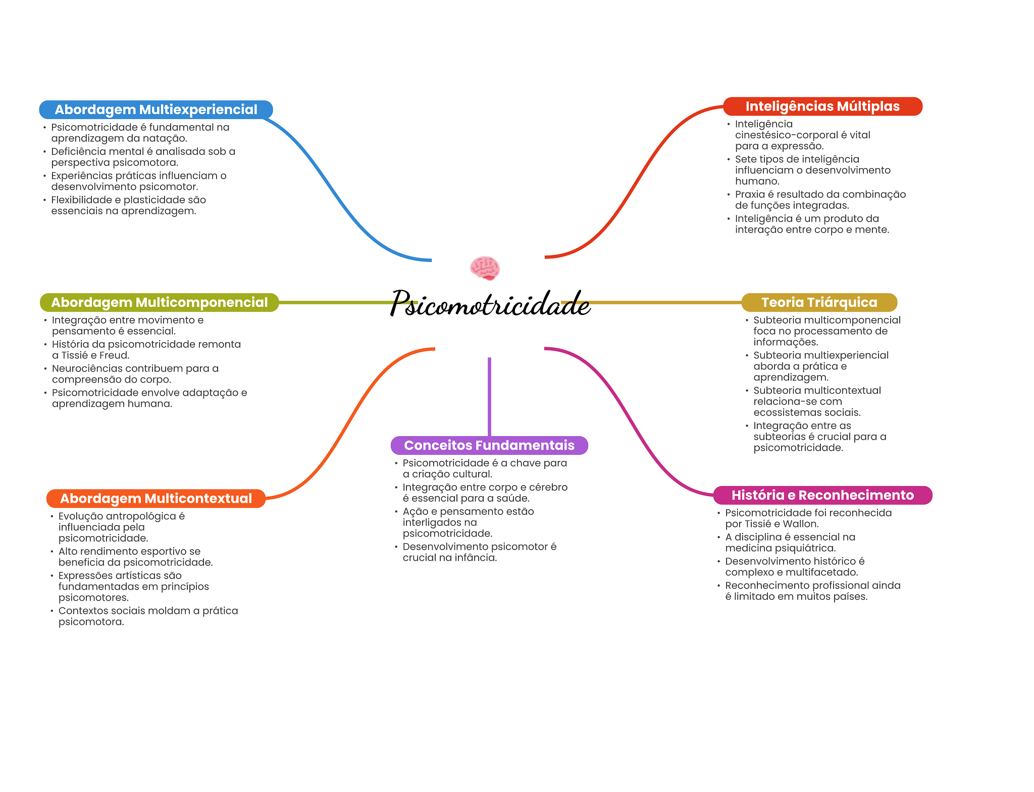 Abordagem Multiexperiencial Inteligências Múltiplas Psicomotricidade é fundamental na Inteligência aprendizagem da natação. cinestésico-corporal é vital Deficiência mental é analisada sob a para a expressão. perspectiva psicomotora. Sete tipos de inteligência influenciam desenvolvimento Experiências práticas influenciam humano. desenvolvimento psicomotor. Flexibilidade e plasticidade são Praxia é resultado da combinação essenciais na aprendizagem. de funções integradas. Inteligência é um produto da interação entre corpo e mente. Abordagem Multicomponencial Psicomotricidade Teoria Triárquica Integração entre movimento e Subteoria multicomponencial pensamento é essencial. foca no processamento de História da psicomotricidade remonta informações. a Tissié e Freud. Subteoria multiexperiencial Neurociências contribuem para a aborda a prática e compreensão do corpo. aprendizagem. Psicomotricidade envolve adaptação e Subteoria multicontextual aprendizagem humana. relaciona-se com ecossistemas sociais. Integração entre as subteorias é crucial para a Conceitos Fundamentais psicomotricidade. Psicomotricidade é a chave para a criação cultural. Integração entre corpo e cérebro Abordagem Multicontextual é essencial para a saúde. História e Evolução antropológica é Ação e pensamento estão Psicomotricidade foi reconhecida influenciada pela interligados na por Tissié e Wallon. psicomotricidade. psicomotricidade. A disciplina é essencial na Alto rendimento esportivo se Desenvolvimento psicomotor é medicina psiquiátrica. crucial na infância. beneficia da psicomotricidade. Desenvolvimento histórico é Expressões artísticas são complexo e multifacetado. fundamentadas em princípios Reconhecimento profissional ainda psicomotores. é limitado em muitos países. Contextos sociais moldam a prática psicomotora.