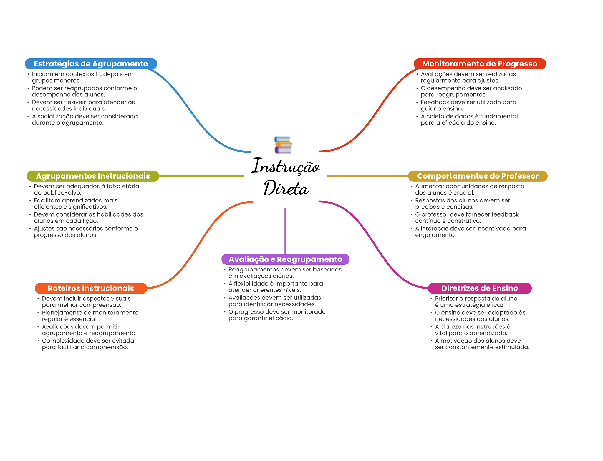 Estratégias de Agrupamento Monitoramento do Progresso Iniciam em contextos 1:1, depois em Avaliações devem ser realizadas grupos menores. regularmente para ajustes. Podem ser reagrupados conforme desempenho deve ser analisado desempenho dos alunos. para reagrupamentos. Devem ser flexíveis para atender às Feedback deve ser utilizado para necessidades individuais. guiar ensino. A socialização deve ser considerada A coleta de dados é fundamental durante agrupamento. para a eficácia do ensino. Instrução Agrupamentos Instrucionais Comportamentos do Professor Devem ser adequados à faixa etária Direta Aumentar oportunidades de resposta do público-alvo. dos alunos é crucial. Facilitam aprendizados mais Respostas dos alunos devem ser eficientes e significativos. precisas e concisas. Devem considerar as habilidades dos professor deve fornecer feedback alunos em cada lição. contínuo e construtivo. Ajustes são necessários conforme A interação deve ser incentivada para progresso dos alunos. engajamento. Avaliação e Reagrupamento Reagrupamentos devem ser baseados em avaliações diárias. A flexibilidade é importante para Roteiros Instrucionais atender diferentes níveis. Diretrizes de Ensino Devem incluir aspectos visuais Avaliações devem ser utilizadas Priorizar a resposta do aluno para melhor compreensão. para identificar necessidades. é uma estratégia eficaz. Planejamento de monitoramento O progresso deve ser monitorado ensino deve ser adaptado às regular é essencial. para garantir eficácia. necessidades dos alunos. Avaliações devem permitir A clareza nas instruções é agrupamento e reagrupamento. vital para aprendizado. Complexidade deve ser evitada A motivação dos alunos deve para facilitar a compreensão. ser constantemente estimulada.