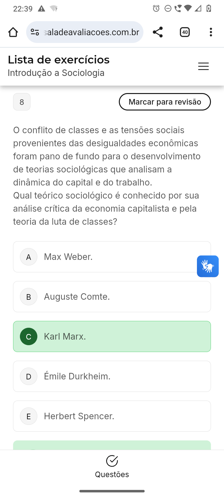 22:39 saladeavaliacoes.com.br 40 Lista de exercícios Introdução a Sociologia 8 Marcar para revisão conflito de classes e as tensões sociais provenientes das desigualdades econômicas foram pano de fundo para o desenvolvimento de teorias sociológicas que analisam a dinâmica do capital e do trabalho. Qual teórico sociológico é conhecido por sua análise crítica da economia capitalista e pela teoria da luta de classes? A Max Weber. Auguste Comte. Karl Marx. D Émile Durkheim. E Herbert Spencer. Questões