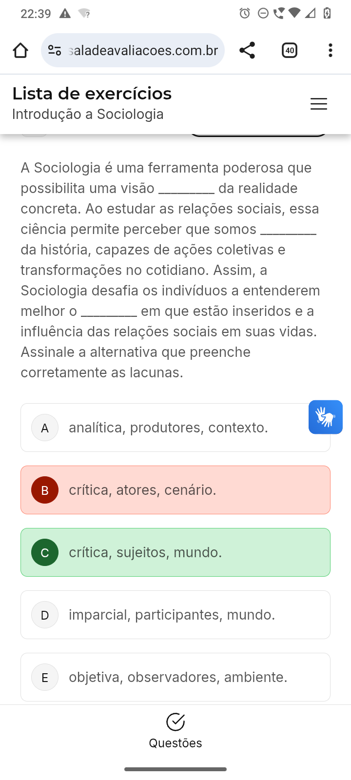 22:39 saladeavaliacoes.com.br 40 Lista de exercícios Introdução a Sociologia A Sociologia é uma ferramenta poderosa que possibilita uma visão da realidade concreta. Ao estudar as relações sociais, essa ciência permite perceber que somos da história, capazes de ações coletivas e transformações no cotidiano. Assim, a Sociologia desafia os indivíduos a entenderem melhor o em que estão inseridos e a influência das relações sociais em suas vidas. Assinale a alternativa que preenche corretamente as lacunas. A analítica, produtores, contexto. crítica, atores, cenário. crítica, sujeitos, mundo. D imparcial, participantes, mundo. E objetiva, observadores, ambiente. Questões