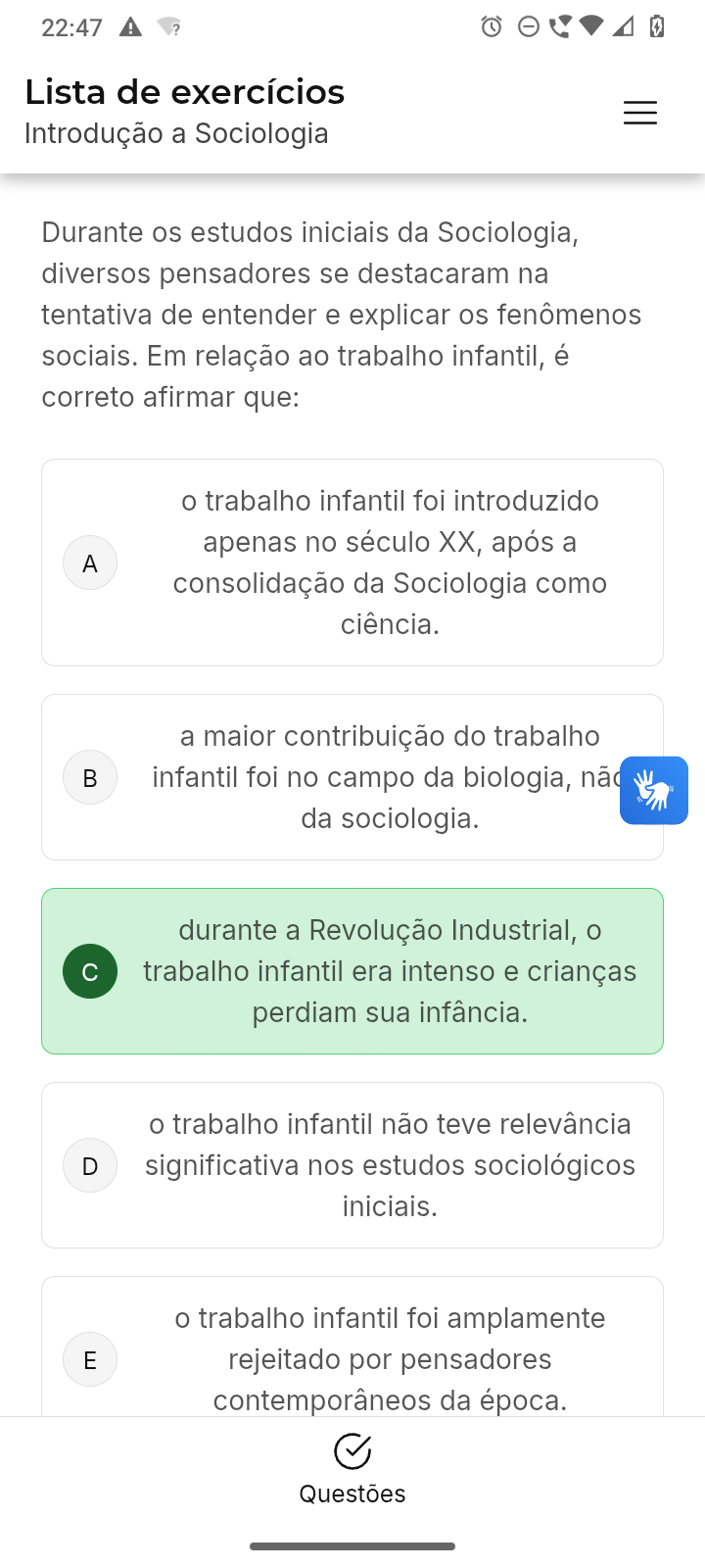 22:47 Lista de exercícios Introdução a Sociologia Durante os estudos iniciais da Sociologia, diversos pensadores se destacaram na tentativa de entender e explicar os fenômenos sociais. Em relação ao trabalho infantil, é correto afirmar que: trabalho infantil foi introduzido apenas no século XX, após a A consolidação da Sociologia como ciência. a maior contribuição do trabalho B infantil foi no campo da biologia, não da sociologia. durante a Revolução Industrial, trabalho infantil era intenso e crianças perdiam sua infância. o trabalho infantil não teve relevância D significativa nos estudos sociológicos iniciais. o trabalho infantil foi amplamente E rejeitado por pensadores contemporâneos da época. Questões