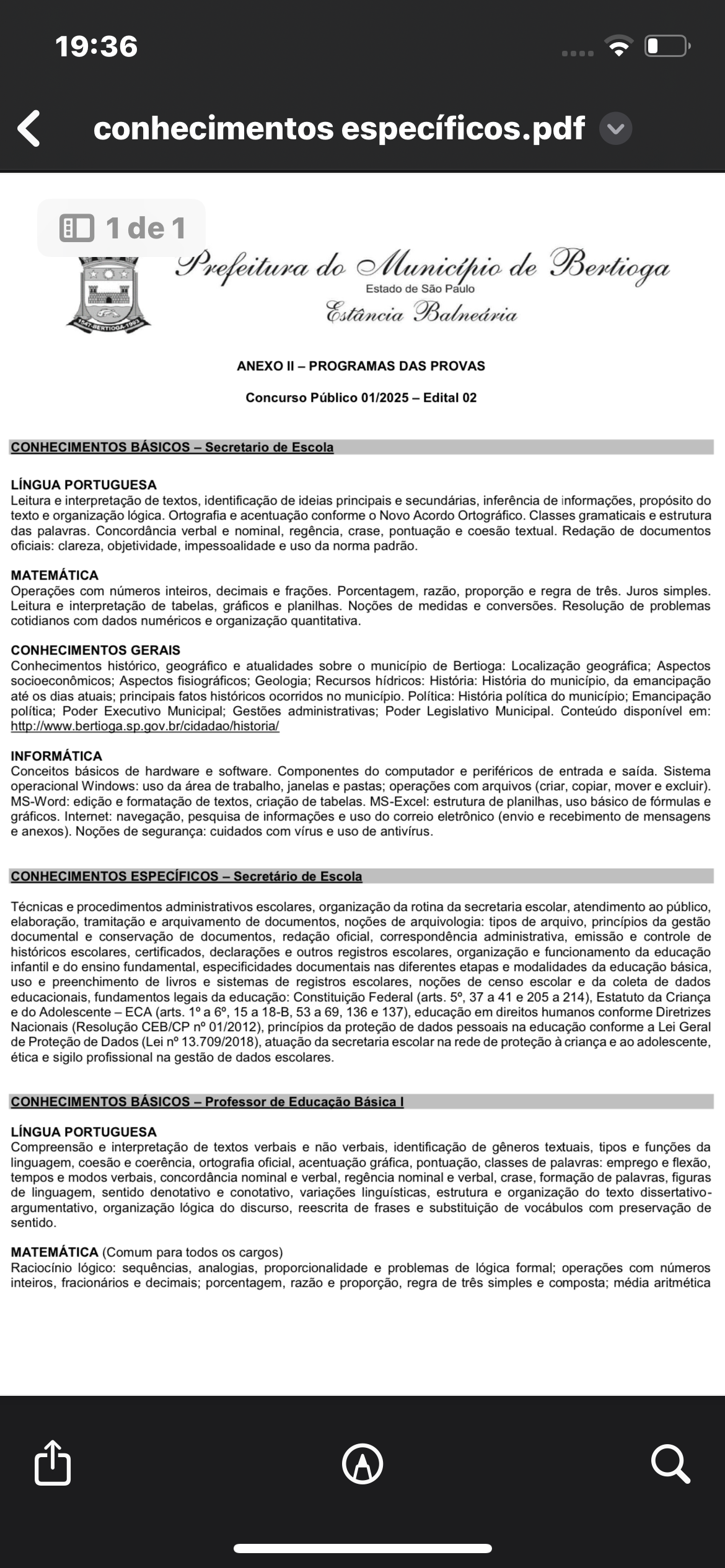 19:36 conhecimentos específicos.pdf 1 de 1 Prefeitura do Município de Bertioga Estado de São Paulo Estância Balneária ANEXO II PROGRAMAS DAS PROVAS Concurso Público 01/2025 Edital 02 CONHECIMENTOS BÁSICOS Secretario de Escola LÍNGUA PORTUGUESA Leitura e interpretação de textos, identificação de ideias principais e secundárias, inferência de informações, propósito do texto e organização lógica. Ortografia e acentuação conforme Novo Acordo Ortográfico. Classes gramaticais e estrutura das palavras. Concordância verbal e nominal, regência, crase, pontuação e coesão textual. Redação de documentos oficiais: clareza, objetividade, impessoalidade e uso da norma padrão. MATEMÁTICA Operações com números inteiros, decimais e frações. Porcentagem, razão, proporção e regra de três. Juros simples. Leitura e interpretação de tabelas, gráficos e planilhas. Noções de medidas e conversões. Resolução de problemas cotidianos com dados numéricos e organização quantitativa. GERAIS Conhecimentos histórico, geográfico e atualidades sobre município de Bertioga: Localização geográfica; Aspectos socioeconômicos; Aspectos fisiográficos; Geologia; Recursos hídricos: História: História do município, da emancipação até os dias atuais; principais fatos históricos ocorridos no município. Política: História política do município; Emancipação política; Poder Executivo Municipal; Gestões administrativas; Poder Legislativo Municipal. Conteúdo disponível em: http://www.bertioga.sp.gov.br/cidadao/historia/ INFORMÁTICA Conceitos básicos de hardware e software. Componentes do computador e periféricos de entrada e saída. Sistema operacional Windows: uso da área de trabalho, janelas e pastas; operações com arquivos (criar, copiar, mover e excluir). MS-Word: e formatação de textos, criação de tabelas. MS-Excel: estrutura de planilhas, uso básico de fórmulas e gráficos. Internet: navegação, pesquisa de informações e uso do correio eletrônico (envio e recebimento de mensagens e anexos). Noções de segurança: cuidados com vírus e uso de antivírus. CONHECIMENTOS ESPECÍFICOS Secretário de Escola Técnicas e procedimentos administrativos escolares, organização da rotina da secretaria escolar, atendimento ao público, elaboração, tramitação e arquivamento de documentos, noções de arquivologia: tipos de arquivo, princípios da gestão documental e conservação de documentos, redação oficial, correspondência administrativa, emissão e controle de históricos escolares, certificados, declarações e outros registros escolares, organização e funcionamento da educação infantil e do ensino fundamental, especificidades documentais nas diferentes etapas e modalidades da educação básica, uso e preenchimento de livros e sistemas de registros escolares, noções de censo escolar e da coleta de dados educacionais, fundamentos legais da educação: Constituição Federal (arts. 5°, 37 a 41 e 205 a 214), Estatuto da Criança e do Adolescente ECA (arts. a 6°, 15 a 18-B, 53 a 69, 136 e 137), educação em direitos humanos conforme Diretrizes Nacionais (Resolução CEB/CP n° 01/2012), princípios da proteção de dados pessoais na educação conforme a Lei Geral de Proteção de Dados (Lei n° 13.709/2018), atuação da secretaria escolar na rede de proteção à criança e ao adolescente, ética e sigilo profissional na gestão de dados escolares. CONHECIMENTOS BÁSICOS Professor de Educação Básica LÍNGUA PORTUGUESA Compreensão e interpretação de textos verbais e não verbais, identificação de gêneros textuais, tipos e funções da linguagem, coesão e coerência, ortografia oficial, acentuação gráfica, pontuação, classes de palavras: emprego e flexão, tempos e modos verbais, concordância nominal e verbal, regência nominal e verbal, crase, formação de palavras, figuras de linguagem, sentido denotativo e conotativo, variações linguísticas, estrutura e organização do texto dissertativo- argumentativo, organização lógica do discurso, reescrita de frases e substituição de vocábulos com preservação de sentido. MATEMÁTICA (Comum para todos cargos) Raciocínio lógico: sequências, analogias, proporcionalidade e problemas de lógica formal; operações com números inteiros, fracionários e decimais; porcentagem, razão e proporção, regra de três simples e composta; média aritmética A
