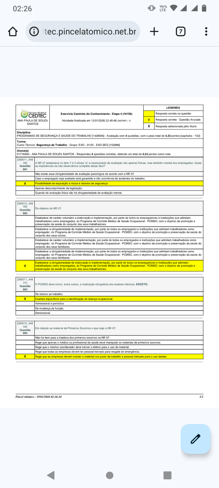 02:26 LTE + 7 LEGENDA ESCOLA CEDTEC Exercicio Caminho do Conhecimento Etapa 4 (16156) Resposta correta na questão ANA PAULA DE SOUZA Atividade finalizada em 12/01/2026 22:49:48 (3457801 1) # Resposta correta Questão Anulada SANTOS Resposta selecionada pelo Aluno Disciplina: PROGRAMAS DE SEGURANÇA E SAUDE DO TRABALHO [1428594] Avaliação com 4 com peso total de 4.33 pontos 102] Turma: Curso Segurança do Trabalho Grupo: EAD 01/25 EAD SEG [152686] Aluno(a): 91716450 ANA PAULA DE SOUZA SANTOS Respondeu 4 questões obtendo um total de 4.33 pontos como nota 350011_448 05] A NR 07 estabelece no item 7.4.2 alinea "a" a necessidade de avaliação não apenas mas também mental dos empregados. Quais Questão as implicâncias da não observância completa desse item? 001 Não existe essa obrigatoriedade de avaliação de acordo com a NR 07. Caso empregado seja avaliado será garantido a não de acidentes do Possibilidade de exposição a riscos e desvios de segurança. Apenas descumprimento da legislação. Quando avaliação fisica não ha obrigatoriedade de avaliação 350010_448 00] Questão Do objetivo da NR 07: 002 Estabelece de voluntário a elaboração e por parte de todos os empregadores e instituições que admitam trabalhadores como do Programa de Controle Médico de Ocupacional com objetivo de promoção e preservação da saúde do conjunto dos seus Estabelece a obrigatoriedade de implementação, por parte de todos os empregados e instituições que admitam trabalhadores como empregador, do Programa de Controle Médico de Saude Ocupacional com objetivo de promoção e preservação da saúde do conjunto dos seus sócios. Estabelece de voluntário a por parte de todos os empregados e instituições que admitam trabalhadores como empregador, do Programa de Controle de Saude Ocupacional com objetivo de promoção e preservação da saúde do conjunto dos seus familiares Estabelece a obrigatoriedade de por parte de todos os empregados e instituições que admitam trabalhadores como empregador, do Programa de Controle Médico de Ocupacional com objetivo de promoção e preservação da saúde do conjunto dos seus Estabelece a obrigatoriedade de elaboração e por parte de todos empregadores e instituições que admitam trabalhadores como do Programa de Controle Médico de Saúde Ocupacional com objetivo de promoção e preservação da saúde do conjunto dos seus 01] PCMSO deve incluir, entre a realização obrigatória dos exames médicos, EXCETO: Questão 003 De retorno ao Exames para a identificação de doença Admissional De mudança de função. Demissional 350010_448 04] Em relação ao material de Primeiros Socorros que rege a NR 07: Questão 004 Não ha item para a tratativa dos primeiros socorros na NR 07. Rege que apenas médico ou profissional da saúde deve manipular os materiais de primeiros Rege que médico coordenador deve treinar efetivo para 0 uso do Rege que todas as empresas devem ter pessoal treinado para resgate de emergência. X Rege que as empresas devem manter 0 material nos posto de trabalho e pessoal treinado para 0 uso destes. Pincel Atômico 19/01/2026 02:26:34
