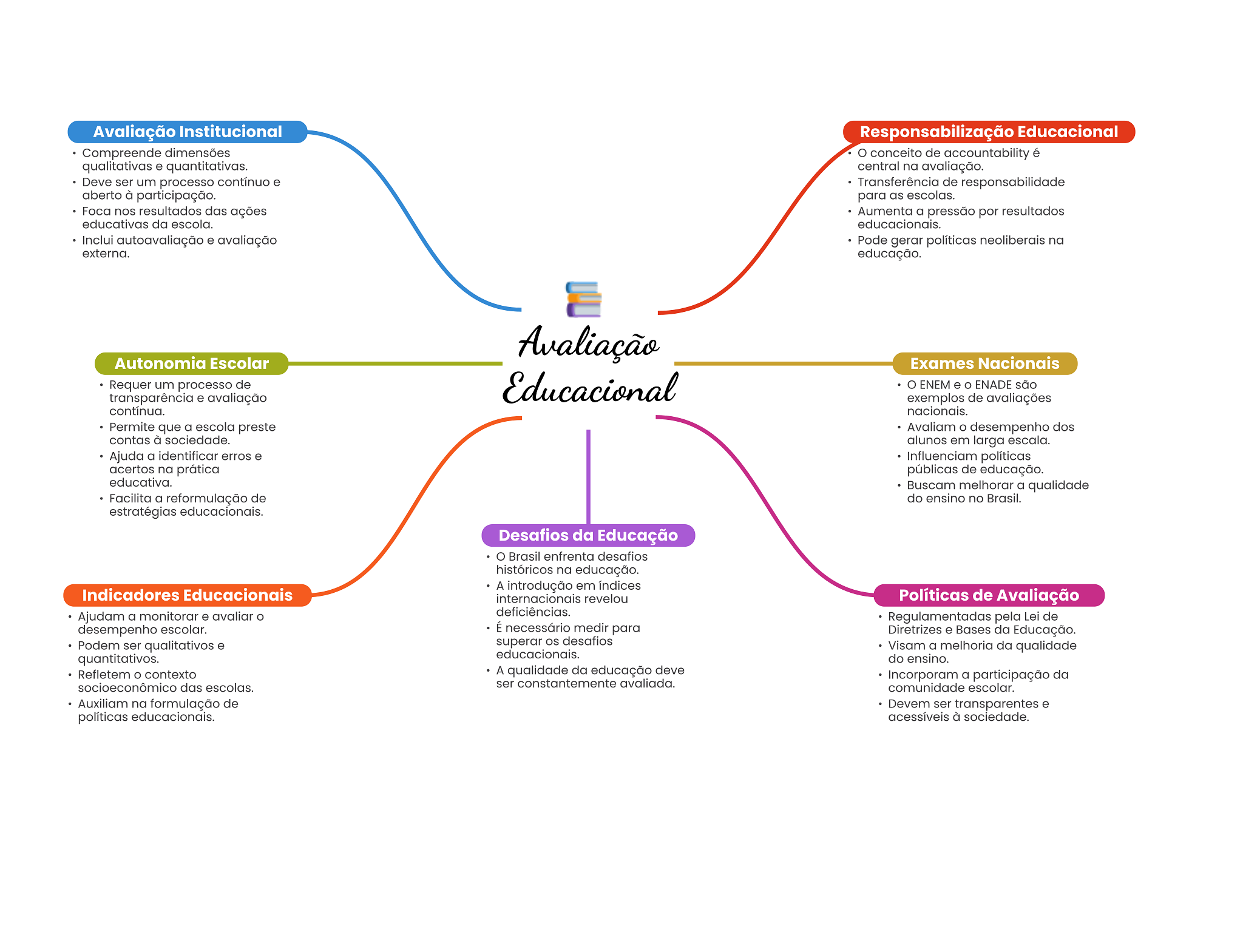 Avaliação Institucional Responsabilização Educacional Compreende dimensões O conceito de accountability é qualitativas e quantitativas. central na avaliação. Deve ser um processo contínuo e Transferência de responsabilidade aberto à participação. para as escolas. Foca nos resultados das ações Aumenta a pressão por resultados educativas da escola. educacionais. Inclui autoavaliação e avaliação Pode gerar políticas neoliberais na externa. educação. Avaliação Autonomia Escolar Exames Nacionais Requer um processo de Educacional O ENEM e ENADE são transparência e avaliação exemplos de avaliações contínua. nacionais. Permite que a escola preste Avaliam desempenho dos contas à sociedade. alunos em larga escala. Ajuda a identificar erros e Influenciam políticas acertos na prática públicas de educação. educativa. Buscam melhorar a qualidade Facilita a reformulação de do ensino no Brasil. estratégias educacionais. Desafios da Educação Brasil enfrenta desafios históricos na educação. A introdução em Indicadores Educacionais internacionais revelou Políticas de Avaliação Ajudam a monitorar e avaliar deficiências. Regulamentadas pela Lei de desempenho escolar. É necessário medir para Diretrizes e Bases da Educação. Podem ser qualitativos e superar desafios Visam a melhoria da qualidade quantitativos. educacionais. do ensino. Refletem contexto A qualidade da educação deve Incorporam a participação da socioeconômico das escolas. ser constantemente avaliada. comunidade escolar. Auxiliam na formulação de Devem ser transparentes e políticas educacionais. acessíveis à sociedade.