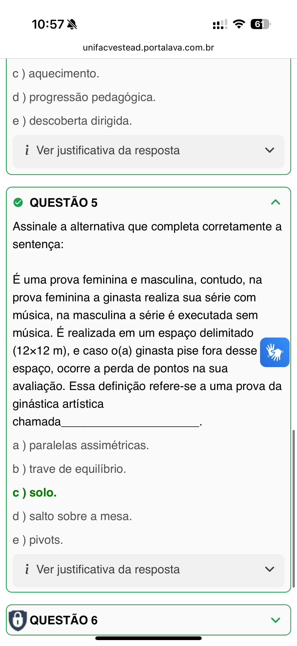 10:57 6 unifacvestead.portalava.com.br aquecimento. d) progressão pedagógica. e ) descoberta dirigida. i Ver justificativa da resposta QUESTÃO 5 Assinale a alternativa que completa corretamente a sentença: É uma prova feminina e masculina, contudo, na prova feminina a ginasta realiza sua série com música, na masculina a série é executada sem música. É realizada em um espaço delimitado (12x12 m), e caso o(a) ginasta pise fora desse espaço, ocorre a perda de pontos na sua avaliação. Essa definição refere-se a uma prova da ginástica artística chamada a ) paralelas assimétricas. b) trave de equilíbrio. c ) solo. d) salto sobre a mesa. e ) pivots. i Ver justificativa da resposta QUESTÃO 6