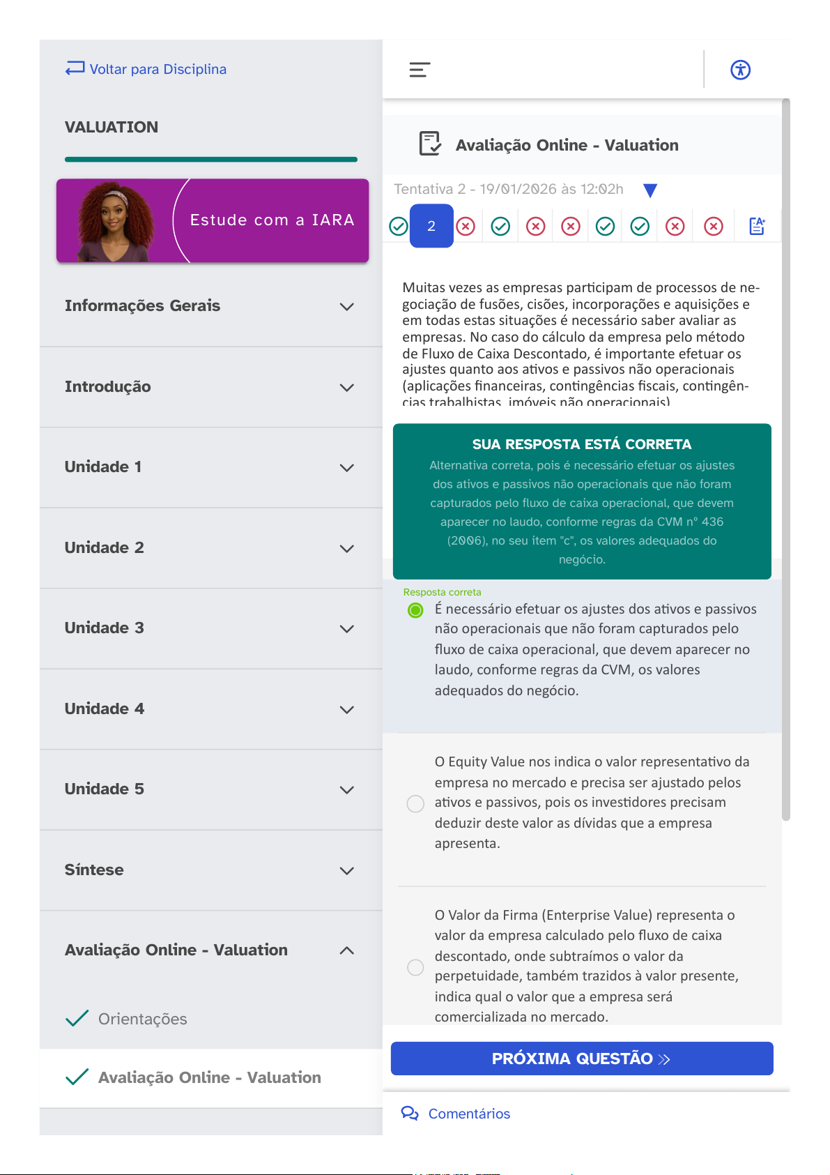 Avaliação Online - Valuation Muitas vezes as empresas participam de processos de ne- gociação de fusões, cisões, incorporações e aquisições e em todas estas situações é necessário saber avaliar as empresas. No caso do cálculo da empresa pelo método de Fluxo de Caixa Descontado, é importante efetuar os ajustes quanto aos ativos e passivos não operacionais (aplicações financeiras, contingências fiscais, contingên- cias trabalhistas imóveis não operacionais) SUA RESPOSTA ESTÁ CORRETA Alternativa correta, pois é necessário efetuar os ajustes dos ativos e passivos não operacionais que não foram capturados pelo fluxo de caixa operacional, que devem aparecer no laudo, conforme regras da CVM nº 436 (2006), no seu item "c", os valores adequados do negócio. É necessário efetuar os ajustes dos ativos e passivos não operacionais que não foram capturados pelo fluxo de caixa operacional, que devem aparecer no laudo, conforme regras da CVM, os valores adequados do negócio. Resposta correta O Equity Value nos indica o valor representativo da empresa no mercado e precisa ser ajustado pelos ativos e passivos, pois os investidores precisam deduzir deste valor as dívidas que a empresa apresenta. O Valor da Firma (Enterprise Value) representa o valor da empresa calculado pelo fluxo de caixa descontado, onde subtraímos o valor da perpetuidade, também trazidos à valor presente, indica qual o valor que a empresa será comercializada no mercado. Os ativos e passivos não operacionais na avaliação PRÓXIMA QUESTÃO ▼Tentativa 2 - 19/01/2026 às 12:02h 2 Comentários Voltar para Disciplina VALUATION Informações Gerais Introdução Unidade 1 Unidade 2 Unidade 3 Unidade 4 Unidade 5 Síntese Avaliação Online - Valuation Orientações Avaliação Online - Valuation Estude com a IARA 19/01/2026, 12:07 UNA DL https://student.ulife.com.br/ContentPlayer/Index?cd=8rRke%2fvMVu%2bvmjn83v5z3w%3d%3d&l=tNkKATnX96MB7WDezidQow%3d%3d&lc=9q… 1/1 https://student.ulife.com.br/Lesson/Index?cd=8rRke%2fvMVu%2bvmjn83v5z3w%3d%3d#pageIndex=1 https://student.ulife.com.br/ContentPlayer/Index?lc=9qJMJ6plgBJ1868iwygNcw%3d%3d&l=tNkKATnX96MB7WDezidQow%3d%3d&cd=8rRke%2fvMVu%2bvmjn83v5z3w%3d%3d&sl=wBN1%2fT2TpWK0fd%2f51VNIwQ%3d%3d&st=hulgLEiZ38R93fB27BzbHQ%3d%3d&oi=G%2bHs%2f%2f1fI8Fh5W6%2faeOVww%3d%3d