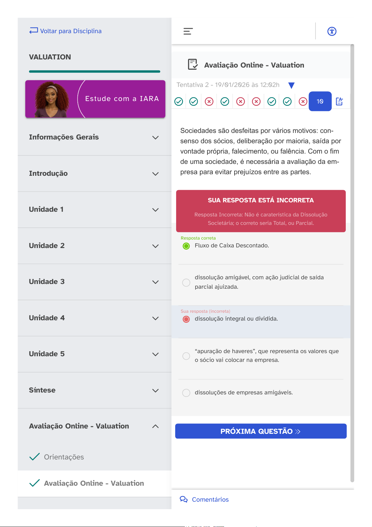 Avaliação Online - Valuation Sociedades são desfeitas por vários motivos: con- senso dos sócios, deliberação por maioria, saída por vontade própria, falecimento, ou falência. Com o fim de uma sociedade, é necessária a avaliação da em- presa para evitar prejuízos entre as partes. SUA RESPOSTA ESTÁ INCORRETA Resposta Incorreta: Não é caraterística da Dissolução Societária; o correto seria Total, ou Parcial. Fluxo de Caixa Descontado. Resposta correta dissolução amigável, com ação judicial de saída parcial ajuizada. dissolução integral ou dividida. Sua resposta (incorreta) “apuração de haveres”, que representa os valores que o sócio vai colocar na empresa. dissoluções de empresas amigáveis. PRÓXIMA QUESTÃO ▼Tentativa 2 - 19/01/2026 às 12:02h 10 Comentários Voltar para Disciplina VALUATION Informações Gerais Introdução Unidade 1 Unidade 2 Unidade 3 Unidade 4 Unidade 5 Síntese Avaliação Online - Valuation Orientações Avaliação Online - Valuation Estude com a IARA 19/01/2026, 12:12 UNA DL https://student.ulife.com.br/ContentPlayer/Index?cd=8rRke%2fvMVu%2bvmjn83v5z3w%3d%3d&l=tNkKATnX96MB7WDezidQow%3d%3d&lc=9q… 1/1 https://student.ulife.com.br/Lesson/Index?cd=8rRke%2fvMVu%2bvmjn83v5z3w%3d%3d#pageIndex=1 https://student.ulife.com.br/ContentPlayer/Index?lc=9qJMJ6plgBJ1868iwygNcw%3d%3d&l=tNkKATnX96MB7WDezidQow%3d%3d&cd=8rRke%2fvMVu%2bvmjn83v5z3w%3d%3d&sl=wBN1%2fT2TpWK0fd%2f51VNIwQ%3d%3d&st=hulgLEiZ38R93fB27BzbHQ%3d%3d&oi=G%2bHs%2f%2f1fI8Fh5W6%2faeOVww%3d%3d