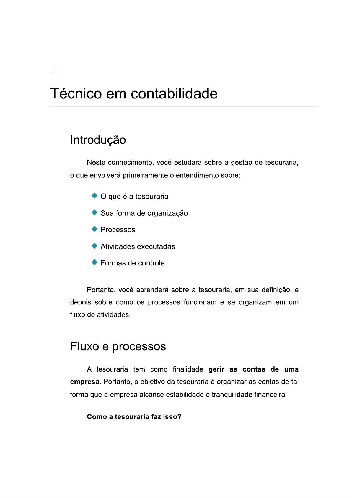 Técnico em contabilidade Introdução Neste conhecimento, você estudará sobre a gestão de tesouraria, que envolverá primeiramente entendimento sobre: que é a tesouraria Sua forma de organização Processos Atividades executadas Formas de controle Portanto, você aprenderá sobre a tesouraria, em sua definição, e depois sobre como os processos funcionam e se organizam em um fluxo de atividades. Fluxo e processos A tesouraria tem como finalidade gerir as contas de uma empresa. Portanto, o objetivo da tesouraria é organizar as contas de tal forma que a empresa alcance estabilidade e tranquilidade financeira. Como a tesouraria faz isso?Tudo começa pela boa organização das contas, que acaba proporcionando folga financeira em caixa/conta bancária ou, em outras palavras, um bom capital de giro nos negócios. Resumidamente, isso significa que o objetivo da tesouraria é assegurar que os recursos financeiros da empresa serão suficientes para quitar suas obrigações com terceiros e ainda manter uma sobra de valor em caixa. Partindo desse princípio, de que objetivo da tesouraria é buscar sempre que ocorram mais entradas de dinheiro nas contas da empresa do que saídas, ao atingir esse objetivo, surge outra questão: que fazer com dinheiro que sobrar em conta? Sobre isso, a tesouraria tem como uma de suas responsabilidades pensar em formas de investir eficiente e eficazmente os recursos financeiros que sobrarem, a fim de gerar retorno para negócio. Portanto, de maneira geral, a tesouraria acaba por se responsabilizar por todo o dinheiro da empresa, o que envolve o controle e a gestão de entradas e saídas de dinheiro e a gestão de investimentos. Quando se fala em controle e em gestão de entradas e saídas de dinheiro, esses conceitos não se restringem apenas a pagar e receber valores, mas também envolvem ter ciência de quando devem ser realizadas tais ações e, principalmente, quando finalizar um determinado evento, já que isso pode interferir no fluxo de gestão financeira da empresa. Por exemplo, suponha que a empresa esteja pensando em contratar um empréstimo em uma instituição financeira. Nesse contexto, a tesouraria tem como responsabilidade controlar fluxo de quitação dessa dívida, isto é, dentro dos processos de controle estará aresponsabilidade de apurar em quanto tempo essa dívida será quitada, como funcionarão as taxas e os juros embutidos no empréstimo a ser realizado e como isso afetará saldo mínimo disponível em caixa atualmente e nos meses seguintes. Por isso, entre os processos que são de responsabilidade da tesouraria está avaliar propostas de recebimento e pagamentos, fazendo simulações de como essas propostas afetariam o fluxo financeiro da empresa, para então escolher a melhor opção (ou, em alguns casos, nenhuma alternativa entre as apresentadas, quando estas representarem riscos para o negócio). Portanto, trabalho da tesouraria também envolve analisar os riscos de projetos a serem investidos, evitando que os pagamentos das contas fiquem em atraso ou não sejam efetuados por causa disso, ou que a conta bancária da empresa entre em saldo negativo, ou seja, fique "no vermelho", devido ao investimento desvantajoso realizado. Se a tesouraria atingir objetivo básico de quitar as dívidas da empresa a curto prazo, então estará cumprindo sua missão. Entretanto, não significa que não haverá também um controle de objetivos mais complexos, isto é, de dívidas nas quais os riscos sejam maiores e que serão quitadas a longo prazo. Por exemplo, a empresa pode ter objetivo a curto prazo de manter pagamento das dívidas em dia e ainda sobrar um saldo mínimo em caixa. O mesmo pode ser aplicado a longo prazo, em que a quitação das dívidas pode ser controlada em um período maior, esperando-se também atingir um saldo mínimo em conta bancária ao final desse prazo (um ano, por exemplo). Neste ponto de vista, para garantir que esses objetivos sejam alcançados a curto e a longo prazos, será necessário criar estratégias baseadas em um bom planejamento financeiro.Como fazer esse planejamento ou controle financeiro? Primeiramente, um bom planejamento financeiro será como um escudo para a tesouraria, o que permitirá que ela administre questões referentes à projeção de entradas e saídas de valores a curto e também a longo prazos. Para fazer essa projeção, uma ferramenta utilizada pela tesouraria é a projeção do fluxo de caixa. Essa projeção representará um panorama dos meses seguintes, demonstrando quanto dinheiro a empresa terá disponível em conta bancária ou no caixa da empresa. É bom lembrar que a projeção do fluxo de caixa, por ser uma previsão, trará apenas uma possibilidade de cenário que pode ou não se concretizar posteriormente, de acordo com a realidade financeira da empresa. Por isso, o fluxo de caixa trabalha sempre com a relação entre o fluxo projetado versus fluxo realizado, isto é, será feita, por exemplo, uma projeção de caixa para os próximos três meses e, depois disso, será confrontada essa previsão mês a mês com o realizado (quais movimentações financeiras efetivamente ocorreram). Essa projeção ajuda a manter um maior controle dos objetivos da tesouraria, portanto, é muito útil para a saúde financeira de um negócio. Nesse sentido, é por meio do planejamento financeiro que a tesouraria conseguirá mapear e simular as receitas (entradas de dinheiro) e as despesas (saídas de dinheiro) futuras, para então utilizá- las assertivamente. Suponha que, no cenário do fluxo de caixa projetado, as receitas tendem a diminuir, então, isso significa que o saldo mínimo em caixa deverá ser suficiente para manter a empresa enquanto a situação nãomelhora. Por isso é importante o planejamento financeiro, pois, ao perceber que as receitas podem diminuir, deve-se já começar a trabalhar em estratégias para a contenção de gastos e aumento do saldo mínimo em caixa da empresa. Essas 