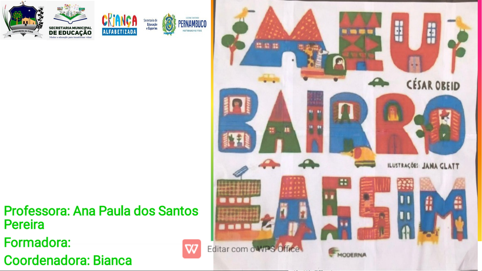 Prática de Alfabetização e Letramento 1°,2°e 3° ano Escola municipal Lasdislau Rodrigues dos Santos Professora: Ana Paula dos Santos Pereira Formadora: Coordenadora: Bianca Problematização: Visto a necessidade da maior ia dos estudantes em lei tura , compreensão,esc a coordenação motora, o t rabalho foi desenvolvido essa sequência pensando melhoria do processo de todos os estud 2 Objetivos: MAPEAR O BAIRRO: identif icar e localizar os principais pontos de referências, como ruas, praças, comércios, serviços e equipamentos p úb lic o s. OBSERVAR E ANALISAR A PAISAGEM URBANA:analisar as características físicas do bairro como arquitetura, os espaços verdes, infraestrutura, como esses elementos se relacionam na nossas vidas e observando o que tem no bairro da escola. ESTIMULAR A EXPRESSÃO CRIATIVA: promover atividades que permite aos alunos expressar o que a prenderam sobre o bairro de diferentes formas como desenho, textos, apresentações orais, dobraduras, corte e colagens, e a oralidade. 3 HABILIDADES DO CURRÍCULO DE PERNAMBUCO: Português Geografia Artes 4 EF 12L P02PE EF 12L P06PE EF 01L P17PE EF 01G E01PE EF 01G E08PE EF 15AR 04PE EF 15AR 11PE COMPONENTES CURRICULARES P or t uguê s: Leitura e interpretação de textos sobre o bairro, incluindo relatos de moradores, poesias e contos. Estudo do vocabulário relacionado ao bairro, como nomes de ruas, estabelecimentos e elementos da paisagem. Artes: Exploração de diferentes linguagens artísticas para representar o bairro, como desenho, pintura, colagem, fotografia e modelagem. Criação de releituras de obras de arte que retratem paisagens urbanas ou rurais. G e ografia: Análise das características físicas e humanas do bairro, como relevo, clima, vegetação, população e atividades econômicas. Comparação entre diferentes bairros e suas características, identif icando semelhanças e di fe r e nça s. Discussão sobre a importância do bairro na vida das pessoas e na organização da cidade. Além desses componentes, o tema "Meu bairro é assim" também pode ser explorado em outras áreas do conhecimento, como História, Matemática e Ciências, de acordo com os objetivos e a proposta pedagógica 5 PRÁTICAS DE ALFABETIZAÇÃO E LETRAMENTO Na prática das atividades em sala de aula, foi pensado e desenvolvido atividades que promoveram tanto a alfabetização quanto o letramento e o Conhecimento em campo. Isso refere -se à art icu lação entre as dimensões técnica de alfabetização, letramento e o Conhecimento isso, usado a interação social e cultural do aluno para alcançar o aprendizado de forma exitosa. 6 RECURSOS UTILIZADOS 7 Sequencia didática; Quadro branco; Cartolinas; Hidrocores; Tesourinhas e cola branca; Caderno do aluno; Caixa de som; TNT; �Camera / celular �Figuras de imagem que representa o bairro ; �Lápis coloridos �Folha de ofício �Atividades expressas � � � � � � � � LIVRO: MEU BAIRRO E ASSIM AUTOR : CÉSAR OBEID ILUSTRAÇÕES:JANA GLATT EVIDÊNCIAS 12 Exemplo de texto de rodapé 01/03/20XX 13 Exemplo de texto de rodapé 01/03/20XX 14 Exemplo de texto de rodapé 01/03/20XX 15 Exemplo de texto de rodapé 01/03/20XX 16 Exemplo de texto de rodapé 01/03/20XX 19 Exemplo de texto de rodapé 01/03/20XX 21 Exemplo de texto de rodapé 01/03/20XX 22 Referencial 23 A maneira de começar é parar de falar e começar afazer. WaltDisney 24 Obrigada!