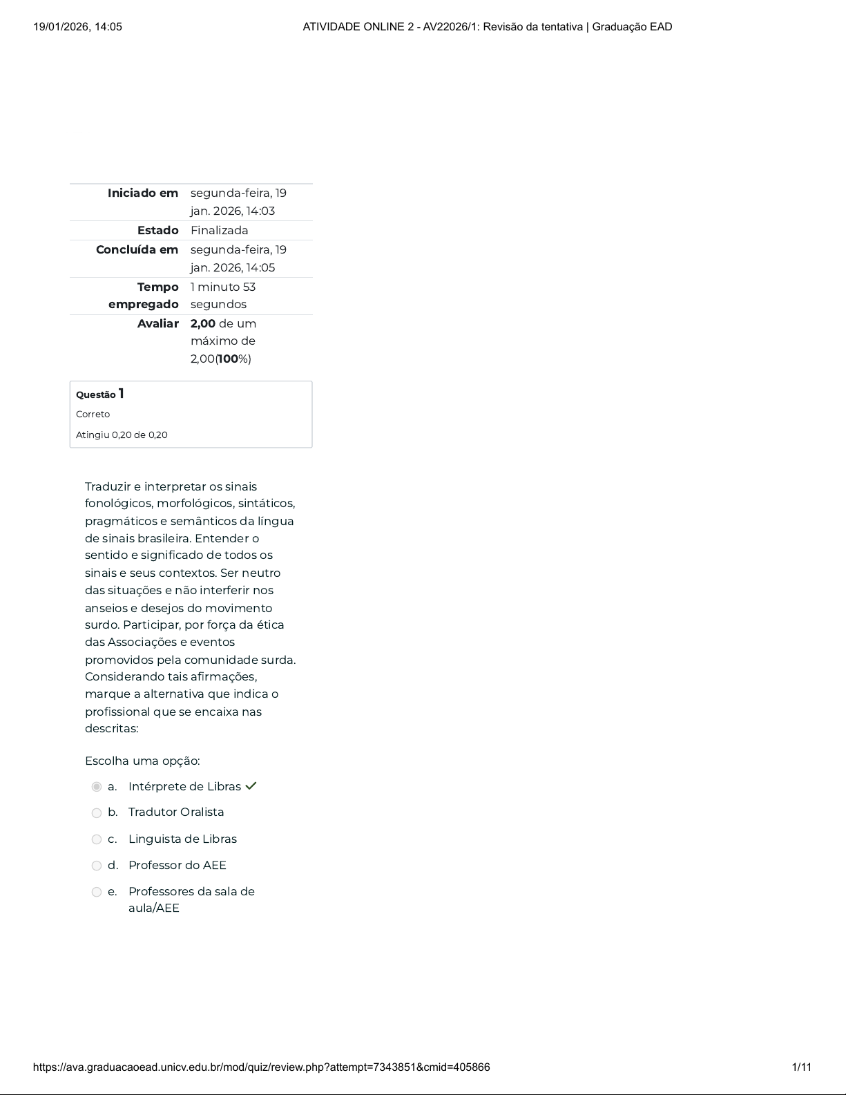 Iniciado em segunda-feira, 19 jan. 2026, 14:03 Estado Finalizada Concluída em segunda-feira, 19 jan. 2026, 14:05 Tempo empregado 1 minuto 53 segundos Avaliar 2,00 de um máximo de 2,00(100%) Questão 1 Correto Atingiu 0,20 de 0,20 Traduzir e interpretar os sinais fonológicos, morfológicos, sintáticos, pragmáticos e semânticos da língua de sinais brasileira. Entender o sentido e significado de todos os sinais e seus contextos. Ser neutro das situações e não interferir nos anseios e desejos do movimento surdo. Participar, por força da ética das Associações e eventos promovidos pela comunidade surda. Considerando tais afirmações, marque a alternativa que indica o profissional que se encaixa nas descritas: Escolha uma opção: a. Intérprete de Libras ✓ b. Tradutor Oralista c. Linguista de Libras d. Professor do AEE e. Professores da sala de aula/AEE 19/01/2026, 14:05 ATIVIDADE ONLINE 2 - AV22026/1: Revisão da tentativa | Graduação EAD https://ava.graduacaoead.unicv.edu.br/mod/quiz/review.php?attempt=7343851&cmid=405866 1/11 Questão 2 Correto Atingiu 0,20 de 0,20 Atualmente, as pesquisas apontam a existência de cinco componentes dos sinais, os chamados Parâmetros das LS. Considerando essa afirmativa, marque a opção que indica quais são os 5 parâmetros corretamente: Escolha uma opção: a. Comunicação Total; Bilinguismo; Gestos; Datilologia; Expressão Facial/Corporal. b. Datilologia; Sinais Rítmicos; Configuração de Mãos; Ponto de Articulação; Expressão Facial/Corporal. c. Configuração de Mãos; Oralismo, Comunicação Total; Movimento; Expressão Facial/Corporal. d. Configuração de Mãos; SignWriting; Arbitrariedade; Iconicidade e Variação Linguística. e. Configuração de Mãos; Ponto de Articulação; Movimento; Orientação da Mão; Expressão Facial/Corporal. ✓ 19/01/2026, 14:05 ATIVIDADE ONLINE 2 - AV22026/1: Revisão da tentativa | Graduação EAD https://ava.graduacaoead.unicv.edu.br/mod/quiz/review.php?attempt=7343851&cmid=405866 2/11 Questão 3 Correto Atingiu 0,20 de 0,20 O texto abaixo apresenta informações sobre a ética profissional do intérprete de Libras, leia e analise-o: Deve ser uma pessoa de __________ na sua interpretação e no sigilo – __________; Não deve deixar que a sua moral e religião interfiram na interpretação; Se ocorrer erros na interpretação, corrigi-los imediatamente; Ser __________ (Dominar a Língua Portuguesa e a LIBRAS); Ter histórico profissional de __________; Capacidade de admitir suas limitações quando não se sentir capaz; __________ durante a interpretação; Formação educacional; Conhecimentos da ética e da responsabilidade da profissão; Participante da Comunidade surda, sendo reconhecido por ela; Ser capaz de trabalhar em equipe e de __________ os outros intérpretes; Estudo __________ da Língua de Sinais. Escolha a alternativa cujos termos completam, correta e respectivamente, as lacunas do texto. Escolha uma opção: a. Confiança - fidelidade - bilíngue - confiabilidade - equilíbrio - apoiar - constante ✓ b. Confiabilidade - fidelidade - bilíngue - confiança - equilíbrio - apoiar - constante c. Fidelidade - bilíngue - confiança – equilíbrio - confiabilidade - apoiar - constante 19/01/2026, 14:05 ATIVIDADE ONLINE 2 - AV22026/1: Revisão da tentativa | Graduação EAD https://ava.graduacaoead.unicv.edu.br/mod/quiz/review.php?attempt=7343851&cmid=405866 3/11 Questão 4 Correto Atingiu 0,20 de 0,20 d. Confiança - fidelidade - apoiar - confiabilidade - equilíbrio - bilíngue - constante e. Bilíngue - confiança - fidelidade - apoiar - confiabilidade - equilíbrio - constante Na legislação brasileira, o conceito de surdez se fundamenta no número de decibéis que o ouvido humano percebe, a audiometria é um exame da audição realizado por meio de instrumentos de avaliação da capacidade para apreender os diferentes sons da fala e classificar a surdez nos diversos graus. De acordo com a percepção auditiva, identifica-se o grau da surdez, que passa a ser classificado em diversos graus. A esse respeito, avalie as afirmações a seguir e marque a opção correta: Escolha uma opção: a. Normal; Média; Profunda; Nula b. Fraca; Moderada; Alta; Imperceptível c. Leve; Média; Severa; Potente d. Baixa; Média; Alta; Extrema e. Leve; Moderada; Severa; Profunda ✓ 19/01/2026, 14:05 ATIVIDADE ONLINE 2 - AV22026/1: Revisão da tentativa | Graduação EAD https://ava.graduacaoead.unicv.edu.br/mod/quiz/review.php?attempt=7343851&cmid=405866 4/11 Questão 5 Correto Atingiu 0,20 de 0,20 Ao contrário do que muitos acreditam, a língua de sinais não é universal. Assim como as línguas orais, a variação linguística está presente também nas línguas de sinais. Cada país tem a sua, ou até mais de uma , língua de sinais. Considerando as informações disponibilizadas no seu material de estudo sobre a aquisição da língua de sinais, avalie as seguintes asserções e marque a opção correta: Escolha uma opção: a. Os surdos não adquirem a língua de modo inato, portanto, precisam do Oralismo para desenvolver a aprendizagem da Libras. b. Os surdos adquirem a língua de modo inato, portanto, independente do contato com outros surdos todos desenvolverão a língua de sinais com a mesma qualidade. c. Surdos oralizados aprendem com mais facilidade a língua de sinais, pois a língua oral serve de base para a língua orafacial. d. A maioria dos surdos têm familiares surdos e assim antes de entrar na escola já tiveram contato e aprenderam a língua de sinais. e. Assim como qualquer outra língua, a língua de sinais é adquirida em contato com outros usuários da língua, por isso é tão discutida a necessidade de existirem ✓ 19/01/2026, 14:05 ATIVIDADE ONLINE 2 - AV22026/1: Revisão da tentativa | Graduação EAD https://ava.graduacaoead.unicv.edu.br/mod/quiz/review.php?attempt=7343851&cmid=405866 5/11 escolas em que se reúnam vários surdos em uma mesma classe. 19/01/20