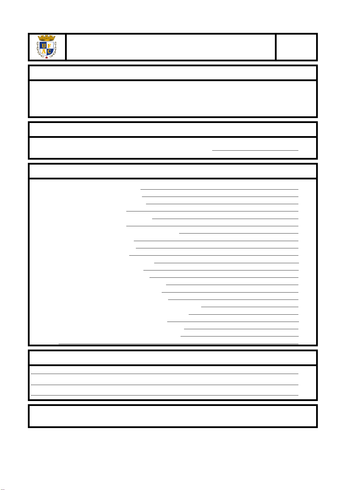 R E Q U E R I M E N T O N.º. REQUERENTE: NOME: _________________________________________________________________________________________ E-MAIL: ______________________________________________________________ FONE____________________ CURSO: ______________________________ PERÍODO: _______ MATRÍCULA:____________________________ REQUERIDO: NURCA COORDENAÇÃO DO CURSO OBJETO DO REQUERIMENTO: 01. Declaração de Escolaridade (NURCA) 02. Histórico Escolar – Original (NURCA) 03. Histórico Escolar – Fotocópia (NURCA) 04. Guia de Transferência (NURCA) 05. Certidão de Conclusão de Curso (NURCA) 06. Diplomas Registrados (NURCA) 07. Matrícula c/ portador de Diploma Superior (NURCA) 08. Atestado de Vaga (NURCA) 09. Transferência para UFAC (NURCA) 10. Transferência de Curso (NURCA) 11. Justificativas de Faltas (COORDENAÇÃO) 12. Revisão de Provas (COORDENAÇÃO) 13. Prova de 2ª chamada (COORDENAÇÃO) 14. Colação de Grau - Especial (COORDENAÇÃO) 15. Frequência em Disciplina (COORDENAÇÃO) 16. Cancelamento de Disciplina (COORDENAÇÃO) 17. Trancamento de Matrícula em Disciplina (COORDENAÇÃO) 18. Trancamento de Matrícula no Curso (COORDENAÇÃO) 19. Aproveitamento de Estudos (COORDENAÇÃO) 20. Programa de Disciplinas Cursadas (COORDENAÇÃO) 21. Oferecimento de Curso de Verão (COORDENAÇÃO) 22. Outros JUSTIFICATIVA: ________________________________________ DATA: / / . Assinatura do Requerente