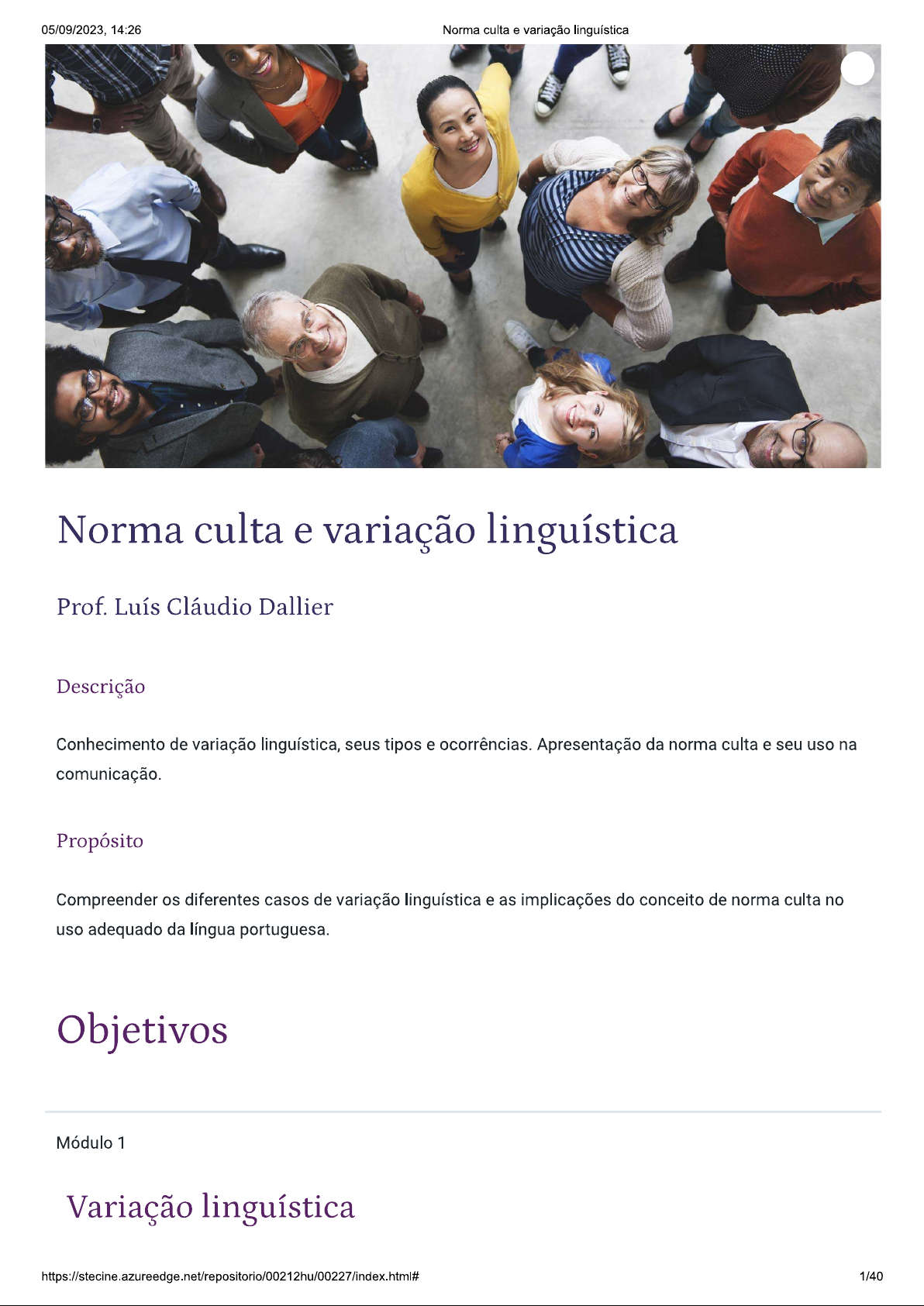 05/09/2023, 14:26 Norma culta e variação linguística Norma culta e variação linguística Prof. Luís Cláudio Dallier Descrição Conhecimento de variação linguística, seus tipos e ocorrências. Apresentação da norma culta e seu uso na comunicação. Propósito Compreender os diferentes casos de variação linguística e as implicações do conceito de norma culta no uso adequado da língua portuguesa. Objetivos Módulo 1 Variação linguística 1/4005/09/2023, 14:26 Norma culta e variação linguística Reconhecer diferentes tipos e manifestações da variação linguística no português. Módulo 2 que é a norma culta Identificar o conceito de norma culta e suas implicações no uso da língua portuguesa. Introdução Você já percebeu que a língua portuguesa apresenta variações em relação à pronúncia ou ao significado de algumas palavras dependendo da localidade do falante? Isso acontece porque a língua é algo vivo, dinâmico, e seu uso no dia a dia implica variações que estão relacionadas com a região, a profissão, o grau de escolaridade e outros fatores do usuário da língua. Reconhecer que a língua apresenta diversidades no seu uso é importante para identificarmos em que situações de comunicação uma variedade da língua é apropriada ou inadequada. Na verdade, precisamos conhecer a norma culta da língua para reconhecermos as diferentes manifestações das variações em relação a essa norma ou padrão. Por isso, vamos estudar alguns casos de variação linguística para depois compreendermos que é e como funciona a norma culta da língua. 2/4005/09/2023, 14:26 Norma culta e variação linguística 1 - Variação linguística Ao final deste módulo, você será capaz de reconhecer diferentes tipos e manifestações da variação linguística no português. Contextualizando Neste vídeo, professor Luís Cláudio Dallier faz uma breve contextualização do assunto. Confira! Para assistir a um vídeo sobre O assunto, acesse a versão online deste conteúdo. 3/4005/09/2023, 14:26 Norma culta e variação linguística Variação linguística: que é? A língua sofre variações ao longo do tempo, conforme espaço geográfico, a estrutura social e a situação ou o contexto de uso. Isso significa dizer que uma língua está sujeita a passar por modificações no tempo e no espaço fim de satisfazer às necessidades de expressão e de comunicação, individuais ou coletivas, de seus usuários. Isso é que se chama variação linguística. Podemos abordar a variação linguística sob diversas perspectivas. Se levarmos em conta uma situação de comunicação qualquer, teremos alguns elementos que vão apontar para variedades no uso da língua. Para quem Quando Como fala? Por que Quem fala? fala? fala? fala? Essas perguntas evidenciam que nossa fala pode variar de acordo com a situação ou com contexto, conforme o falante e as pessoas que ouvem (interlocutores), o assunto tratado ou a intenção da mensagem. Perceba que a variação linguística corresponde a diferentes ocorrências de uma mesma língua. Tipos de variações linguísticas Sem nos preocuparmos muito com classificações técnicas e exaustivas, próprias da Sociolinguística, podemos dizer que a variação linguística pode ser de, pelo menos, três tipos: ociolinguística Sociolinguística é uma área da Linguística que trata das relações entre linguagem e sociedade, estudando a função social da linguagem e a influência dos fatores sociais sobre a língua. 4/4005/09/2023, 14:26 Norma culta e variação linguística De registro Regional Social Abordaremos cada um desses tipos a seguir. Variação regional Variações da língua numa perspectiva geográfica, originando os regionalismos. Manifestam-se, principalmente, pelo sotaque e por palavras ou expressões utilizadas pelos falantes de determinada região. Um exemplo desse tipo de variação são os falares ou dialetos. Veja a diferença entre alguns falares no Brasil: Dialetos São variações faladas por comunidades geograficamente definidas. Também denominados "falares" por alguns linguistas. 5/4005/09/2023, 14:26 Norma culta e variação linguística Cearense Êta que esse curso é bem arretado! 6/4005/09/2023, 14:26 Norma culta e variação linguística Carioca Caraca! Esse curso é muito maneiro! 7/4005/09/2023, 14:26 Norma culta e variação linguística Mineiro Nossinhora! Esse curso é bom demais da conta, sô! 8/4005/09/2023, 14:26 Norma culta e variação linguística Gaúcho Bah, esse curso é tri! As diferentes designações no Brasil para um mesmo referente ou aspecto da realidade é outro exemplo de variação linguística na dimensão geográfica: macaxeira no Nordeste, mandioca em São Paulo e aipim no Rio de Janeiro correspondem à mesma raiz utilizada na culinária nacional. Rio de Janeiro X São Paulo professor Luís Cláudio Dallier explora mais essas diferenças entre as cidades do Rio de Janeiro e São Paulo. 9/4005/09/2023, 14:26 Norma culta e variação linguística Para assistir a um vídeo sobre assunto, acesse a versão online deste conteúdo. Não podemos afirmar que determinada região do país fala português mais correto". Tal afirmação é falsa, pois que há são variações da língua portuguesa. Exemplo A pronúncia do cearense ou do carioca, por exemplo, não é errada ou certa, mas, simplesmente, modo próprio de articular os sons numa determinada comunidade linguística. Sendo português uma língua falada por diversas nações, em diferentes continentes, é interessante lembrar que a língua também varia de um país para outro, tanto na fala quanto na escrita. Ainda que Novo Acordo Ortográfico da Língua Portuguesa procure padronizar a grafia das palavras, há alguns aspectos na escrita que são peculiares em Portugal e outros no Brasil. Variação de Registro Variações relacionadas com modalidades expressivas adotadas por um mesmo falante ou segmento social em função do contexto, do