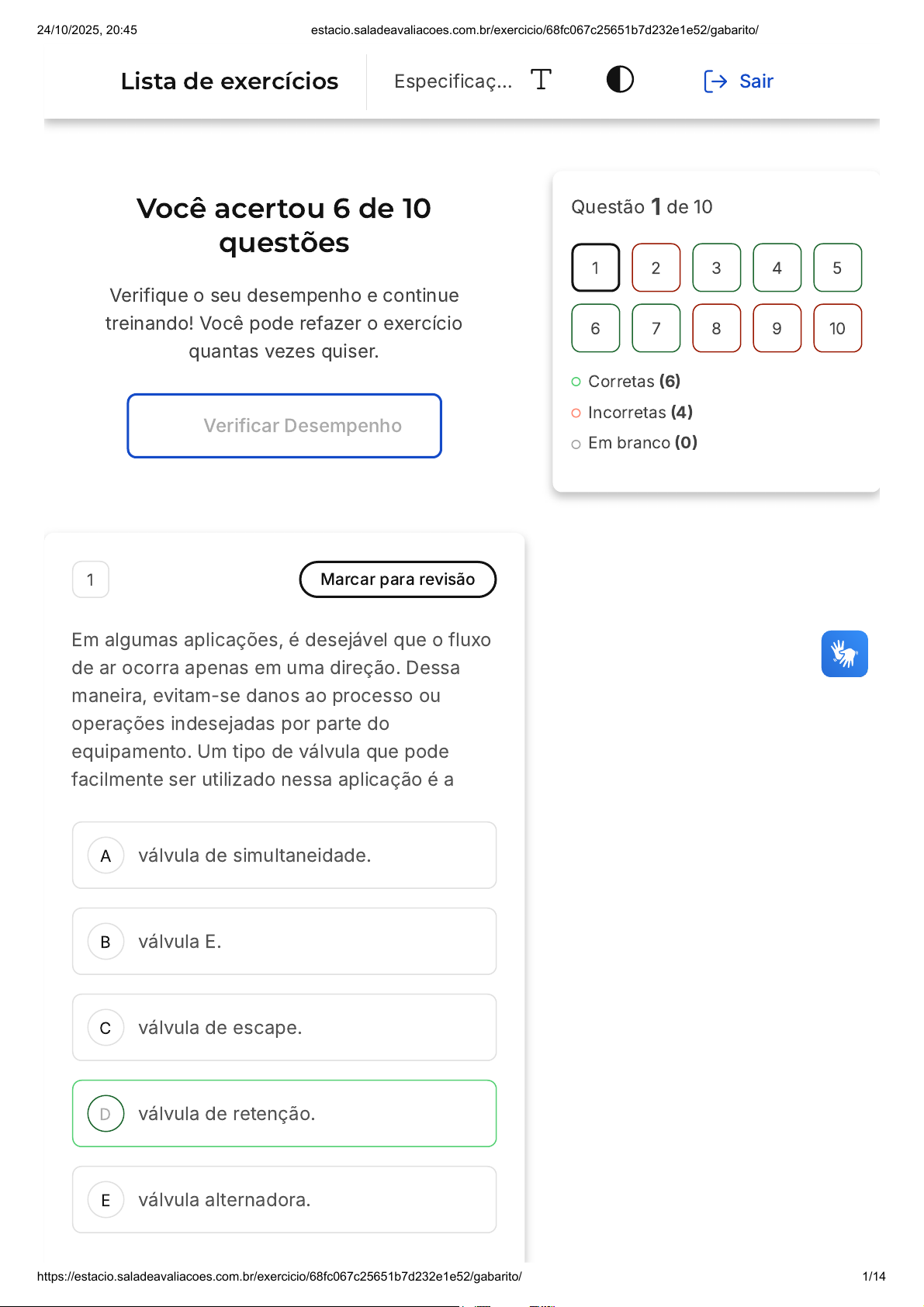 Você acertou 6 de 10 questões Verifique o seu desempenho e continue treinando! Você pode refazer o exercício quantas vezes quiser. Verificar Desempenho A B C D E 1 Marcar para revisão Em algumas aplicações, é desejável que o fluxo de ar ocorra apenas em uma direção. Dessa maneira, evitam-se danos ao processo ou operações indesejadas por parte do equipamento. Um tipo de válvula que pode facilmente ser utilizado nessa aplicação é a válvula de simultaneidade. válvula E. válvula de escape. válvula de retenção. válvula alternadora. Questão 1 de 10 Corretas (6) Incorretas (4) Em branco (0) 1 2 3 4 5 6 7 8 9 10 Lista de exercícios Especificaç… Sair 24/10/2025, 20:45 estacio.saladeavaliacoes.com.br/exercicio/68fc067c25651b7d232e1e52/gabarito/ https://estacio.saladeavaliacoes.com.br/exercicio/68fc067c25651b7d232e1e52/gabarito/ 1/14 A B Resposta correta Parabéns, você selecionou a alternativa correta. Confira o gabarito comentado! Gabarito Comentado A válvula de retenção é a resposta correta. Essa válvula é projetada especificamente para permitir o fluxo de ar em uma única direção, bloqueando completamente o fluxo no sentido oposto. Isso é útil em várias aplicações onde é necessário garantir que o ar flua em uma direção específica para evitar danos ao processo ou operações indesejadas por parte do equipamento. Portanto, a válvula de retenção é a escolha ideal para essas situações. 2 Marcar para revisão A figura apresenta uma válvula direcional bastante empregada em sistemas pneumáticos na operação de cilindros de dupla ação. Observando a figura abaixo, é seguro afirmar que cada linha de fluxo apresenta 1 via. 2 vias. 24/10/2025, 20:45 estacio.saladeavaliacoes.com.br/exercicio/68fc067c25651b7d232e1e52/gabarito/ https://estacio.saladeavaliacoes.com.br/exercicio/68fc067c25651b7d232e1e52/gabarito/ 2/14 C D E 5 vias. 10 vias. 4 vias. Resposta incorreta Opa! A alternativa correta é a letra B. Confira o gabarito comentado! Gabarito Comentado Gabarito: 2 vias. Justificativas: Independentemente do número de vias da válvula, cada linha de fluxo apresenta obrigatoriamente 2 vias. 3 Marcar para revisão A utilização de sistemas redundantes é bastante importante e difundida nos sistemas industriais. Nesses sistemas, determinada ação de um operador precisa de confirmação (redundância de comando) por parte de um supervisor ou gerente para ser executada. Um tipo de válvula em que a passagem do ar só é permitida com acionamentos nas suas duas entradas é a 24/10/2025, 20:45 estacio.saladeavaliacoes.com.br/exercicio/68fc067c25651b7d232e1e52/gabarito/ https://estacio.saladeavaliacoes.com.br/exercicio/68fc067c25651b7d232e1e52/gabarito/ 3/14 A B C D E válvula alternadora. válvula de escape. válvula de simultaneidade. válvula de retenção. válvula OU. Resposta correta Parabéns, você selecionou a alternativa correta. Confira o gabarito comentado! Gabarito Comentado A válvula de simultaneidade, também conhecida como válvula E, é a correta. Este tipo de válvula é caracterizado por permitir a passagem do ar somente quando ambas as suas entradas são acionadas simultaneamente. Isso significa que, para que a ação seja executada, é necessário que haja uma confirmação ou redundância de comando, como mencionado no enunciado. Essa característica é fundamental em sistemas industriais, onde ações precisam ser confirmadas por um supervisor ou gerente para garantir a segurança e a eficiência do processo. 24/10/2025, 20:45 estacio.saladeavaliacoes.com.br/exercicio/68fc067c25651b7d232e1e52/gabarito/ https://estacio.saladeavaliacoes.com.br/exercicio/68fc067c25651b7d232e1e52/gabarito/ 4/14 A B C D E 4 Marcar para revisão A válvula direcional abaixo apresenta várias aplicações em circuitos pneumáticos. Ela opera com um comando manual e uma chave mecânica. É seguro afirmar que ela apresenta 2 vias e 2 posições. 3 vias e 4 posições. 4 vias e 2 posições. 8 vias de 2 posições. 2 vias e 4 posições. Resposta correta Parabéns, você selecionou a alternativa correta. Confira o gabarito comentado! Gabarito Comentado Gabarito: 4 vias e 2 posições. Justificativas: Como o quadrado maior é subdividido em dois quadrados menores, a válvula apresenta 2 posições. As duas linhas de fluxo indicam que ela possui 4 vias, tendo 24/10/2025, 20:45 estacio.saladeavaliacoes.com.br/exercicio/68fc067c25651b7d232e1e52/gabarito/ https://estacio.saladeavaliacoes.com.br/exercicio/68fc067c25651b7d232e1e52/gabarito/ 5/14 A B C D E em vista que cada linha de fluxo possui 2 vias. 5 Marcar para revisão No funcionamento dos compressores, as etapas de refrigeração são consideradas fundamentais, não apenas para o funcionamento adequado do compressor, mas para a manutenção do rendimento e preservação das estruturas. Entre os objetivos da etapa de resfriamento, não se enquadra Aumento da umidade do ar. Manutenção da temperatura das válvulas. Aproximar o processo da condição isotérmica. Evitar deformações estruturais. Aumentar a eficiência do compressor. Resposta correta Parabéns, você selecionou a alternativa correta. Confira o gabarito comentado! Gabarito Comentado O aumento da umidade do ar não é um objetivo da etapa de resfriamento em 24/10/2025, 20:45 estacio.saladeavaliacoes.com.br/exercicio/68fc067c25651b7d232e1e52/gabarito/ https://estacio.saladeavaliacoes.com.br/exercicio/68fc067c25651b7d232e1e52/gabarito/ 6/14 compressores. Na verdade, a condensação que ocorre durante o resfriamento auxilia na remoção das partículas de água em suspensão, o que significa que o processo de resfriamento busca reduzir, e não aumentar, a umidade do ar. As outras alternativas são objetivos da etapa de resfriamento. A manutenção da temperatura das válvulas é alcançada através da remoção do calor produzido pela compressão. O resfriamento também ajuda a aproximar o processo da condição isotérmica, que são as condições 