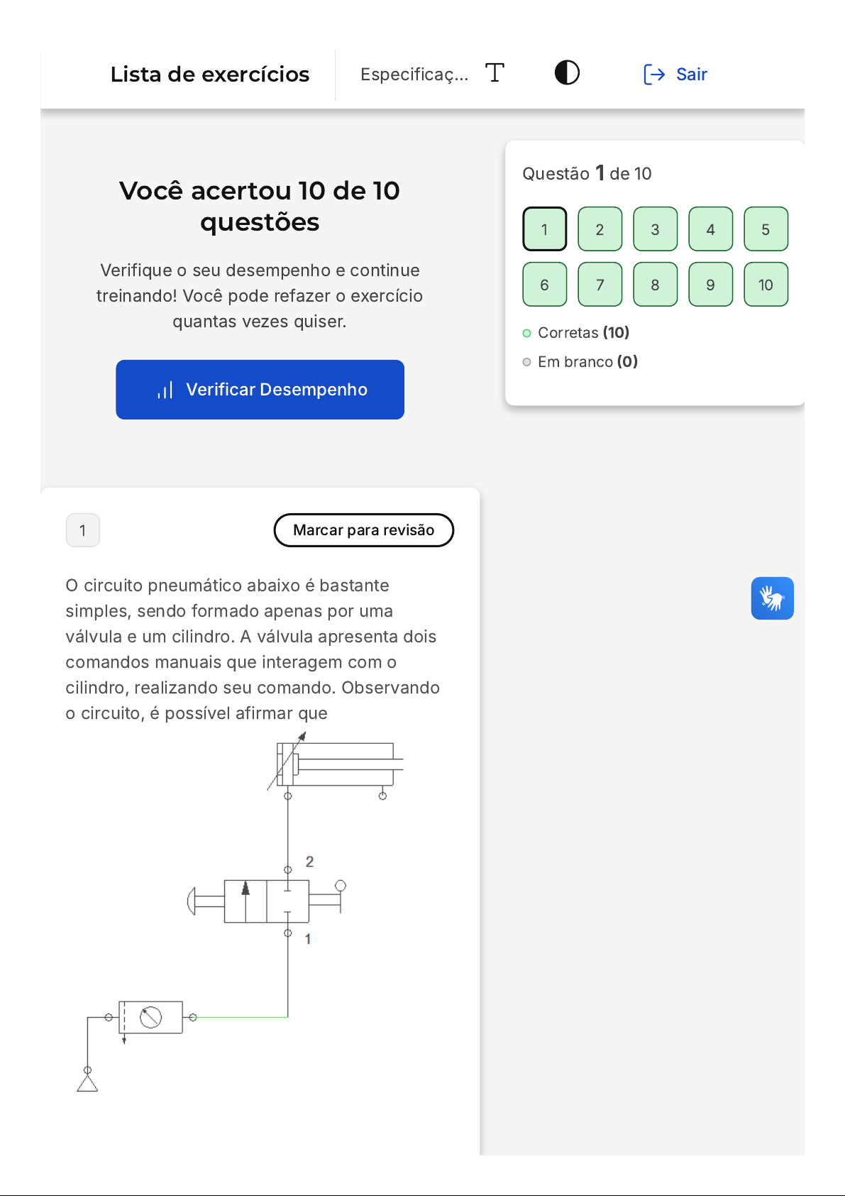 Você acertou 10 de 10 questões Verifique o seu desempenho e continue treinando! Você pode refazer o exercício quantas vezes quiser. Verificar Desempenho 1 Marcar para revisão O circuito pneumático abaixo é bastante simples, sendo formado apenas por uma válvula e um cilindro. A válvula apresenta dois comandos manuais que interagem com o cilindro, realizando seu comando. Observando o circuito, é possível afirmar que Questão 1 de 10 Corretas (10) Em branco (0) 1 2 3 4 5 6 7 8 9 10 Lista de exercícios Especificaç… Sair A B C D E o cilindro avançará com o acionamento da alavanca. o cilindro recuará com o acionamento da alavanca. o cilindro avançará com o acionamento do botão. o cilindro recuará com o acionamento do botão. o cilindro recuará com o acionamento simultâneo da alavanca e do botão. Resposta correta Parabéns, você selecionou a alternativa correta. Confira o gabarito comentado! Gabarito Comentado Gabarito: o cilindro avançará com o acionamento do botão. Justificativas: O circuito apresenta uma válvula com 2 posições e 2 vias. O botão é responsável pela passagem do fluxo de ar através da válvula e pelo avanço do cilindro. Entretanto, vale destacar que a via de recuo do cilindro está aberta, sendo impossível seu recuo através do sistema pneumático. A B C D E 2 Marcar para revisão A válvula direcional abaixo apresenta várias aplicações em circuitos pneumáticos. Ela opera com um comando manual e uma chave mecânica. É seguro afirmar que ela apresenta 2 vias e 2 posições. 3 vias e 4 posições. 4 vias e 2 posições. 8 vias de 2 posições. 2 vias e 4 posições. Resposta correta Parabéns, você selecionou a alternativa correta. Confira o gabarito comentado! Gabarito Comentado Gabarito: 4 vias e 2 posições. Justificativas: Como o quadrado maior é subdividido em dois quadrados menores, a válvula apresenta 2 posições. As duas linhas de fluxo indicam que ela possui 4 vias, tendo A B C D E em vista que cada linha de fluxo possui 2 vias. 3 Marcar para revisão Em algumas aplicações, é desejável que o fluxo de ar ocorra apenas em uma direção. Dessa maneira, evitam-se danos ao processo ou operações indesejadas por parte do equipamento. Um tipo de válvula que pode facilmente ser utilizado nessa aplicação é a válvula de simultaneidade. válvula E. válvula de escape. válvula de retenção. válvula alternadora. Resposta correta Parabéns, você selecionou a alternativa correta. Confira o gabarito comentado! Gabarito Comentado A válvula de retenção é a resposta correta. Essa válvula é projetada especificamente para permitir o fluxo de ar em uma única direção, bloqueando completamente o A B C D E fluxo no sentido oposto. Isso é útil em várias aplicações onde é necessário garantir que o ar flua em uma direção específica para evitar danos ao processo ou operações indesejadas por parte do equipamento. Portanto, a válvula de retenção é a escolha ideal para essas situações. 4 Marcar para revisão No funcionamento dos compressores, as etapas de refrigeração são consideradas fundamentais, não apenas para o funcionamento adequado do compressor, mas para a manutenção do rendimento e preservação das estruturas. Entre os objetivos da etapa de resfriamento, não se enquadra Aumento da umidade do ar. Manutenção da temperatura das válvulas. Aproximar o processo da condição isotérmica. Evitar deformações estruturais. Aumentar a eficiência do compressor. Resposta correta Parabéns, você selecionou a alternativa correta. Confira o gabarito comentado! Gabarito Comentado O aumento da umidade do ar não é um objetivo da etapa de resfriamento em compressores. Na verdade, a condensação que ocorre durante o resfriamento auxilia na remoção das partículas de água em suspensão, o que significa que o processo de resfriamento busca reduzir, e não aumentar, a umidade do ar. As outras alternativas são objetivos da etapa de resfriamento. A manutenção da temperatura das válvulas é alcançada através da remoção do calor produzido pela compressão. O resfriamento também ajuda a aproximar o processo da condição isotérmica, que são as condições ideais para o funcionamento do compressor. Além disso, o resfriamento evita o aquecimento e, consequentemente, a dilatação da tubulação, prevenindo deformações estruturais. Por fim, o resfriamento ajuda a aumentar a eficiência do compressor, reduzindo a expansão do ar comprimido. 5 Marcar para revisão De acordo com o circuito abaixo, é possível afirmar que, em caso de falha no sistema de ar comprimido e ausência do ar na entrada da válvula, o cilindro A B C D E permanecerá na última posição comandada. irá avançar. irá recuar. ficará em uma posição intermediária. permanecerá avançando e recuando para que o processo não seja interrompido. Resposta correta Parabéns, você selecionou a alternativa correta. Confira o gabarito comentado! Gabarito Comentado Gabarito: A B C D E permanecerá na última posição comandada. Justificativas: Na ausência de ar comprimido, exceto nos casos em que o cilindro possui uma mola, ele permanecerá na última posição comandada até que o ar seja restabelecido. 6 Marcar para revisão Entre os meios de energia mais comuns utilizados nos processos industriais, existe um que pode ser facilmente distribuído, convertido e é amplamente utilizado no meio industrial na energização de motores e equipamentos. Esse meio de energia é o(a) Mecânica. Hidráulica. Pneumática. Vapor. Eletricidade. Resposta correta Parabéns, você selecionou a alternativa correta. Confira o gabarito comentado! Gabarito Comentado A alternativa correta é a eletricidade. Ela é um meio de energia facilmente distribuído e convertido, sendo amplamente utilizada na indústria para energizar motores e equipamentos. A eletricidade pode ser convertida em outras formas de energia com certa facilidade, o que a torna uma opção 