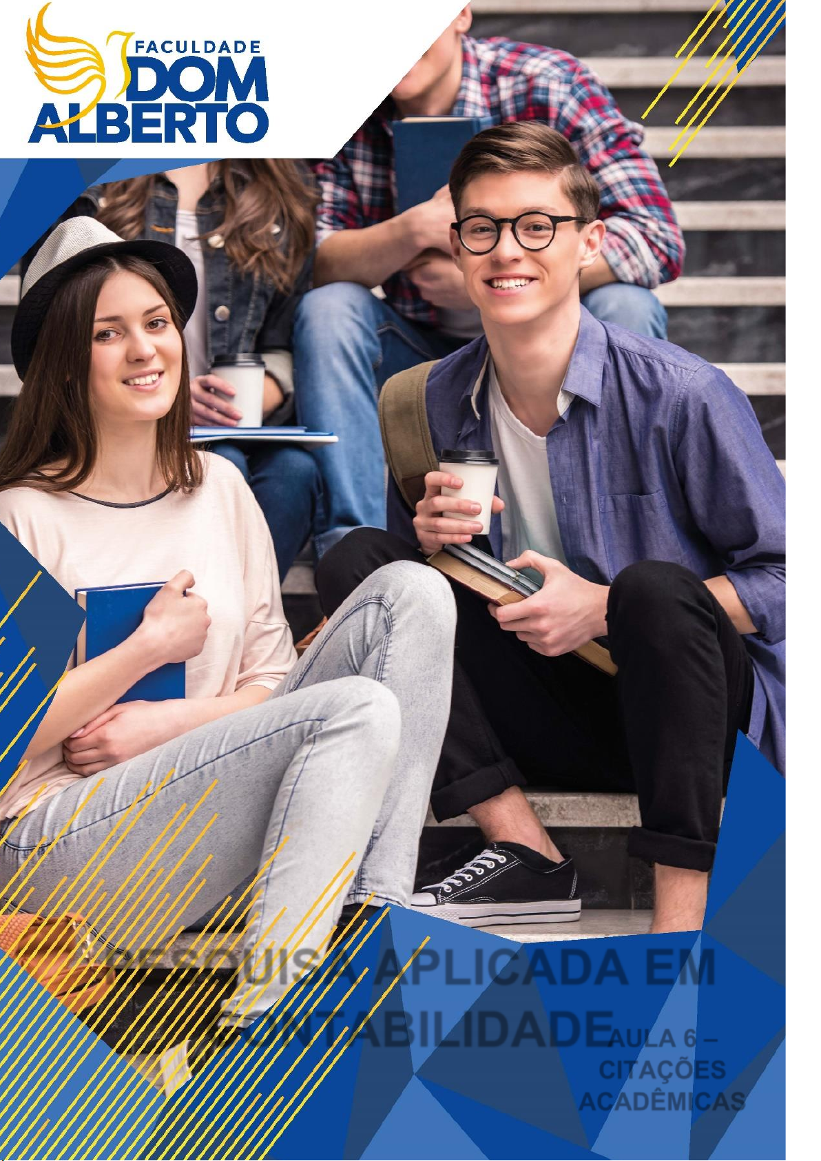 PESQUISA APLICADA EM CONTABILIDADE AULA 6 – CITAÇÕES ACADÊMICAS Enquanto aluno-pesquisador, você deverá proceder a uma cuidadosa pesquisa bibliográfica para fundamentar suas ideias para elaborar qualquer um trabalho de cunho acadêmico. Neste caminho, será inevitável citar os autores lidos. Todavia, deve-se fazê-lo com muita cautela. O conteúdo deverá apresentar início, meio e fim, ou seja, deve ser coerente, seguir a ordem das razões. As citações são ideias, termos, concepções, trechos transcritos ou reescritos e que foram retirados das obras estudadas. A finalidade é a de fortalecer o argumento do graduando. Em qualquer hipótese, é obrigatório informar a referência. Segundo a ABNT, citação é a “menção a uma informação extraída de outra fonte” (NBR 10520:2002). Assim, temos três tipos de citações que podem estar nos trabalhos acadêmicos: a citação direta, a citação indireta e a citação de citação. Nesta aula, abordaremos cada uma dessas citações nas diversas partes do conteúdo. Bons estudos! 6 CITAÇÕES São menções de uma informação extraída de outra fonte. São apresentadas conforme a ABNT NBR 10520 (2002), podendo aparecer no texto e em notas de rodapé. Outras características das citações são: ▪ Citação de citação: Citação direta ou indireta de um texto em que não se teve acesso ao original. ▪ Citação direta: Transcrição textual de parte da obra do autor consultado. ▪ Citação indireta: Texto baseado na obra do autor consultado. ▪ Notas de referência: Notas que indicam fontes consultadas ou remetem a outras partes da obra onde o assunto foi abordado. ▪ Notas de rodapé: Indicações, observações ou aditamentos ao texto feitos pelo autor, tradutor ou editor, podendo também aparecer na margem esquerda ou direita da mancha gráfica. ▪ Notas explicativas: Notas usadas para comentários, esclarecimentos ou explanações, que não possam ser incluídos no texto. ▪ Nas citações, as chamadas pelo sobrenome do autor, pela instituição responsável ou título incluído na sentença devem ser em letras maiúsculas e minúsculas e, quando estiverem entre parênteses, devem ser em letras maiúsculas. Exemplos: A ironia seria assim uma forma implícita de heterogeneidade mostrada, conforme a classificação proposta por Authier-Reiriz (1982). “Apesar das aparências, a desconstrução do logocentrismo não é uma psicanálise da filosofia [...]” (DERRIDA, 1967, p. 293). 6.1 Citação direta Especificar no texto a(s) página(s), volume(s), tomo(s) ou seção(ões) da fonte consultada, nas citações diretas. Este(s) deve(m) seguir a data, separado(s) por vírgula e precedido(s) pelo termo, que o(s) caracteriza, de forma abreviada. Nas citações indiretas, a indicação da(s) página(s) consultada(s) é opcional. Exemplos: A produção de lítio começa em Searles Lake, Califórnia, em 1928 (MUMFORD, 1949, p. 513). Oliveira e Leonardos (1943, p. 146) dizem que a "[...] relação da série São Roque com os granitos porfiróides pequenos é muito clara." Meyer parte de uma passagem da crônica de “14 de maio”, de A Semana: “Houve sol, e grande sol, naquele domingo de 1888, em que o Senado votou a lei, que a regente sancionou [...] (ASSIS, 1994, v. 3, p. 583). 6.1.1 Citações diretas de até três linhas Ao utilizar um trecho copiado de uma obra, com até 3 linhas, deve-se incluí-la no corpo do texto e entre aspas duplas (as aspas simples são utilizadas para indicar citação no interior da citação). Caso seja a parte de uma frase original, inicie com […]. Exemplos: Segundo Sá (1995, p. 27): “[...] por meio da mesma ‘arte de conversação’ que abrange tão extensa e significativa parte da nossa existência cotidiana [...]” De acordo com Gomes (2011), “o ato de contar histórias pode ser considerado uma boa estratégia para conquistar a atenção dos públicos de interesse” (p.75). Quando o nome do autor não é mencionado no texto, o mesmo deve constar dentro de parênteses em caixa alta, antes do ano e da página: “O texto publicitário, como mensagem escrita, exige raciocínio e criatividade na sua elaboração”. (MARTINS,1996, p.38). 6.1.2 Citações diretas com mais de três linhas Devem ser destacadas com recuo de 4 cm da margem esquerda, com letra menor que a do texto utilizado e sem as aspas. No caso de documentos datilografados, deve-se observar apenas o recuo. (Figura 1). Figura 1 – Citações diretas com mais de três linhas Fonte: projetoacademico.com.br Devem ser indicadas as supressões, interpolações, comentários, ênfase ou destaques, do seguinte modo: a) Supressões: [...] b) Interpolações, acréscimos ou comentários: [...] c) Ênfase ou destaque: grifo ou negrito ou itálico. Quando se tratar de dados obtidos por informação verbal (palestras, debates, comunicações etc.), indicar, entre parênteses, a expressão informação verbal, mencionando-se os dados disponíveis, em nota de rodapé. Para enfatizar trechos da citação, deve-se destacá-los indicando esta alteração com a expressão grifo nosso entre parênteses, após a chamada da citação, ou grifo do autor, caso o destaque já faça parte da obra consultada. Exemplos: “[...] para que não tenha lugar a produção de degenerados, quer physicos quer moraes, misérias, verdadeiras ameaças à sociedade” (SOUTO, 1916, p. 46, grifo nosso). “[...] desejo de criar uma literatura independente, diversa, de vez que, aparecendo o classicismo como manifestação de passado colonial [...]” (CANDIDO, 1993, v. 2, p. 12, grifo do autor). 6.2 Citação de texto traduzido pelo autor Quando a citação incluir texto traduzido pelo autor, deve-se incluir, após a chamada da citação, a expressão tradução nossa, entre parênteses. Exemplo: “Ao fazê-lo pode estar envolto em culpa, perversão, ódio de si mesmo [...] pode julgar- se pecador e identificar-se com seu pecado” (RAHNER, 1962, v.