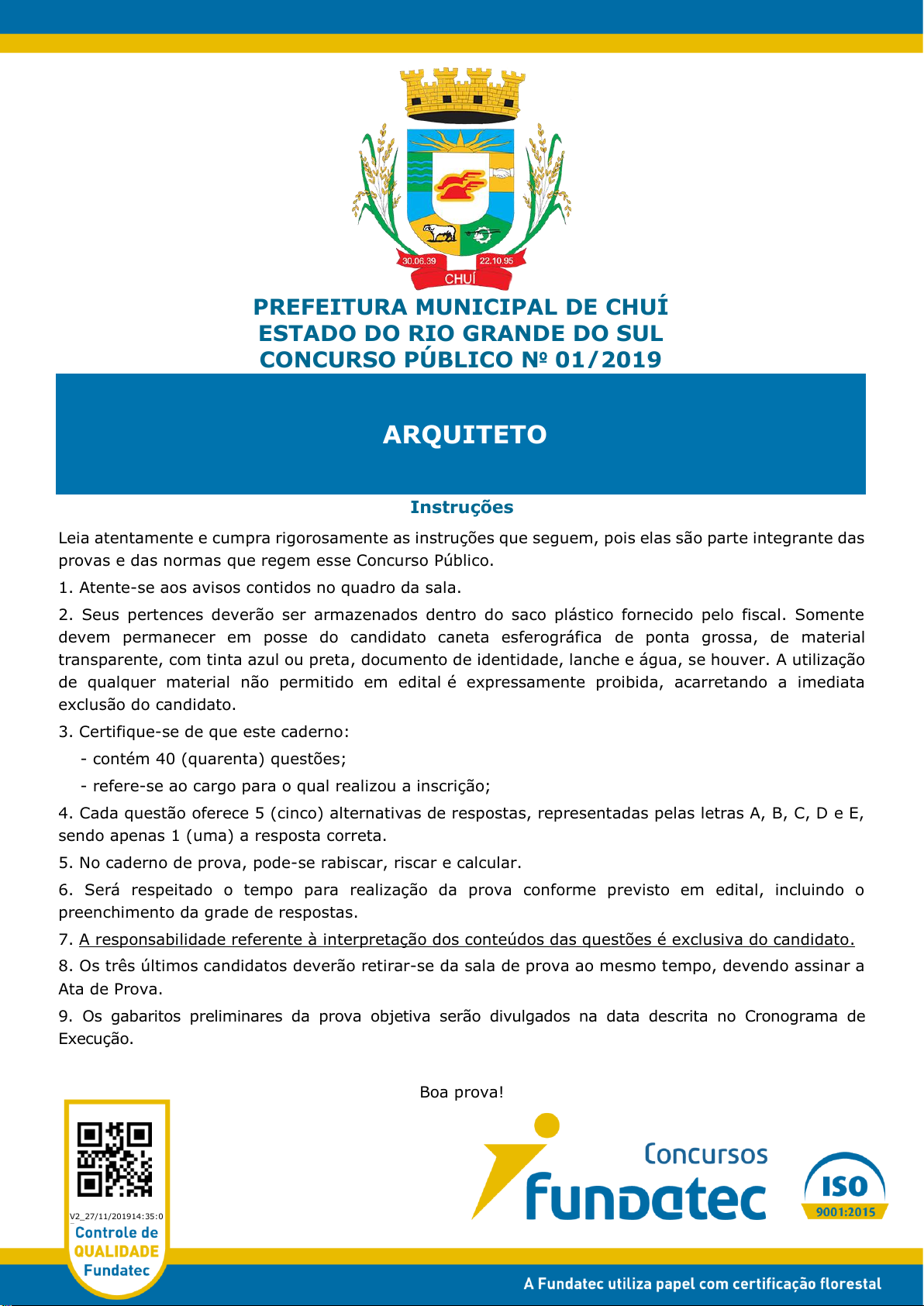 pcimarkpci MjgwNDowMTRkOjU4ODg6NTFhMTo4MGVmOmVjNWM6Y2ZmYzphYWNj:VHVlLCAyMCBKYW4gMjAyNiAwOTowNTo0NiAtMDMwMA== www.pciconcursos.com.br V1_27/11/201914:35:0 7 V2_27/11/201914:35:0 7 PREFEITURA MUNICIPAL DE CHUÍ ESTADO DO RIO GRANDE DO SUL CONCURSO PÚBLICO Nº 01/2019 Instruções Leia atentamente e cumpra rigorosamente as instruções que seguem, pois elas são parte integrante das provas e das normas que regem esse Concurso Público. 1. Atente-se aos avisos contidos no quadro da sala. 2. Seus pertences deverão ser armazenados dentro do saco plástico fornecido pelo fiscal. Somente devem permanecer em posse do candidato caneta esferográfica de ponta grossa, de material transparente, com tinta azul ou preta, documento de identidade, lanche e água, se houver. A utilização de qualquer material não permitido em edital é expressamente proibida, acarretando a imediata exclusão do candidato. 3. Certifique-se de que este caderno: - contém 40 (quarenta) questões; - refere-se ao cargo para o qual realizou a inscrição; 4. Cada questão oferece 5 (cinco) alternativas de respostas, representadas pelas letras A, B, C, D e E, sendo apenas 1 (uma) a resposta correta. 5. No caderno de prova, pode-se rabiscar, riscar e calcular. 6. Será respeitado o tempo para realização da prova conforme previsto em edital, incluindo o preenchimento da grade de respostas. 7. A responsabilidade referente à interpretação dos conteúdos das questões é exclusiva do candidato. 8. Os três últimos candidatos deverão retirar-se da sala de prova ao mesmo tempo, devendo assinar a Ata de Prova. 9. Os gabaritos preliminares da prova objetiva serão divulgados na data descrita no Cronograma de Execução. Boa prova! ARQUITETO pcimarkpci MjgwNDowMTRkOjU4ODg6NTFhMTo4MGVmOmVjNWM6Y2ZmYzphYWNj:VHVlLCAyMCBKYW4gMjAyNiAwOTowNTo0NiAtMDMwMA== www.pciconcursos.com.br 535_BASE_NS_5/12/201909:13:42 Execução: Fundatec NÍVEL SUPERIOR LÍNGUA PORTUGUESA Instrução: As questões de números 01 a 10 referem-se ao texto abaixo. O Vale do Silício vai devorar a educação? 01 02 03 04 05 06 07 08 09 10 11 12 13 14 15 16 17 18 19 20 21 22 23 24 25 26 27 28 29 30 31 32 33 34 35 36 37 38 39 40 41 42 43 44 45 46 47 48 Empresas do Vale do Silício se tornaram, recentemente, alvo de acusações que vão de atentados ____ privacidade e interferência em eleições até sonegação fiscal e práticas monopolistas. Em meio ___ essa moral por vezes torta, os fundadores das gigantes de tecnologia também vêm trabalhando para ditar os rumos da educação global. O New York Times publicou em 2018 uma série de reportagens sobre como as empresas do Vale "empurraram" disciplinas como programação e engenharia para as escolas dos EUA, utilizando para isso discursos conhecidos como "carreiras do futuro" e habilidades das quais não se pode escapar. "Atualize-se ou morra", dizem os gurus do Vale. Aprenda a programar ou fique para trás. Não os culpemos. O fetiche pela tecnologia não é uma invenção nem exclusividade do Vale do Silício. A Marcha para o Oeste – tanto a Americana quanto a Brasileira – têm em comum o mesmo apelo ___ modernidade, o mesmo determinismo tecnológico. A ideia de que a tecnologia – sobretudo a digital – é sinônimo inexorável de progresso é, no mínimo, simplista. Não há nada demais em aprender algo moderno, especialmente se puder abrir portas valiosas na vida. Mas há certas narrativas que não apenas carecem de discussões mais profundas mas também escondem visões nada generosas com escolas e educadores. Veja Steve Jobs, por exemplo. O lendário líder da Apple deixou claro mais de uma vez que se os professores da escola de seus filhos fossem realmente competentes, estariam trabalhando em uma de suas empresas, ganhando altos milhões. Jobs, aliás, referia-se a professores de meia idade como profissionais que perderam o brilho e não deveriam estar mais ensinando. Há inúmeros outros casos. A Alt.School, rede de escolas americana, prometia "capacitar os alunos para um futuro sem limites". Seu fundador e ex-executivo do Google, Max Ventilla, dizia querer "usar a tecnologia para reinventar a educação". Ano passado a Alt.School anunciou o fechamento de duas unidades, alegando – pasmem – que a empresa precisaria utilizar os professores não para dar aulas, mas para o desenvolvimento de novos produtos digitais. A empresa justificou a decisão alegando que as escolas eram, na realidade, laboratórios de testes para produtos de larga escala. Exemplos como esse vêm se tornando comuns. Na cultura da ruptura total – a tão falada "disruption", em inglês – na qual impera a ideia de "mova-se rápido e quebre coisas" (lema informal das empresas do Vale), o que menos se vê são parcerias reais com alunos e educadores. Sobram, porém, coisas quebradas: os próprios governos, pressionados pela ideia de "ficar para trás", muitas vezes, permitem que discursos simplistas se tornem política pública. As tensões do Vale do Silício com a educação, entretanto, vão muito além da falta de parcerias sólidas. Elas envolvem uma imagem distorcida tanto da realidade quanto de si mesmo. Certa vez ouvi de um mestrando em Ciência da Computação da Universidade de Stanford – localizada no coração do Vale – que, no futuro, os livros de História falariam daquela região como uma espécie de Atenas na Antiguidade Clássica, um lugar onde ideias fluem e novos paradigmas são criados para o mundo (Sócrates, perdoa-lhes; eles não sabem o que falam). Episódio semelhante ocorreu num bar em Palo Alto, também no Vale. Ao comentar sobre a violência no entorno das escolas do Rio, e o trauma vivido por alunos, um dos presentes teve um 'estalo' e sugeriu que um app solucionaria a questão. Uma visão no mínimo reducionista para problemas complexos da sociedade. Não faço aqui uma ode contra a tecnologia digital e o setor privado, nem uma defesa de que escolas se fechem ao mundo lá fora. É certo que a esc