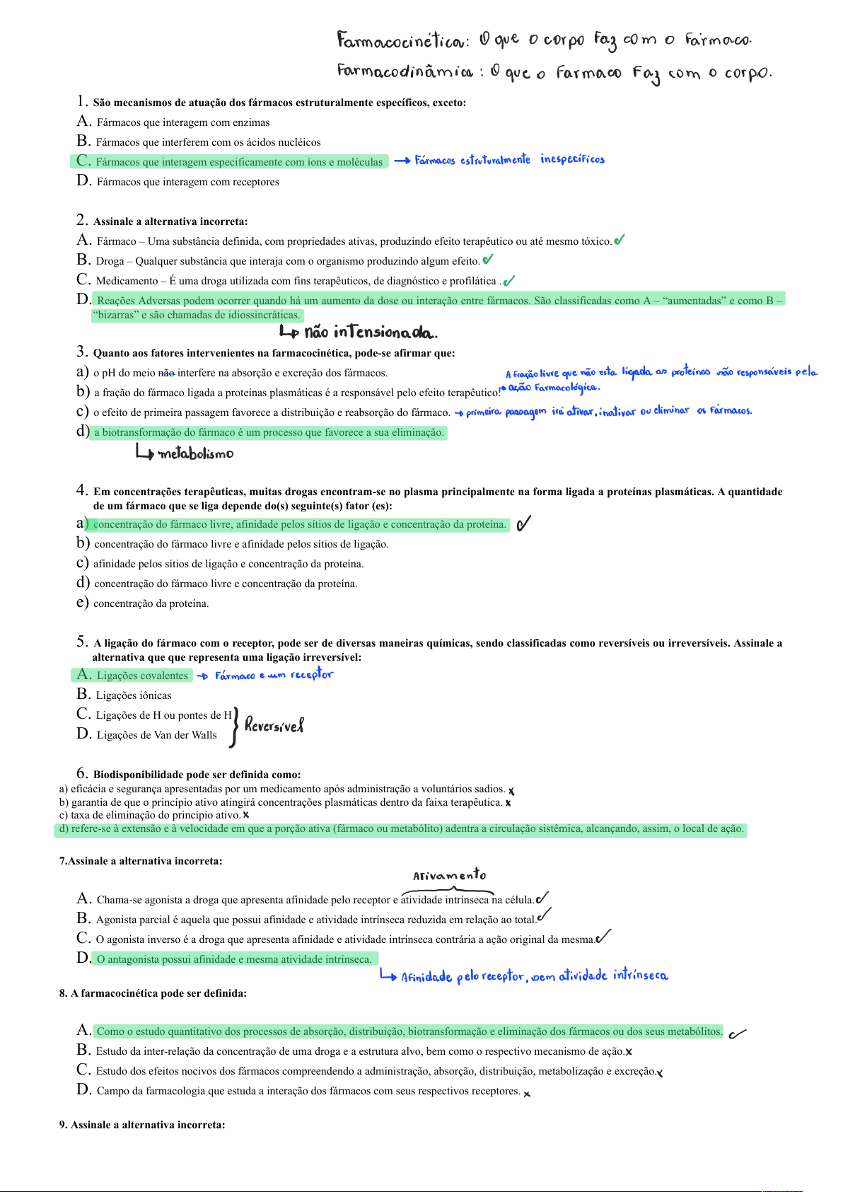 1. São mecanismos de atuação dos fármacos estruturalmente específicos, exceto: A. Fármacos que interagem com enzimas B. Fármacos que interferem com os ácidos nucléicos C. Fármacos que interagem especificamente com íons e moléculas D. Fármacos que interagem com receptores 2. Assinale a alternativa incorreta: A. Fármaco – Uma substância definida, com propriedades ativas, produzindo efeito terapêutico ou até mesmo tóxico. B. Droga – Qualquer substância que interaja com o organismo produzindo algum efeito. C. Medicamento – É uma droga utilizada com fins terapêuticos, de diagnóstico e profilática . D. Reações Adversas podem ocorrer quando há um aumento da dose ou interação entre fármacos. São classificadas como A – “aumentadas” e como B – “bizarras” e são chamadas de idiossincráticas. 3. Quanto aos fatores intervenientes na farmacocinética, pode-se afirmar que: a) o pH do meio não interfere na absorção e excreção dos fármacos. b) a fração do fármaco ligada a proteínas plasmáticas é a responsável pelo efeito terapêutico. c) o efeito de primeira passagem favorece a distribuição e reabsorção do fármaco. d) a biotransformação do fármaco é um processo que favorece a sua eliminação. 4. Em concentrações terapêuticas, muitas drogas encontram-se no plasma principalmente na forma ligada a proteínas plasmáticas. A quantidade de um fármaco que se liga depende do(s) seguinte(s) fator (es): a) concentração do fármaco livre, afinidade pelos sítios de ligação e concentração da proteína. b) concentração do fármaco livre e afinidade pelos sítios de ligação. c) afinidade pelos sítios de ligação e concentração da proteína. d) concentração do fármaco livre e concentração da proteína. e) concentração da proteína. 5. A ligação do fármaco com o receptor, pode ser de diversas maneiras químicas, sendo classificadas como reversíveis ou irreversíveis. Assinale a alternativa que que representa uma ligação irreversível: A. Ligações covalentes B. Ligações iônicas C. Ligações de H ou pontes de H D. Ligações de Van der Walls 6. Biodisponibilidade pode ser definida como: a) eficácia e segurança apresentadas por um medicamento após administração a voluntários sadios. b) garantia de que o princípio ativo atingirá concentrações plasmáticas dentro da faixa terapêutica. c) taxa de eliminação do princípio ativo. d) refere-se à extensão e à velocidade em que a porção ativa (fármaco ou metabólito) adentra a circulação sistêmica, alcançando, assim, o local de ação. 7.Assinale a alternativa incorreta: A. Chama-se agonista a droga que apresenta afinidade pelo receptor e atividade intrínseca na célula. B. Agonista parcial é aquela que possui afinidade e atividade intrínseca reduzida em relação ao total. C. O agonista inverso é a droga que apresenta afinidade e atividade intrínseca contrária a ação original da mesma. D. O antagonista possui afinidade e mesma atividade intrínseca. 8. A farmacocinética pode ser definida: A. Como o estudo quantitativo dos processos de absorção, distribuição, biotransformação e eliminação dos fármacos ou dos seus metabólitos. B. Estudo da inter-relação da concentração de uma droga e a estrutura alvo, bem como o respectivo mecanismo de ação. C. Estudo dos efeitos nocivos dos fármacos compreendendo a administração, absorção, distribuição, metabolização e excreção. D. Campo da farmacologia que estuda a interação dos fármacos com seus respectivos receptores. 9. Assinale a alternativa incorreta: A. A absorção é definida como a passagem de um fármaco de seu local de administração para o plasma. B. Administração sublingual é necessária quando se necessita de uma resposta rápida, uma vez que a região sublingual é extremamente irrigada e conectada aos vasos de bom calibre, especialmente se o fármaco é instável ao pH gástrico ou é metabolizado rapidamente pelo fígado. C. Via de regra cerca de 75% de um fármaco oralmente administrado são absorvidos em 1-3 h. Não sendo obrigatoriamente considerar a motilidade gastrintestinal, o fluxo sanguíneo esplâncnico, o tamanho das partículas, a formulação e fatores físico-químicos. D. A injeção endovenosa é a via mais rápida e mais precisa para administração de um fármaco. A concentração máxima eficaz que chega aos tecidos depende fundamentalmente da rapidez da injeção. Na administração endovenosa não ocorre absorção, apenas distribuição 10. A afirmação a seguir ‘’drogas ácidas são crescentemente ionizadas com o aumento do pH, ou seja, em locais básicos; enquanto as drogas básicas tornam-se crescentemente ionizadas com a diminuição do pH, em locais ácidos’’ Significa dizer que: A. Drogas ácidas são melhores absorvidas em pH básicos, ao passo que drogas básicas são melhores absorvidas em pH ácidos. B. Drogas ácidas são melhores absorvidas em pH ácidos, ao passo que drogas básicas são melhores absorvidas em pH neutros. C. Drogas ácidas são melhores absorvidas em pH neutros, ao passo que drogas básicas são melhores absorvidas em pH básicos. D. Drogas ácidas são melhores absorvidas em pH ácidos, ao passo que drogas básicas são melhores absorvidas em pH básicos. 11.Indique a alternativa de sistema de transporte que os fármacos não utilizam para atravessar as membranas celulares: a) difusão passiva b) transporte ativo ou passivo c) através de proteínas transportadoras d) através da ligação com carboidratos da membrana e) através de canais iônicos 12.Em certa ocasião administrou-se uma elevada concentração de um fármaco X (parcial), na qual o mesmo não desencadeou a resposta tecidual máxima, sendo assim administrou-se um fármaco Y que atingiu a resposta tecidual máxima (total), porém a dose oferecida chegou ao limiar de toxicidade sendo necessário reverter esta situação com um fármac