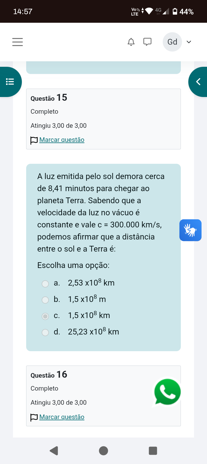 14:57 4G LTE ++ 44% Gd Questão 15 Completo Atingiu 3,00 de 3,00 Marcar questão A luz emitida pelo sol demora cerca de 8,41 minutos para chegar ao planeta Terra. Sabendo que a velocidade da luz no vácuo é constante e vale = 300.000 km/s, podemos afirmar que a distância entre o sol e a Terra é: Escolha uma opção: a. 2,53 km b. 1,5 m 1,5 km d. 25,23 km Questão 16 Completo Atingiu 3,00 de 3,00 Marcar questão