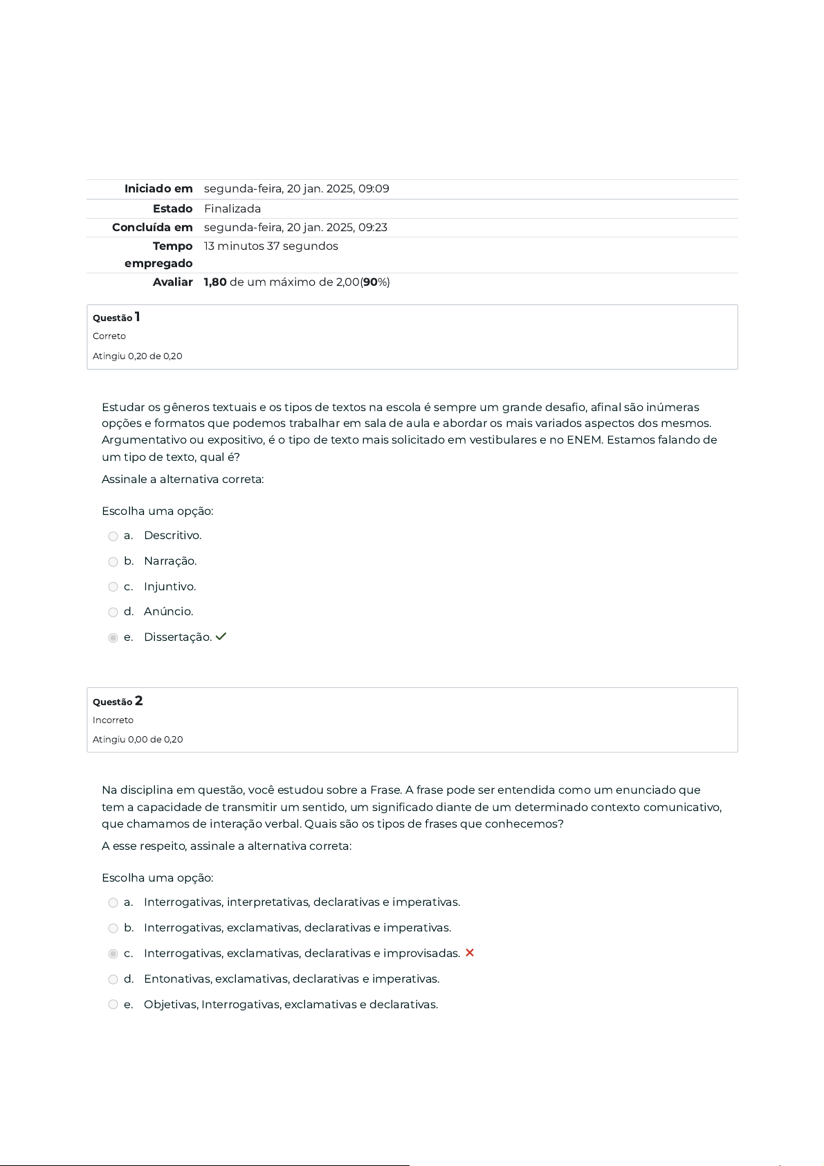 Iniciado em segunda-feira, 20 jan. 2025, 09:09 Estado Finalizada Concluída em segunda-feira, 20 jan. 2025, 09:23 Tempo empregado 13 minutos 37 segundos Avaliar 1,80 de um máximo de 2,00(90%) Questão 1 Correto Atingiu 0,20 de 0,20 Questão 2 Incorreto Atingiu 0,00 de 0,20 Estudar os gêneros textuais e os tipos de textos na escola é sempre um grande desa�o, a�nal são inúmeras opções e formatos que podemos trabalhar em sala de aula e abordar os mais variados aspectos dos mesmos. Argumentativo ou expositivo, é o tipo de texto mais solicitado em vestibulares e no ENEM. Estamos falando de um tipo de texto, qual é? Assinale a alternativa correta: Escolha uma opção: a. Descritivo. b. Narração. c. Injuntivo. d. Anúncio. e. Dissertação. ✓ Na disciplina em questão, você estudou sobre a Frase. A frase pode ser entendida como um enunciado que tem a capacidade de transmitir um sentido, um signi�cado diante de um determinado contexto comunicativo, que chamamos de interação verbal. Quais são os tipos de frases que conhecemos? A esse respeito, assinale a alternativa correta: Escolha uma opção: a. Interrogativas, interpretativas, declarativas e imperativas. b. Interrogativas, exclamativas, declarativas e imperativas. c. Interrogativas, exclamativas, declarativas e improvisadas. × d. Entonativas, exclamativas, declarativas e imperativas. e. Objetivas, Interrogativas, exclamativas e declarativas. Questão 3 Correto Atingiu 0,20 de 0,20 Questão 4 Correto Atingiu 0,20 de 0,20 Conforme informações disponibilizadas no seu material de estudo, tipos e gêneros textuais são duas categorias diferentes de classi�cação textual. Os tipos textuais são modelos abrangentes e �xos que de�nem e distinguem a estrutura e os aspectos linguísticos. Quais são os tipos de texto que temos em Língua Portuguesa? A esse respeito, assinale a alternativa correta: Escolha uma opção: a. Narração, Descrição, Dissertação e Cartaz. b. Narração, Descrição, Anúncio e Injuntivo. c. Narração, Fábula, Dissertação e Injuntivo. d. Biogra�a, Descrição, Dissertação e Injuntivo. e. Narração, Descrição, Dissertação e Injuntivo. ✓ Temos comunicação em todos os lugares, seja através de publicidades expostas nas ruas, nos smartphones, na internet de modo geral, na tv, en�m, respiramos comunicação, mas como podemos de�nir o conceito de comunicação? Diante disso, marque a alternativa correta: Escolha uma opção: a. Todo o processo em que há troca de informações entre duas ou mais pessoas. ✓ b. Todo o processo em que há troca de informações entre três pessoas. c. Todo o processo em que há informação apenas escrita. d. Todo o processo em que há recebimento de informações entre duas ou mais pessoas. e. Todo o processo em que há informação visual e escrita. Questão 5 Correto Atingiu 0,20 de 0,20 Questão 6 Correto Atingiu 0,20 de 0,20 Questão 7 Correto Atingiu 0,20 de 0,20 Na disciplina em questão, você estudou sobre Coesão, Coerência, Denotação, Conotação, Intertextualidade, Ambiguidade. Em “O Rei do futebol será homenageado na próxima semana”, temos aqui um exemplo de: Diante disso, assinale a alternativa correta: Escolha uma opção: a. Solecismo. b. Intertextualidade. ✓ c. Pleonasmo. d. Ambiguidade. e. Barbarismo. Com um mediador sempre à frente, o debate possui temática especí�ca e tem o objetivo de expor um assunto de interesse coletivo. Estamos falando de um tipo especí�co de debate, qual? Assinale a alternativa correta: Escolha uma opção: a. Debate regrado. ✓ b. Debate acadêmico. c. Debate oral. d. Debate temático. e. Debate político. É o momento de apresentar o tema escolhido, aqui as ideias centrais serão apresentadas de forma sutil, sem muito aprofundamento, porém é preciso deixar bem claro o que se pretende tratar no texto como um todo. Estamos nos referindo a qual parte do texto cientí�co? Sabendo disso, assinale a alternativa correta: Escolha uma opção: a. Introdução. ✓ b. Desenvolvimento. c. Anexos. d. Conclusão. e. Apêndice. Questão 8 Correto Atingiu 0,20 de 0,20 Questão 9 Correto Atingiu 0,20 de 0,20 Questão 10 Correto Atingiu 0,20 de 0,20 Os textos acadêmicos possuem características especí�cas e que devem ser seguidos à risca, mas é bom lembrar que a estrutura organizacional deles está baseada em três partes. Quais são elas? Assinale a alternativa correta: Escolha uma opção: a. Apêndices, anexos e conclusão. b. Resumo, desenvolvimento e conclusão. c. Introdução, desenvolvimento e relatórios. d. Introdução, anexos e conclusão. e. Introdução, desenvolvimento e conclusão. ✓ No �nal da década de 1960 um linguista russo chegou ao Brasil e começou seu contato com a Língua Portuguesa. Roman Jakobson deixou um legado importantíssimo de estudos e é considerado um dos mais importantes nomes da linguística do século XX. Qual elemento do processo comunicativo, estabelecido por Jakobson, faz referência direta com a função emotiva da linguagem? Sobre isso, assinale a alternativa correta: Escolha uma opção: a. Receptor. b. Mensagem. c. Código. d. Emissor. ✓ e. Canal. Os períodos se caracterizam por ser uma unidade sintática com uma ou mais orações com sentido completo. Ele se subdivide de duas maneiras, quais são elas? Assinale a alternativa correta: Escolha uma opção: a. Período simples e composto. ✓ b. Período objetivo e subjetivo. c. Período simples e agregado. d. Período composto e subordinado. e. Período coordenado e subordinado.