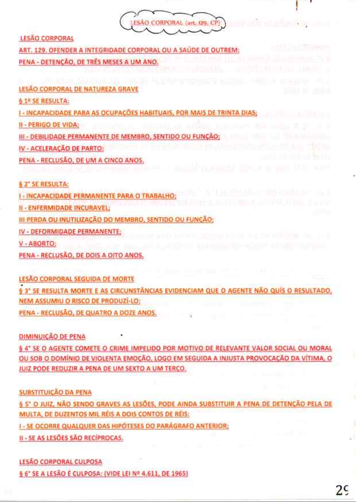 ESÃO CORPORAL CP) LESÃO CORPORAL ART. OFENDER A INTEGRIDADE CORPORAL OU A SAÚDE DE OUTREM: PENA DETENÇÃO, DE TRÊS MESES A UM ANO. LESÃO CORPORAL DE NATUREZA GRAVE 1º SE RESULTA: INCAPACIDADE PARA AS OCUPAÇÕES HABITUAIS, POR MAIS DE TRINTA DIAS; PERIGO DE VIDA; III DEBILIDADE PERMANENTE DE MEMBRO, SENTIDO OU FUNÇÃO; IV ACELERAÇÃO DE PARTO: PENA RECLUSÃO, DE UM A CINCO SE RESULTA: INCAPACIDADE PERMANENTE PARA ENFERMIDADE III PERDA INUTILIZAÇÃO DO MEMBRO, SENTIDO IV DEFORMIDADE PERMANENTE: V ABORTO: PENA RECLUSÃO, DE DOIS A OITO ANOS. LESÃO CORPORAL SEGUIDA DE MORTE 3" SE RESULTA MORTE E AS CIRCUNSTÂNCIAS EVIDENCIAM QUE o AGENTE NÃO QUÍS o RESULTADO, NEM ASSUMIU RISCO DE PENA RECLUSÃO, DE QUATRO A DOZE ANOS. DIMINUIÇÃO DE PENA 4" SE AGENTE COMETE CRIME IMPELIDO POR MOTIVO DE RELEVANTE VALOR SOCIAL MORAL OU SOB o DOMÍNIO DE VIOLENTA EMOÇÃO, LOGO EM SEGUIDA A INJUSTA PROVOCAÇÃO DA VÍTIMA, JUIZ PODE REDUZIR A PENA DE UM SEXTO A UM TERÇO. SUBSTITUIÇÃO DA PENA § o JUIZ, NÃO SENDO GRAVES AS LESÕES, PODE AINDA SUBSTITUIR A PENA DE DETENÇÃO PELA DE MULTA, DE DUZENTOS MIL RÉIS A DOIS CONTOS DE RÉIS: I SE OCORRE QUALQUER DAS HIPÓTESES DO PARÁGRAFO ANTERIOR; SE AS LESÕES SÃO LESÃO CORPORAL CULPOSA § SE A LESÃO É CULPOSA: (VIDE LEI 4.611, DE 1965) 29PENA DETENÇÃO, DE DOIS MESES A UM ANO. AUMENTO DE PENA AUMENTA-SE A PENA DE 1/3 (UM TERÇO) SE OCORRER QUALQUER DAS HIPÓTESES DOS 4° E 6° DO ART. 121 DESTE CÓDIGO. (REDAÇÃO DADA PELA LEI 12.720, DE 2012) APLICA-SE À LESÃO CULPOSA o DISPOSTO NO DO ART. (REDAÇÃO DADA PELA LEI 8.069, DE 1990) VIOLÊNCIA DOMÉSTICA (INCLUÍDO PELA LEI 10.886, DE 2004) § 9° SE A LESÃO FOR PRATICADA CONTRA ASCENDENTE, DESCENDENTE, IRMÃO, CÔNJUGE OU COMPANHEIRO, OU COM QUEM CONVIVA OU TENHA CONVIVIDO, OU, AINDA, PREVALECENDO-SE AGENTE DAS RELAÇÕES DOMÉSTICAS, DE COABITAÇÃO OU DE HOSPITALIDADE: (REDAÇÃO DADA PELA LEI 11.340, DE 2006) PENA DETENÇÃO, DE 3 (TRÊS) MESES A 3 (TRÊS) ANOS. (REDAÇÃO DADA PELA LEI 11.340, DE 2006) 10. NOS CASOS PREVISTOS NOS 1° A 3° DESTE ARTIGO, SE AS CIRCUNSTÂNCIAS SÃO AS INDICADAS NO DESTE ARTIGO, AUMENTA-SE A PENA EM 1/3 (UM TERCO). (INCLUÍDO PELA LEI 10.886, DE 2004) § 11. NA HIPÓTESE DO 9° DESTE ARTIGO, A PENA SERÁ AUMENTADA DE UM TERÇO SE CRIME FOR COMETIDO CONTRA PESSOA PORTADORA DE DEFICIÊNCIA. (INCLUÍDO PELA LEI 11.340, DE 2006) Bem Incolumidade pessoal do que abrange as suas saúdes física, fisiológica e mental Saúde aspecto corporal Saúde fisiológica proteção do funcionamento do corpo Saúde mental capacidades psicológicas da pessoa humana Topografia caput: LC dolosa leve LC dolosa grave (também admite preterdolo em algumas hipóteses) LC dolosa gravissima (também admite o preterdolo em algumas hipóteses) seguida de morte (homicídio preterdoloso) LC LC privilegiada LC culposa (leve, grave ou gravissima) LC majorada Perdão judicial (só para 10 e 11: LC e Violência doméstica e familiar (vitima: homem ou mulher) 30A integridade por mais que alguns pensem em contrário, um bem jurídico disponível, conforme análise do art lei 9099/95, que estabelece a natureza da ação penal da lesão corporal leve, qual seja, pública condicionada à representação É consenso que a integridade física se trata de um bem relativamente desde que não contrarie a moral e os bans costumes Exemplos: piercing, tatuagem, Caso do sadomasoquismo Há consentimento. Alguns autores clássicos defendem que Direito não pode compacturar, como dito, com atos que ofendam a moral e os bons costumes, mas não há consenso Como se sabe, o Direito Penal não pune autolesão, considerando-a fato Todavia, ela pode ser utilizada como meio para o cometimento de outros crimes, como a fraude para recebeimento de indenização valor de seguro (art. 171, V) Bittencourt: E se agente convence um inimputável a se causar uma lesão? o agente se aproveitou da incapacidade para que incapaz se ferisse, utilizando-a como Desta forma, agente responde como autor mediato do crime de lesão corporal, enquanto o incapaz é a vitima. A conduta do art. 129 provocar lesão coporal, que dano (ou ofensa, interno ou externo, à normalidade funcional do corpo humano, do pontos de vista (forma e fisológico (funções vitais) ou mental, provocando a lesão ou agravando uma que já existia anteriormente. A dispensável para a caracterização do crime do art. 129 Um desmaio, por exemplo, não causa dor, mas afeta a incolumidade na esfera mental Equimoses (manchas escuras ou azuladas fruto de infiltração difusa de sangue no tecido subcutâneo) e Hematomas (acumulo de sangue em um orgao ou normalmente causado por traumatismo) configuram lesão corporal? Sim, configuram Eritemas (manchas de cor avermelhada causadas pela dilatação de vasos sanguíneos) configuram lesão corporal? Não Ocorrem, quando a pessoa fica envergonhada Sem lesão, portanto, não há crime do art. 129 Por um corte de cabelo sem autorização, seria lesão corporal? corrente: desde que a ação provoque uma alteração desfavorável no aspecto exterior do corrente: NÃO, configura injúria real (art. 140, CP), uma vez que corte sem autorização busca humilhar a vítima corrente: A depender do do agente, tanto pode configurar crime do art. 129 quanto do art. 140, (PARECE SER A MAIS CORRETA) corrente (mais esdrúxula): seria furto pois o cabelo tem interesse seria furto, mas sim roubo, uma vez que houve Pode ser enquadrado como a contravenção de de fato (art. 21, Lei de Contravenções Penais) Nas vias de fato, não animus 31Se houver a intenção de lesionar mas agente não obtiver trata-se de tentativa de lesão Portanto, perfeitamente possivel a tentativa, sem lesão DU com diversa da pretendida. Entretanto, ha alguns casos que não admitem tentativa (Art. 129, art. 129, V e art. 129, pois respeito a modalidades culposas Em razão disto, admite- se Principio da em se tratando do crime de lesão corporal. Pode não parecer muit