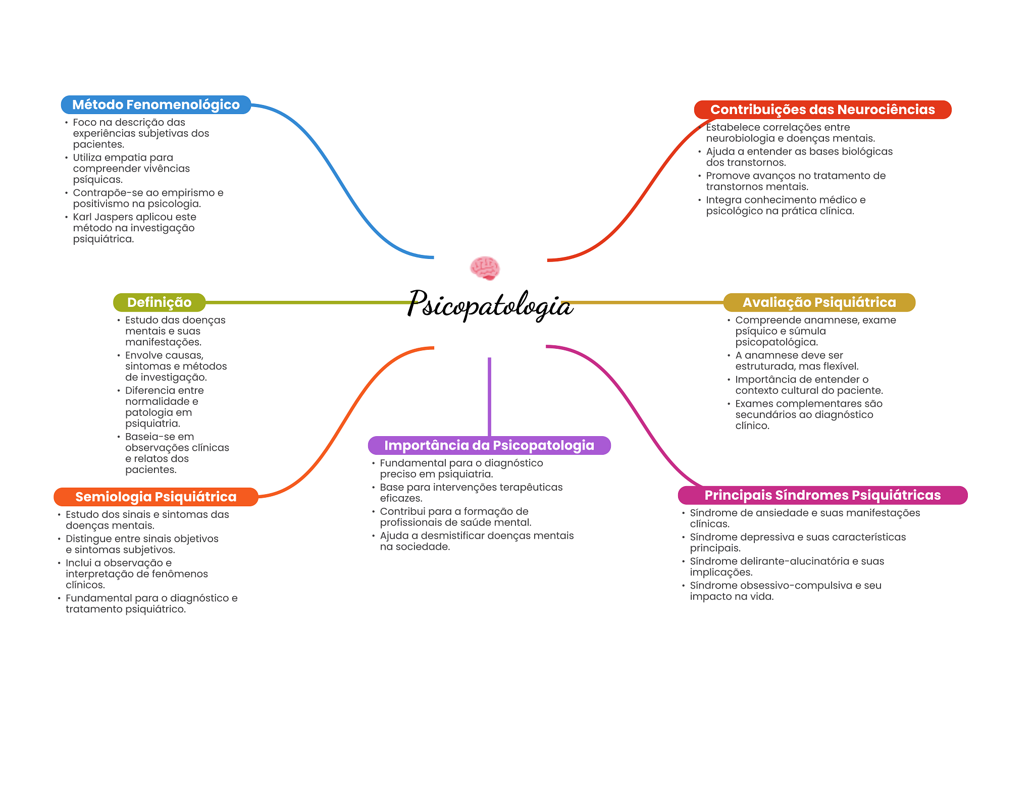 Método Fenomenológico Contribuições das Neurociências Foco na descrição das Estabelece correlações entre experiências subjetivas dos neurobiologia e doenças mentais. pacientes. Utiliza empatia para Ajuda a entender as bases biológicas dos transtornos. compreender vivências psíquicas. Promove avanços no tratamento de transtornos mentais. Contrapõe-se ao empirismo e positivismo na psicologia. Integra conhecimento médico e Karl Jaspers aplicou este psicológico na prática clínica. método na investigação psiquiátrica. Definição Psicopatologia Avaliação Psiquiátrica Estudo das doenças Compreende anamnese, exame mentais e suas psíquico e súmula manifestações. psicopatológica. Envolve causas, A anamnese deve ser sintomas e métodos estruturada, mas flexível. de investigação. Importância de entender O Diferencia entre contexto cultural do paciente. normalidade e Exames complementares são patologia em secundários ao diagnóstico psiquiatria. clínico. Baseia-se em observações clínicas Importância da Psicopatologia e relatos dos Fundamental para diagnóstico pacientes. preciso em psiquiatria. Base para intervenções terapêuticas Semiologia Psiquiátrica eficazes. Principais Síndromes Psiquiátricas Estudo dos sinais e sintomas das Contribui para a formação de Síndrome de ansiedade e suas manifestações doenças mentais. profissionais de saúde mental. clínicas. Distingue entre sinais objetivos Ajuda a desmistificar doenças mentais Síndrome depressiva e suas características e sintomas subjetivos. na sociedade. principais. Inclui a observação e Síndrome delirante-alucinatóric e suas interpretação de fenômenos implicações. clínicos. Síndrome obsessivo-compulsiva e seu Fundamental para diagnóstico e impacto na vida. tratamento psiquiátrico.
