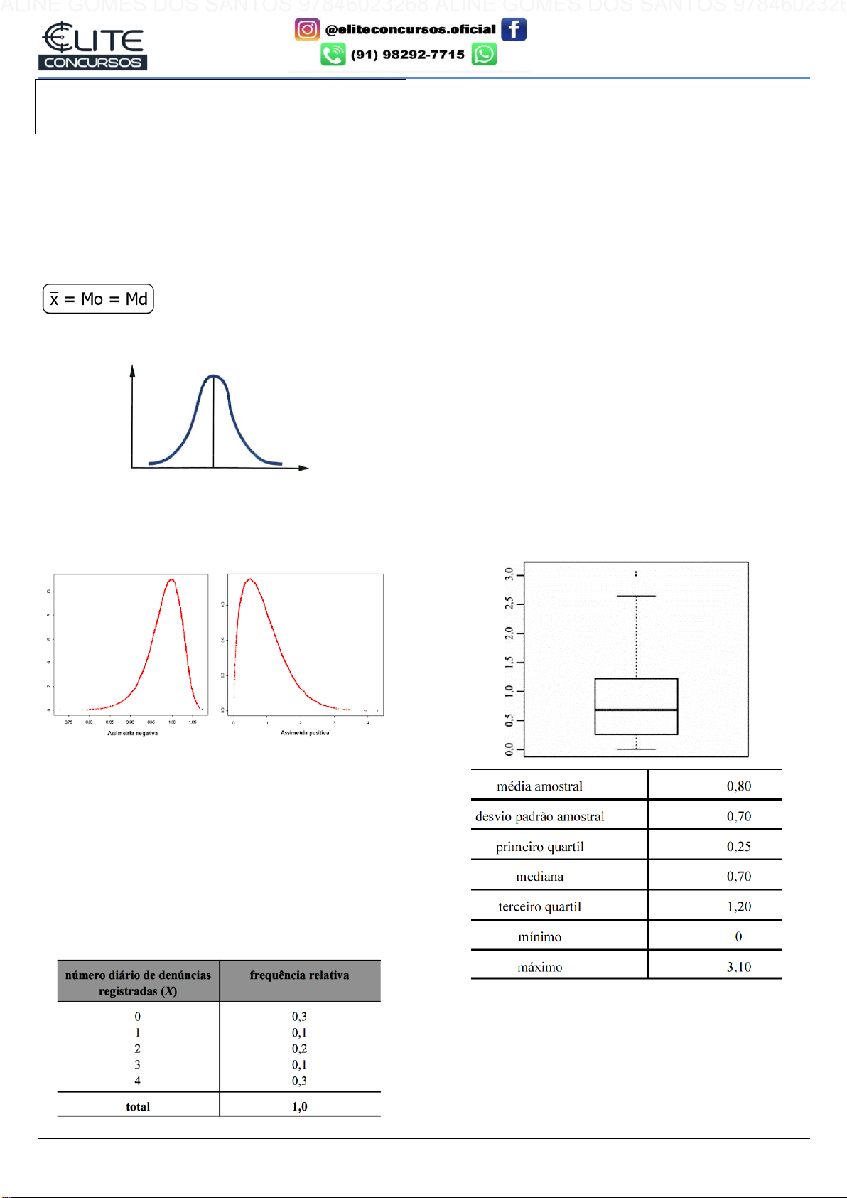 1 Elite Concursos Sua mudança de vida começa AQUI !!! PC/PA ESCRIVÃO Escrivão / PC PA Estatística Data: 20/12/2022 Prof.: Yves Barradas Aula 06 ASSIMETRIA E CURTOSE ASSIMETRIA Podemos prever o nível de simetria/assimetria de um gráfico a partir dos valores da média, moda e mediana. Quando estivermos diante de um gráfico totalmente simétrico, teremos que: Este comportamento pode ser traduzido no gráfico abaixo: https://www.slideshare.net/ranilsonpaiva/estatistica Quando estivermos diante de um gráfico assimétrico, teremos dois casos, ou o gráfico é assimétrico à direita (assimetria positiva), ou ele é assimétrico à esquerda (assimetria negativa), conforme figura abaixo: http://www.portalaction.com.br/estatistica Exercícios 01) (AOCP – EBSERH – 2015) Dizemos que um histograma assume forma assimétrica positiva em A) Moda = Mediana = Média B) Média > Mediana > Variância C) Moda Mediana > Média E) Moda mediana>média, e a distribuição é assimétrica à direita. D) moda>mediana>média, e a distribuição é assimétrica à esquerda. E) moda=mediana=média, e a distribuição é simétrica. Um indicador de desempenho X permite avaliar a qualidade dos processos de governança de instituições públicas. A figura mostra, esquematicamente, a sua distribuição, obtida mediante estudo amostral feito por determinada agência de pesquisa. A tabela apresenta estatísticas descritivas referentes a essa distribuição. Com base nessas informações, julgue o item a seguir. ALINE GOMES DOS SANTOS 97846023268 ALINE GOMES DOS SANTOS 97846023268 ALINE GOMES DOS SANTOS 97846023268 ALINE GOMES DOS SANTOS 97846023268 ALINE GOMES DOS SANTOS 97846023268 ALINE GOMES DOS SANTOS 97846023268 ALINE GOMES DOS SANTOS 97846023268 ALINE GOMES DOS SANTOS 97846023268 ALINE GOMES DOS SANTOS 97846023268 ALINE GOMES DOS SANTOS 97846023268 2 Elite Concursos Sua mudança de vida começa AQUI !!! PC/PA ESCRIVÃO 04) (CESPE – TCE PA – 2016 - Adaptada) A distribuição do indicador X apresenta assimetria positiva (ou à direita). Certo ( ) Errado ( ) Considerando os dados da tabela mostrada, que apresenta a distribuição populacional da quantidade diária de incidentes (N) em determinada penitenciária, julgue o iteM que se segue. 05) (CESPE – DEPEN – 2015) A distribuição de N não é simétrica em torno da média, apesar de a média e amediana serem iguais. Certo ( ) Errado ( ) CURTOSE É o grau de achatamento ou afilamento de uma distribuição em com paração com a sua curva normal. Podemos tomar como base uma curva normal, como a que está representada abaixo: https://www.slideshare.net/ranilsonpaiva/estatistica Neste caso, estamos diante de uma que não apresenta achatamentos ou deformidades. Esta é a curva chamada de mesocúrtica (curtose do meio). http://www.portalaction.com.br/estatistica Quando comparamos os graus de achatamento das curvas em relação a normal, temos a curva platicúrtica (mais achatada em relação à normal) e a leptocúrtica (menos achatada, mais afilada em relação à normal). Para descobrir se estamos diante de uma curva com alto grau de achatamento ou baixo grau, podemos calcular o coeficiente percentílico de curtose, dado pela expressão: O valor de referência para a curva normal (mesocúrtica) é de 0,263. Caso o coeficiente seja menor que 0,263, estamos diante da curva leptocúrtica e, por fim, se o valor do coeficiente percentílico for menos que 0,263, estaremos diante da curva platicúrtica. Exercícios 06) (Instituto AOCP 2018/ADAF) Uma distribuição apresentou as seguintes medidas: 𝑸𝟏 = 𝟐𝟒,𝟒 𝒄𝒎, 𝑸𝟑 = 𝟒𝟏,𝟐 𝒄𝒎 𝑷𝟏𝟎 = 𝟐𝟎,𝟐 𝒄𝒎, 𝑷𝟗𝟎 = 𝟒𝟗,𝟓 𝒄𝒎 Com tais medidas, a curtose é 𝒓𝟏 = 𝟎,𝟐𝟖𝟔𝟔𝟖𝟗 e a curva é A) leptocúrtica. B) platicúrtica. C) mesocúrtica. D) assimétrica. E) simétrica. Felipe M. Monteiro, Gabriela R. Cardoso e Rafael da Silva. A seletividade do sistema prisional brasileiro e as políticas de segurança pública. In: XV Congresso Brasileiro de Sociologia, 26 a 29 de julho de 2011, Curitiba (PR). Grupo de Trabalho – Violência e Sociedade (com adaptações). A tabela precedente apresenta a distribuição percentual de presos no Brasil por faixa etária em 2010, segundo levantamento feito por Monteiro et al. (2011), indicando que a população prisional brasileira nesse ano era predominantemente jovem. Com base nos dados dessa tabela, julgue o item a seguir. 07) (CESPE – DEPEN – 2015) A curtose é uma medida de variação que representa a semiamplitude de uma distribuição de dados e, por isso, seu valor na distribuição percentual de presos no Brasil em 2010 foi igual a 21 anos. Certo ( ) Errado ( ) ALINE GOMES DOS SANTOS 97846023268 ALINE GOMES DOS SANTOS 97846023268 ALINE GOMES DOS SANTOS 97846023268 ALINE GOMES DOS SANTOS 97846023268 ALINE GOMES DOS SANTOS 97846023268 ALINE GOMES DOS SANTOS 97846023268 ALINE GOMES DOS SANTOS 97846023268 ALINE GOMES DOS SANTOS 97846023268 ALINE GOMES DOS SANTOS 97846023268 ALINE GOMES DOS SANTOS 97846023268 3 Elite Concursos Sua mudança de vida começa AQUI !!! PC/PA ESCRIVÃO MEDIDAS DE DISPERSÃO 1. Desvio Médio ou Desvio Absoluto Médio (DM): Podemos dizer que Desvio Absoluto Médio é o somatório dos módulos dos desvios em relação a média. Esta é uma medida de dispersão bem mais robusta do que a Amplitude Total, por exemplo, pois ela leva em consideração todos os valores de um conjunto de dados. Exercícios 08) (CESPE 2004 – ANATEL – Adaptada por YB) A tabela acima mostra os números mensais de reclamações (N) feitas por usuários de telefonia fixa, registradas em uma central de atendimento, entre os meses de fevereiro a novembro de 2003. Considerando esses dados, marque a alternativa correta. meses FEV MAR ABR MAI JUN JUL AGO SET OUT NOV N 100 70 70 60 50 100 50 50 30 20 A) No período de fevereiro a novembro de 2003, o número médio mensal de reclamaç